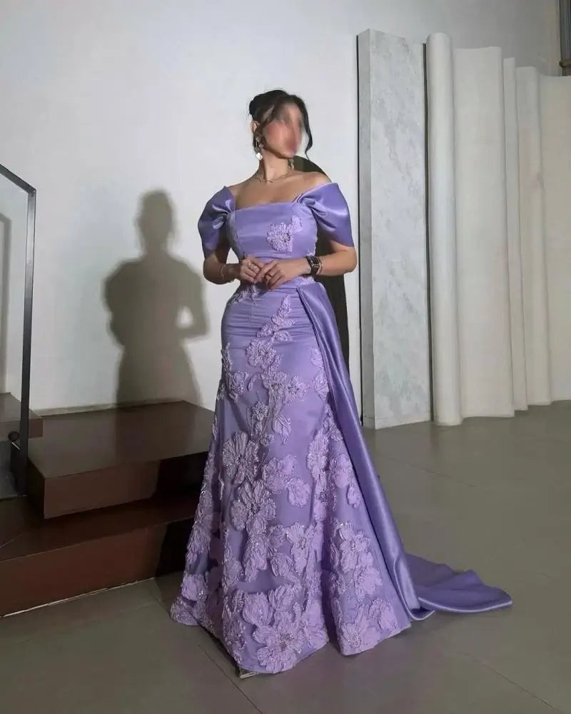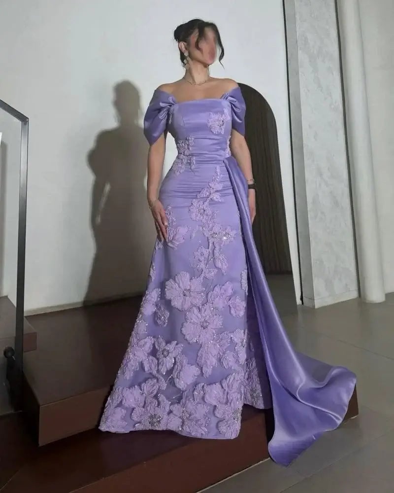 فستان سهرة أنيق بلون الموف ملكي، يتميز بقماش ساتان فاخر مزين بتطريز لامع على كامل الجزء السفلي، يضفي لمعة ناعمة تحت الإضاءة.