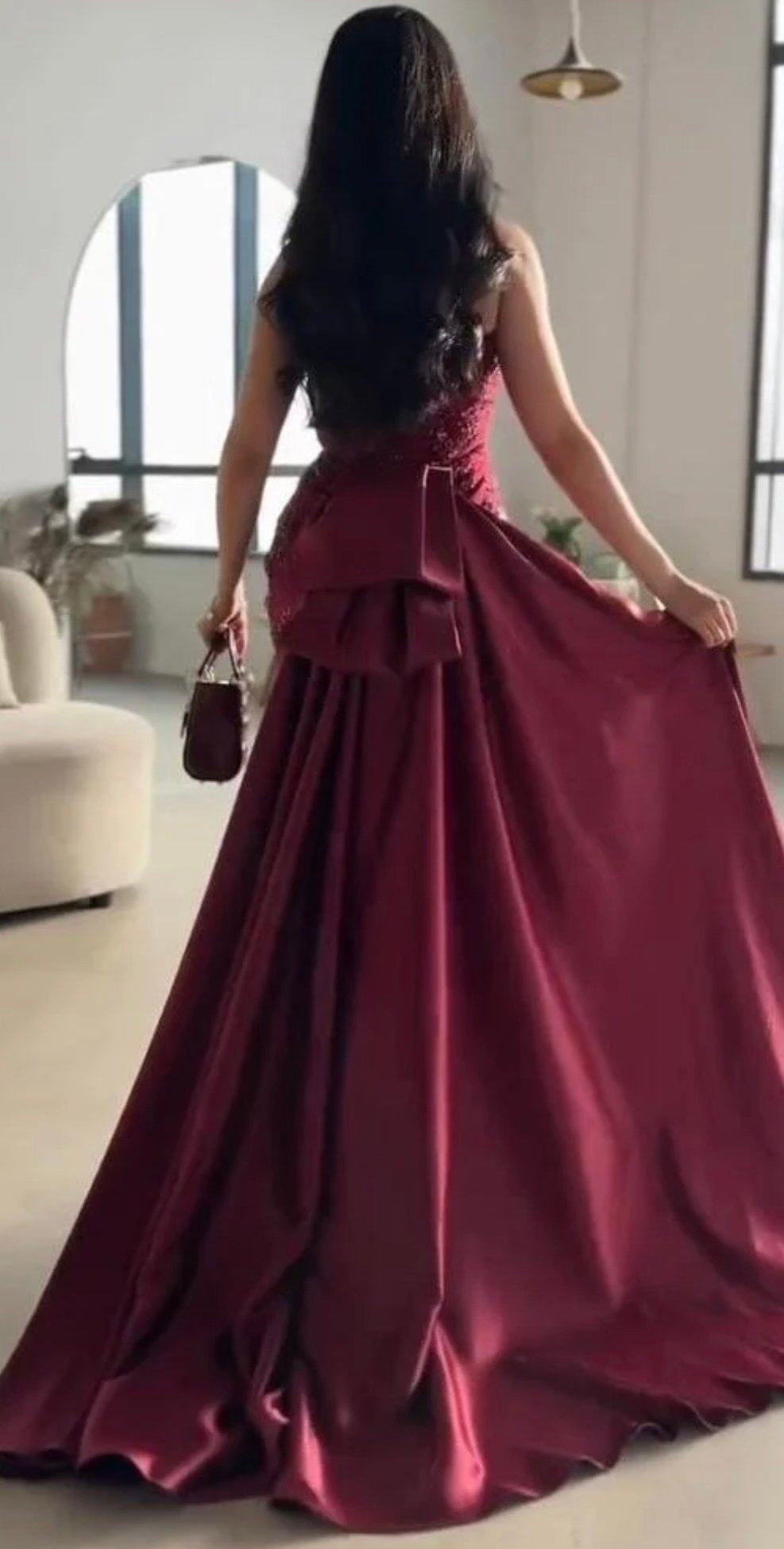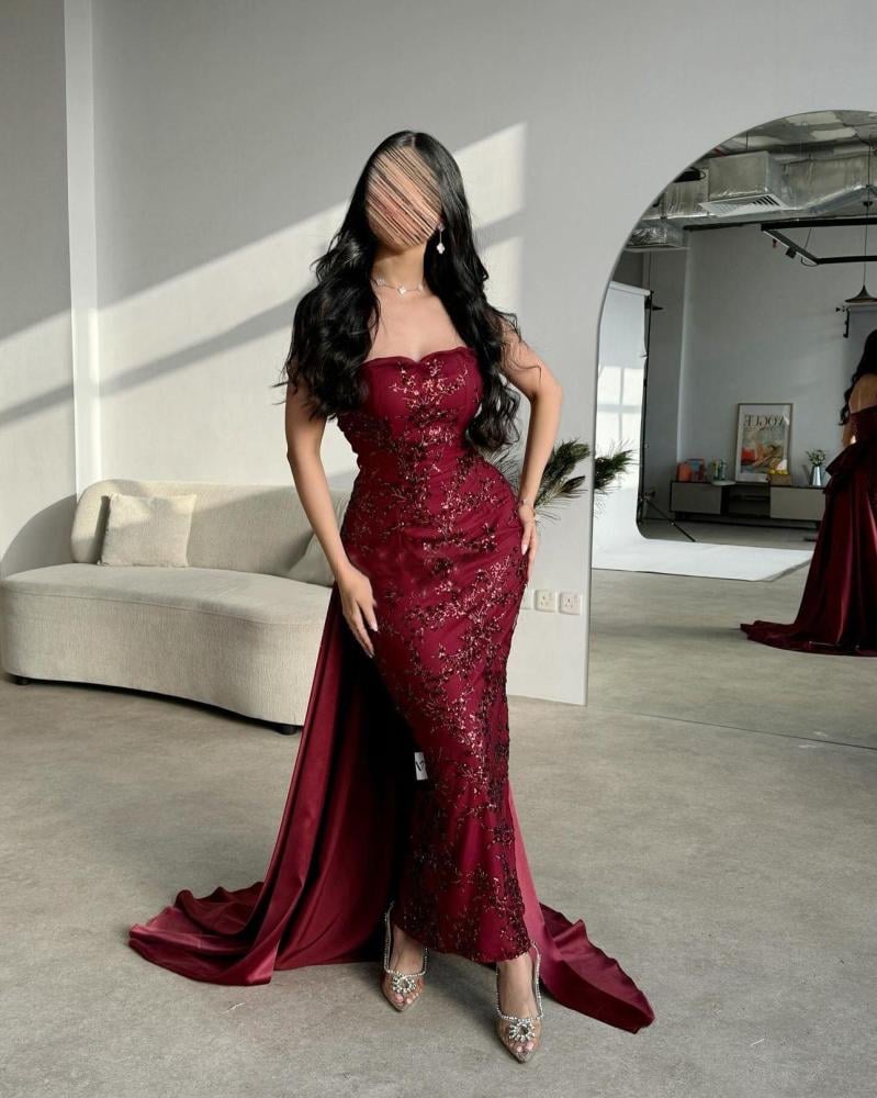 هذا الفستان العنابي الأنيق يجمع بين الجاذبية والتميز في تصميم يخطف الأنظار. يتميز بقصة ضيقة تبرز جمال القوام مع تطريز فاخر من الخرز اللامع والترتر المتناثر على طول القماش، مما يمنحه بريقًا ساحرًا تحت الأضواء. الجزء العلوي مكشوف الكتفين بتصميم راقٍ يعكس أنوثة وجاذبية، فيما يضفي الذيل الخلفي الطويل لمسة ملكية تضاعف الفخامة.