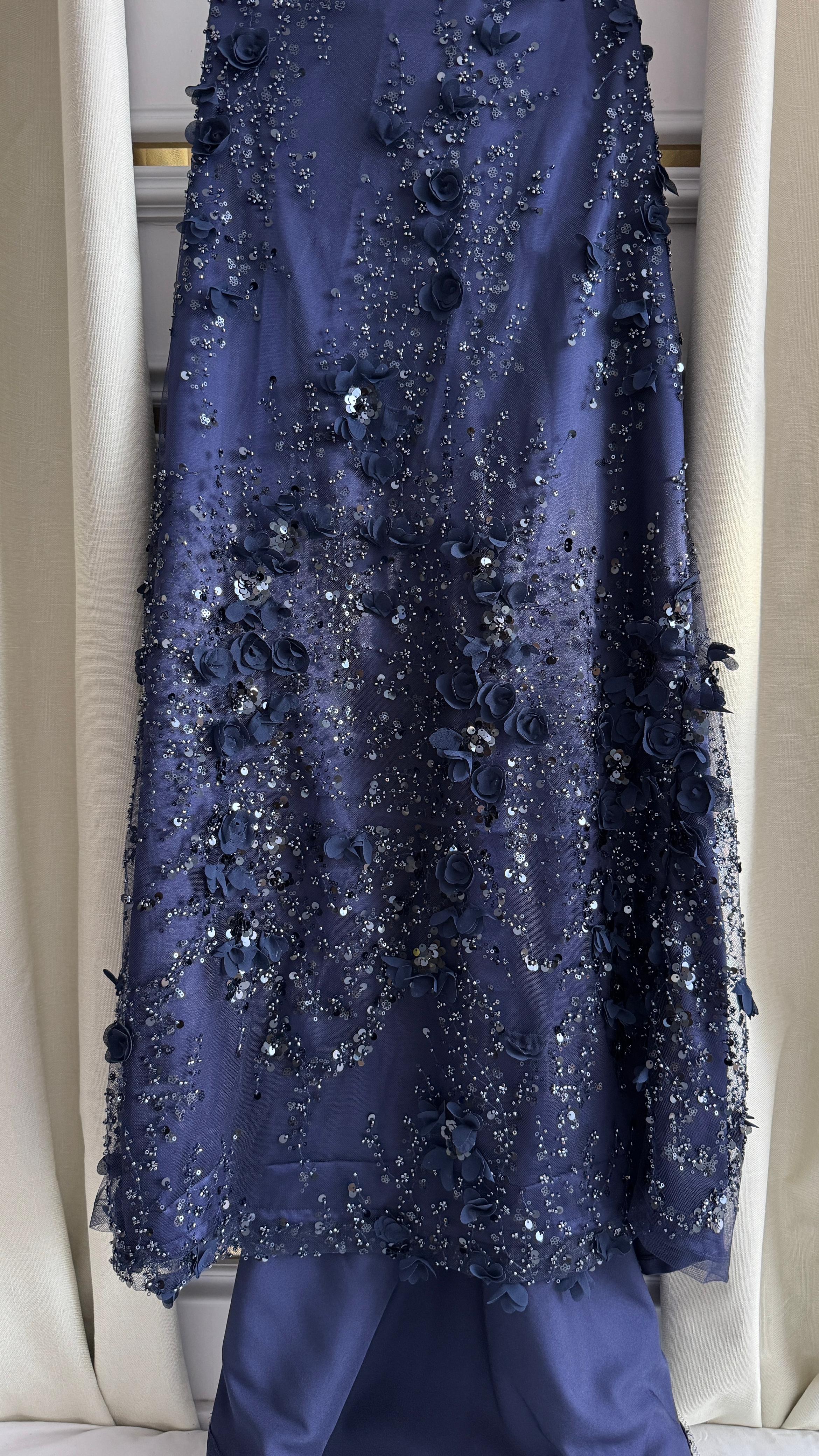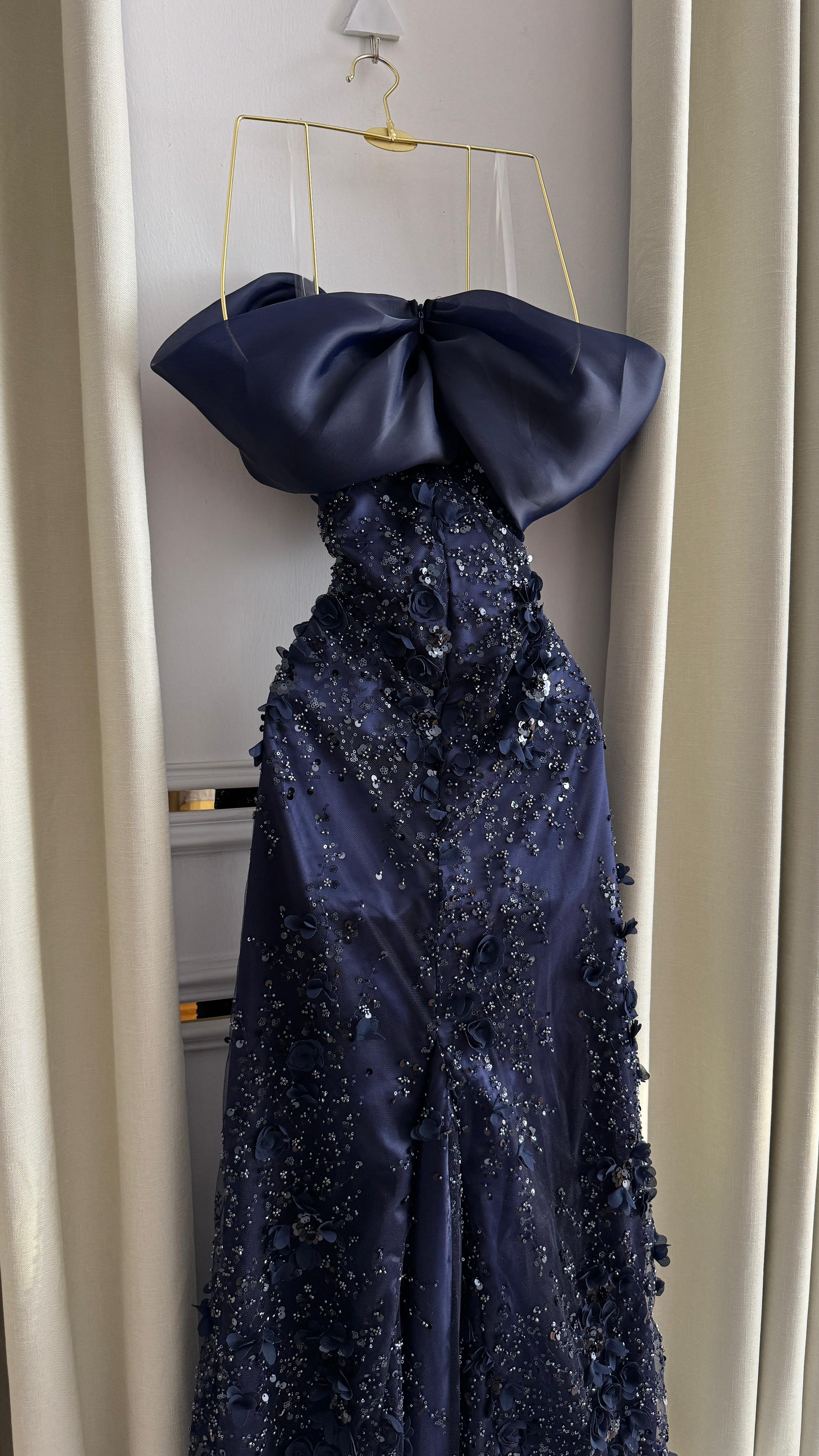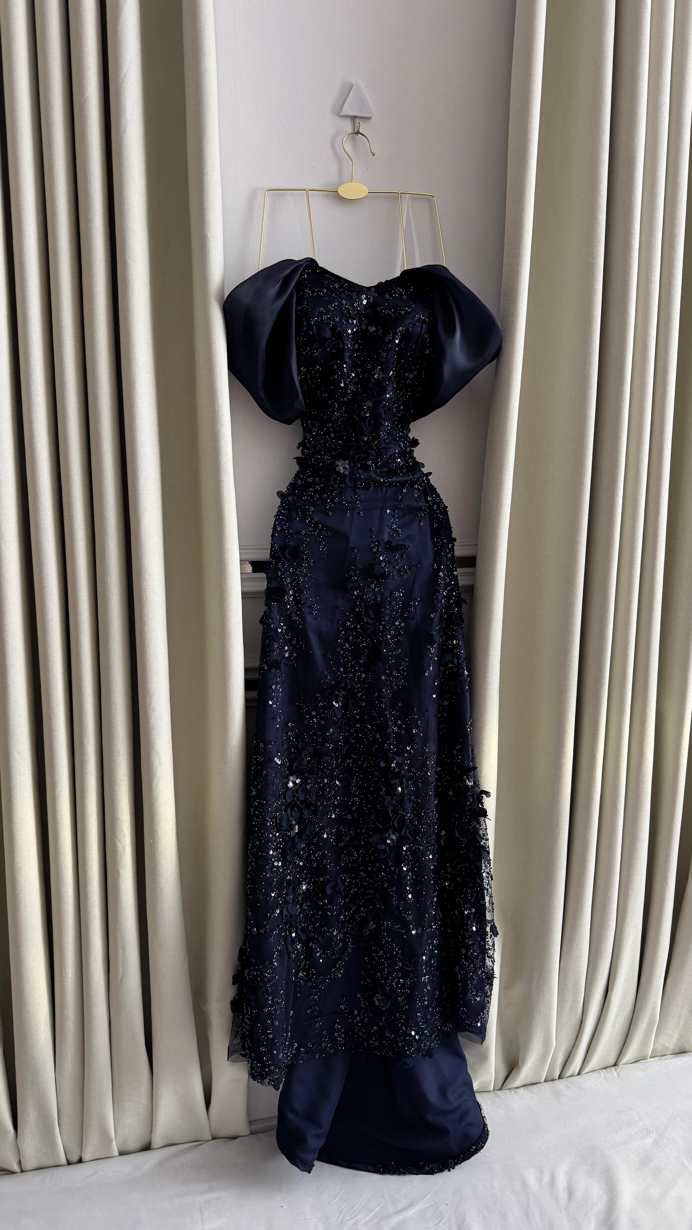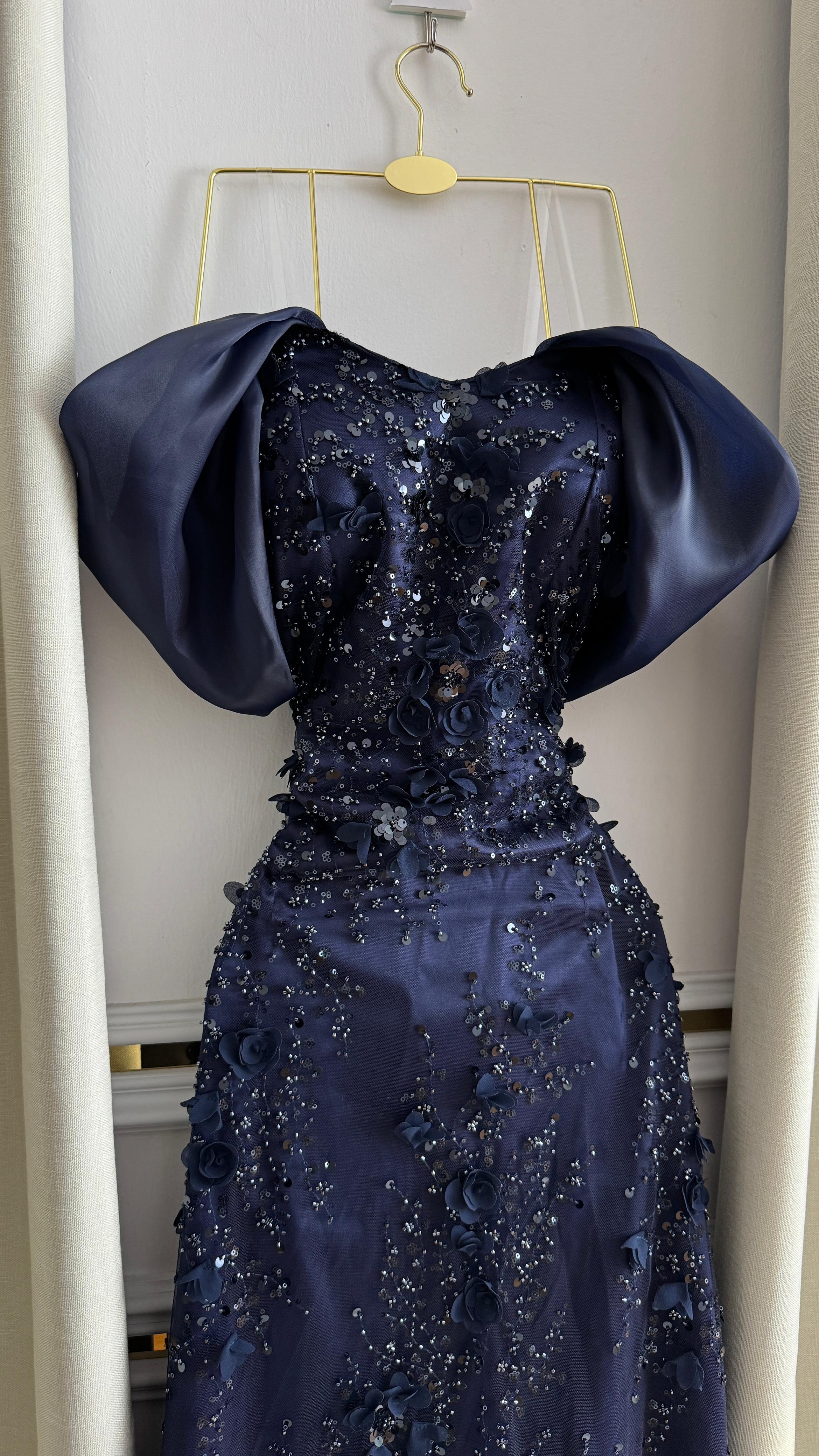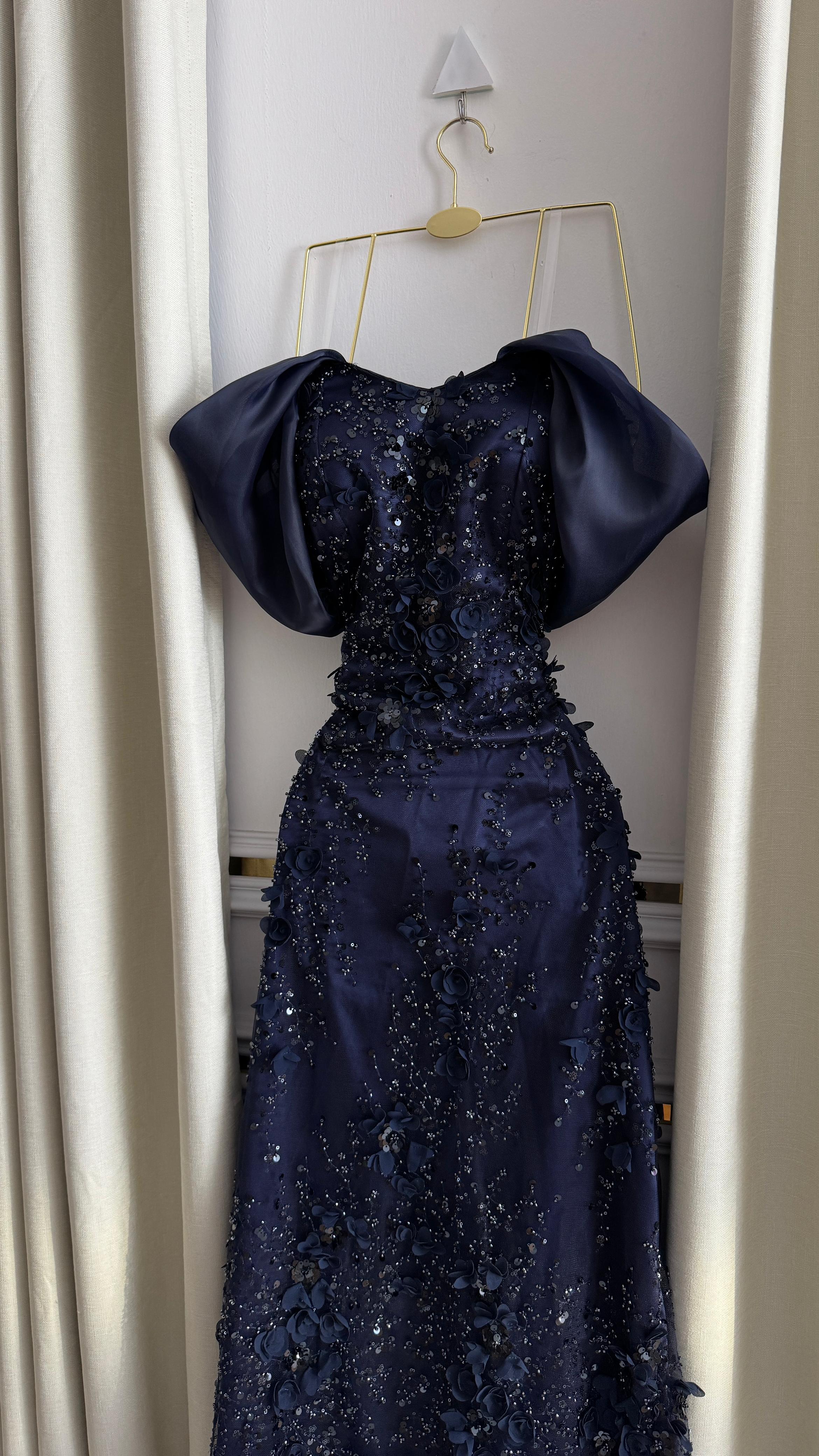 الجزء العلوي والامتداد على طول الفستان مطرّز يدويًا بزهور ثلاثية الأبعاد مرصّعة بالكريستال اللامع، مما يمنح بريقًا ساحرًا تحت الإضاءة. أما الأكمام المنسدلة على الأكتاف بلون فاتح متناغم فهي تضيف لمسة ملكية تزيد التصميم فخامة ورقيًا.