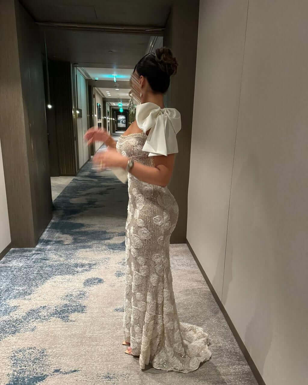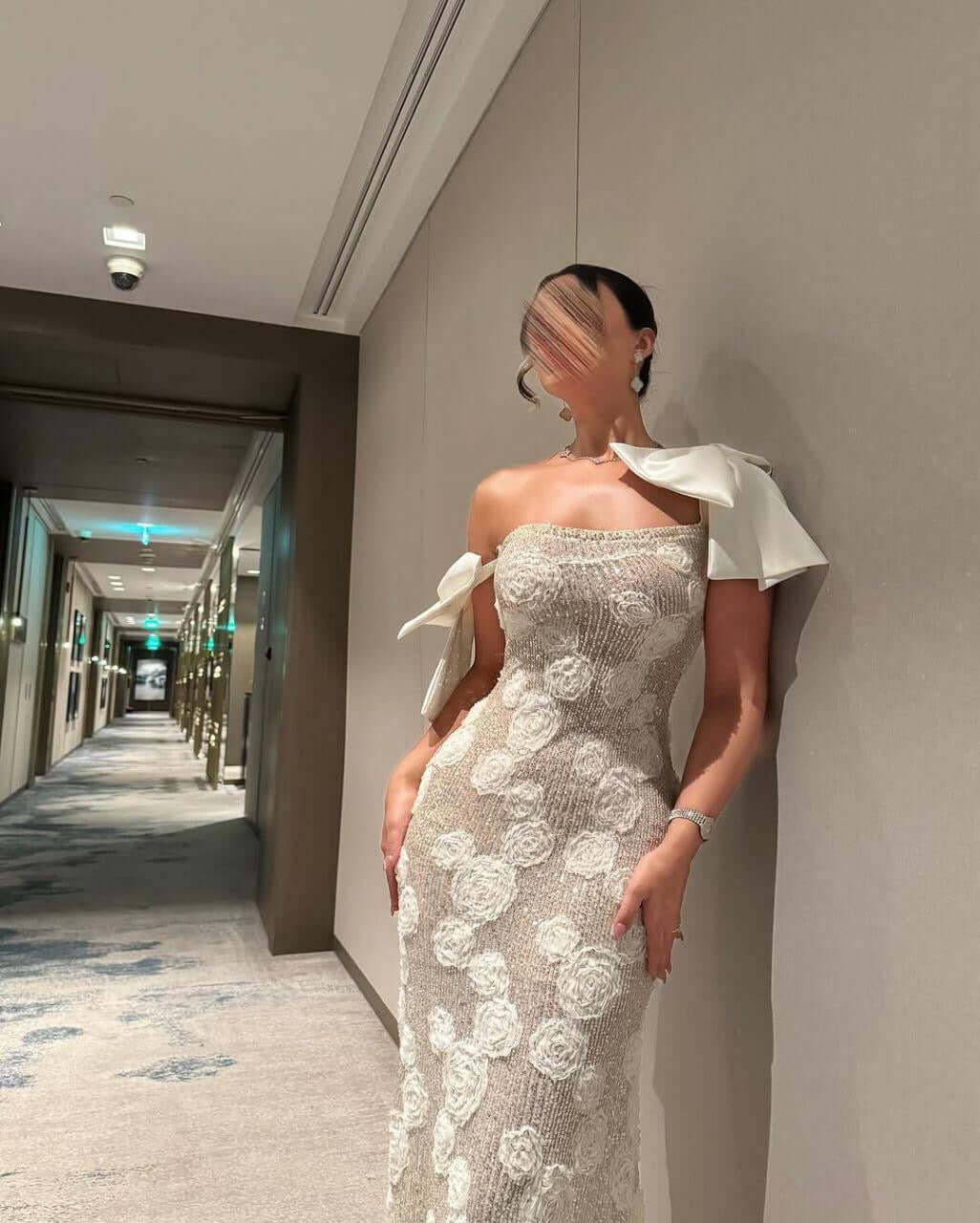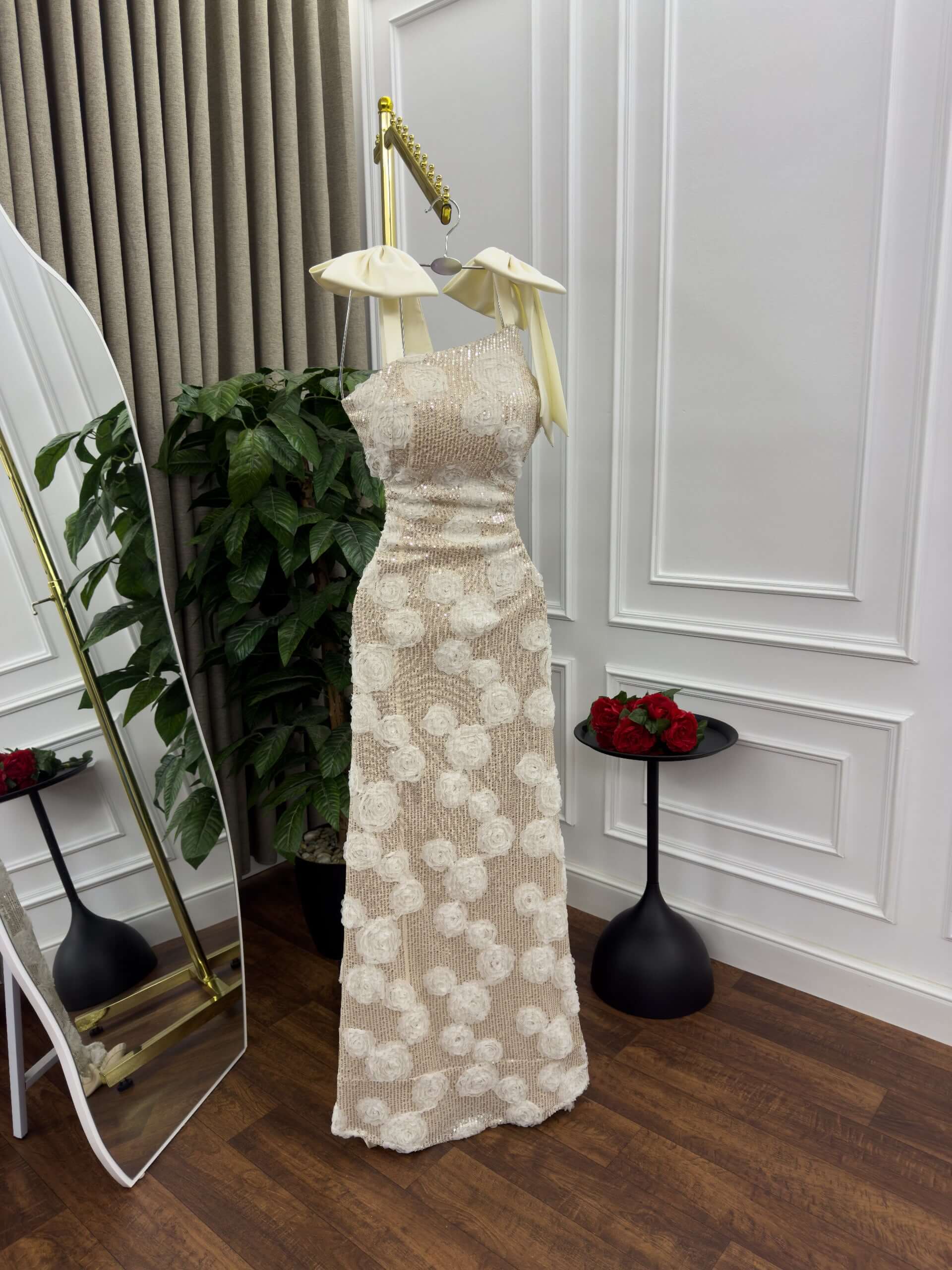 استمتعي بأناقة لا مثيل لها مع هذا الفستان البيج الفاخر المصمم من قماش مطرز يدويًا بورود بارزة تمنح لمسة أنثوية راقية. يتميز بقصة ضيقة تبرز جمال القوام مع ربطة كتف كبيرة تضيف لمسة فخامة. مثالي للمناسبات الفاخرة مثل حفلات الزفاف والخطوبة. نسقيه مع أقراط لؤلؤ، حقيبة كلاتش فضية، وحذاء بكعب عالي لإطلالة مكتملة.