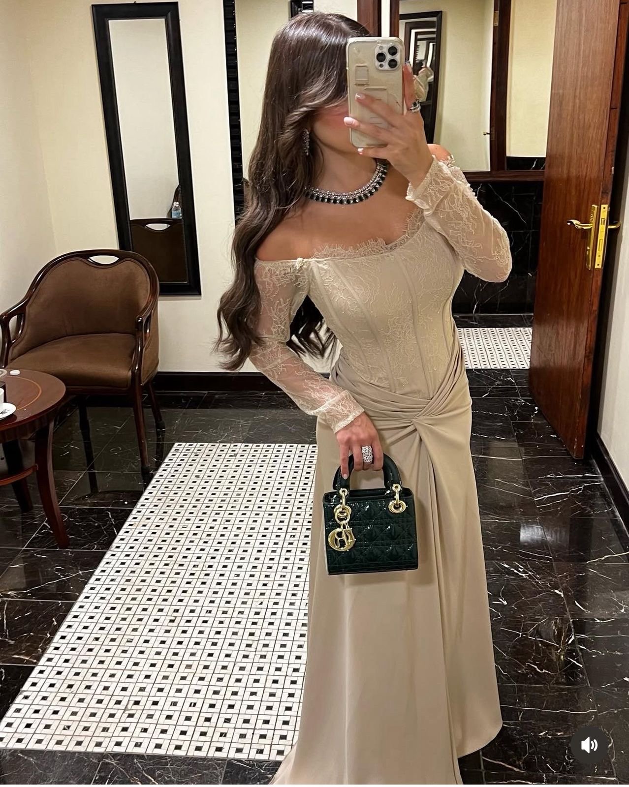 اكتشفي أناقة خالدة مع هذا الفستان البيج الطويل بتصميم أوف شولدر يزينه كورسيه من الدانتيل الفاخر وأكمام شفافة تضفي لمسة رقي. تنسدل تنورته بقصة درابية أنثوية تمنحك إطلالة ساحرة. نسّقيه مع عقد لامع وقرط متدلٍ مع حقيبة يد فاخرة لإطلالة كاملة مثالية للسهرات وحفلات الزفاف.