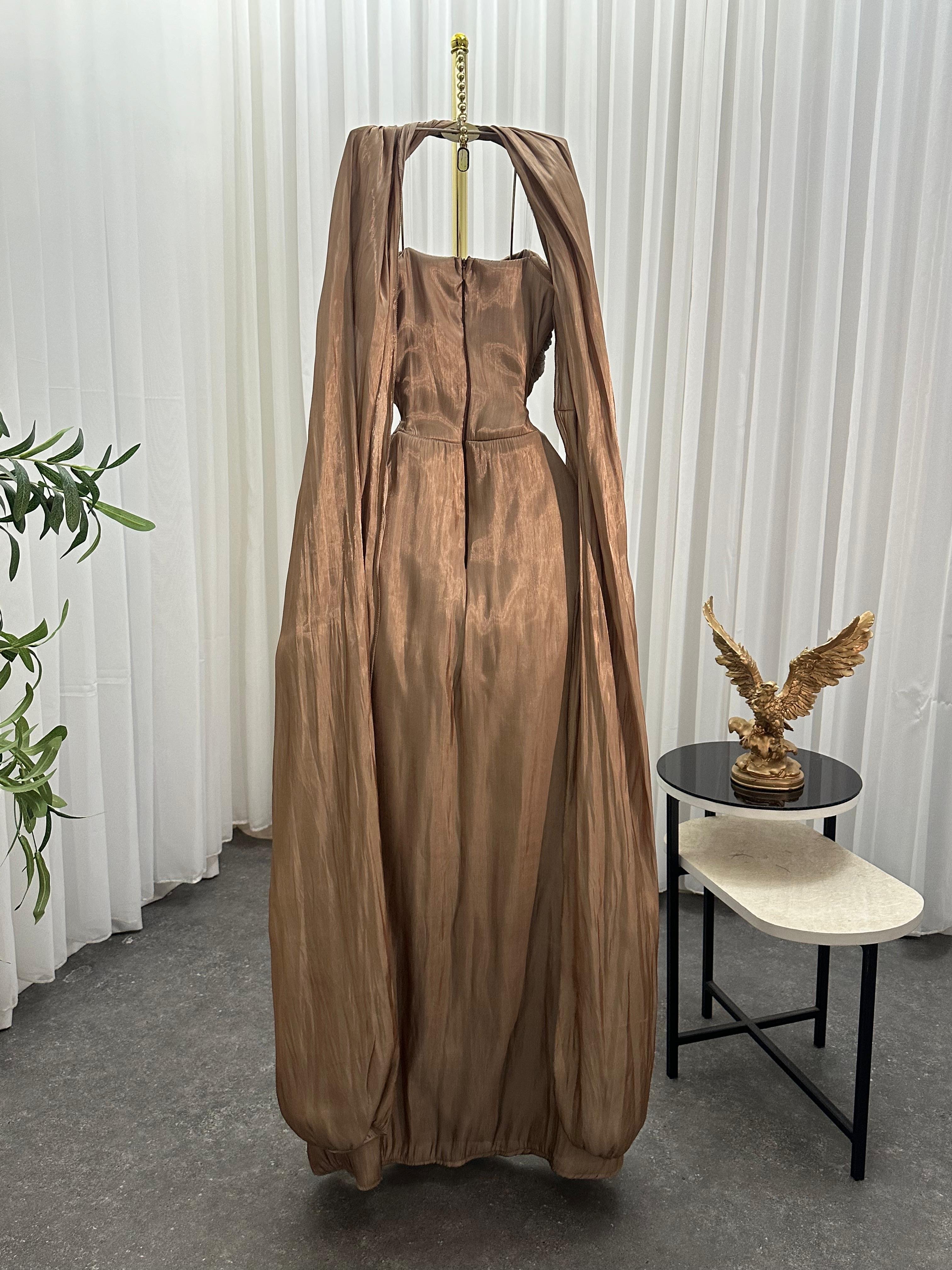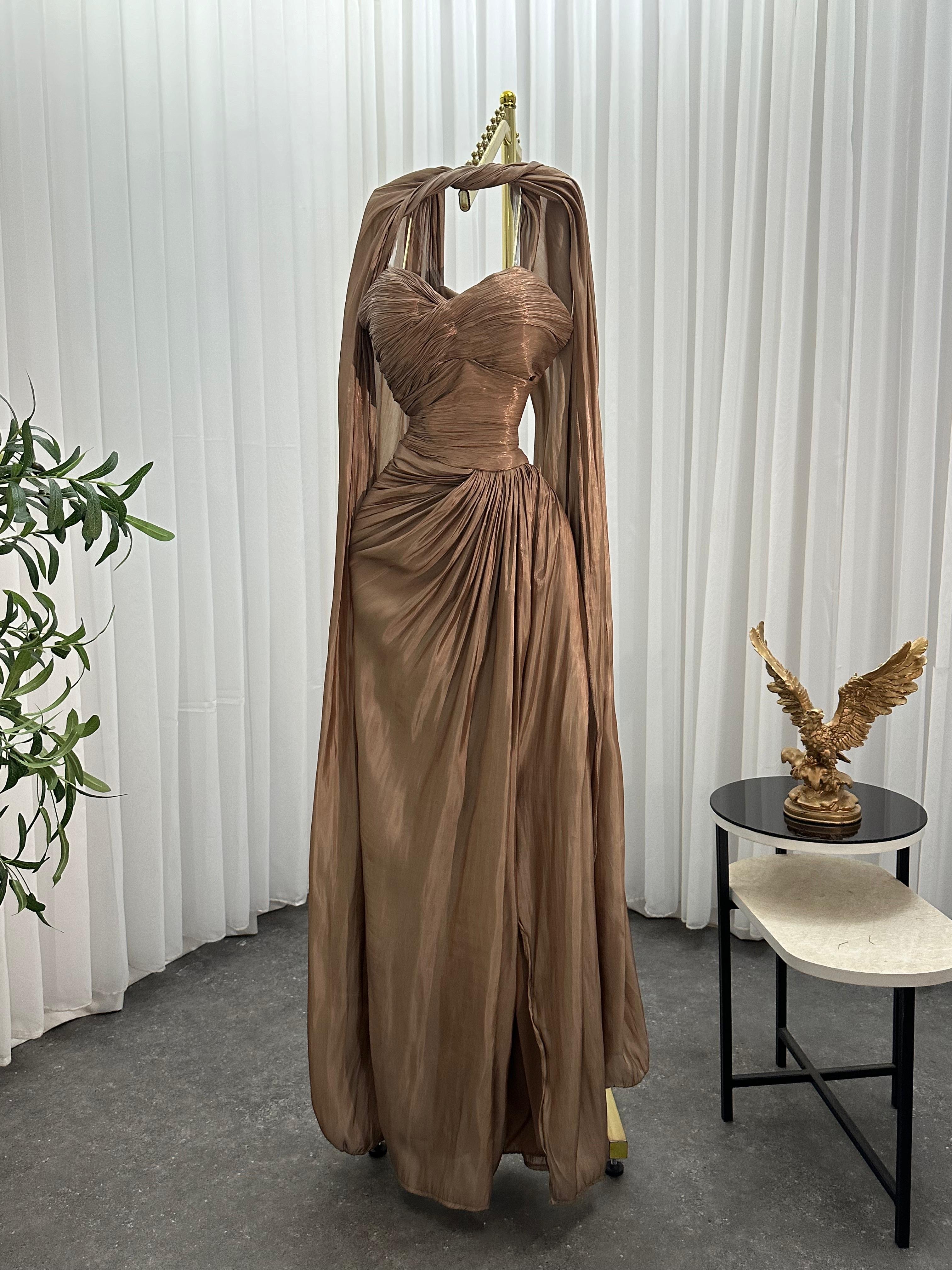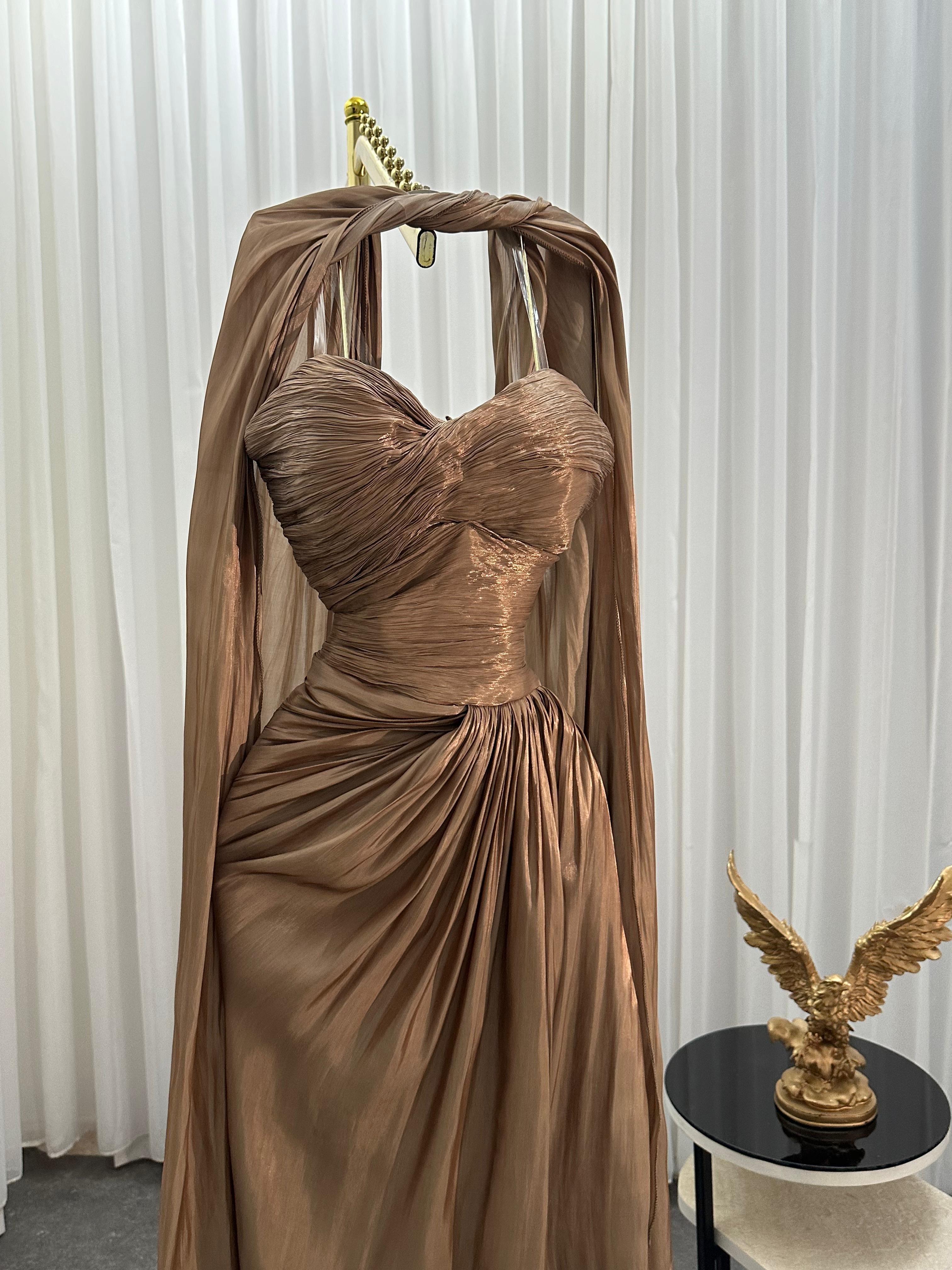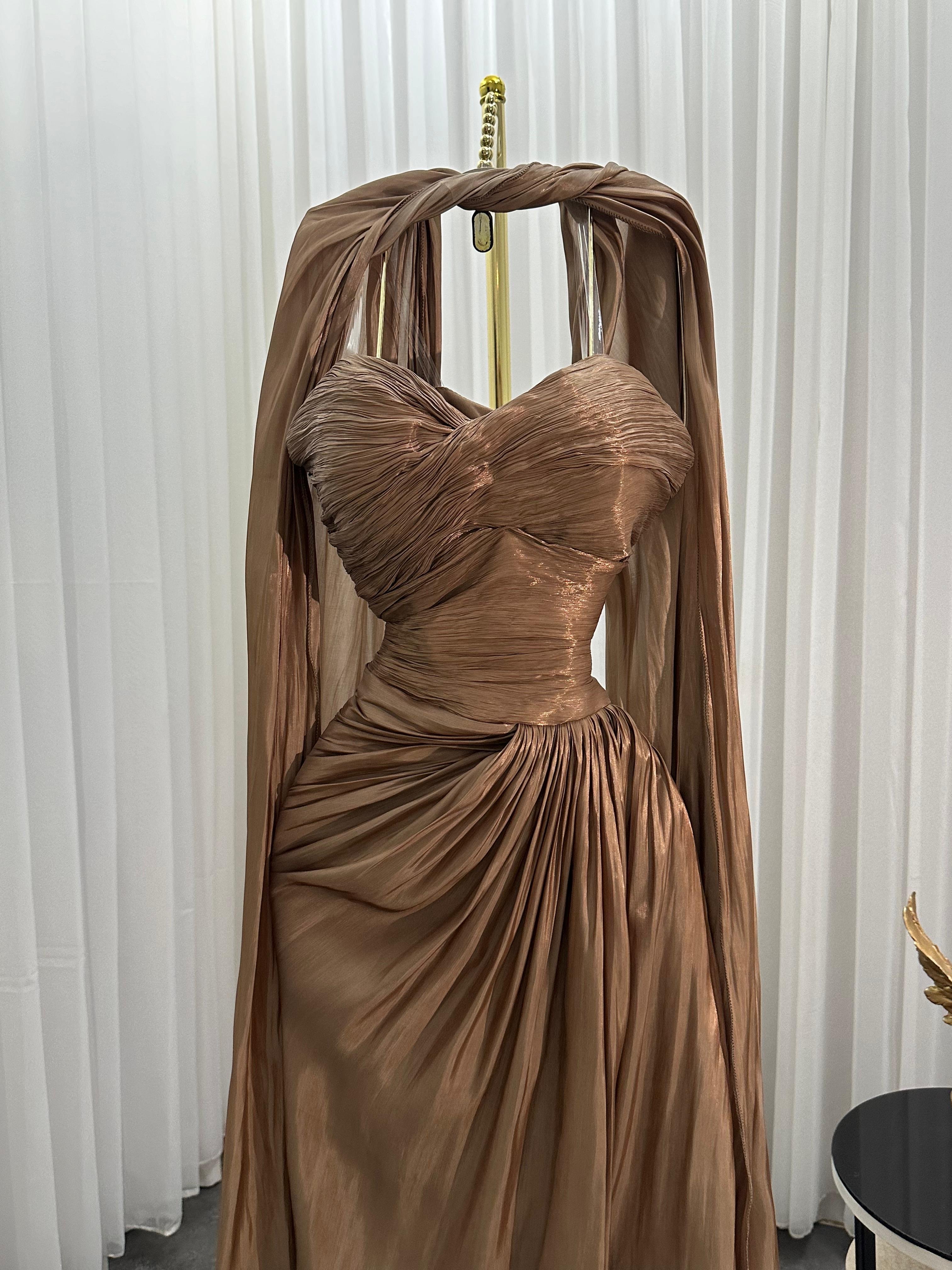 فستان سهرة فاخر باللون البني الدافئ، مصمم بقماش انسيابي بتفاصيل درابيه دقيقة تبرز جمال القوام. يتميز بكاب طويل ينساب بخفة ليمنح إطلالة ملكية راقية، مثالي للمناسبات الفاخرة وحفلات السهرة.