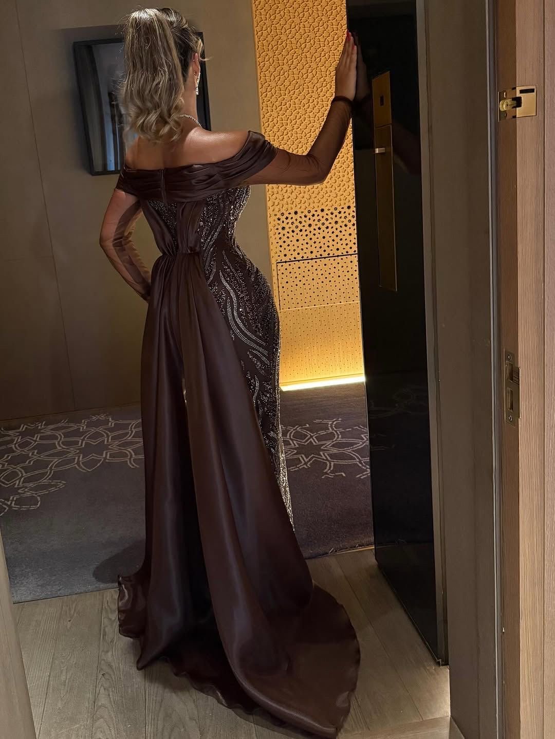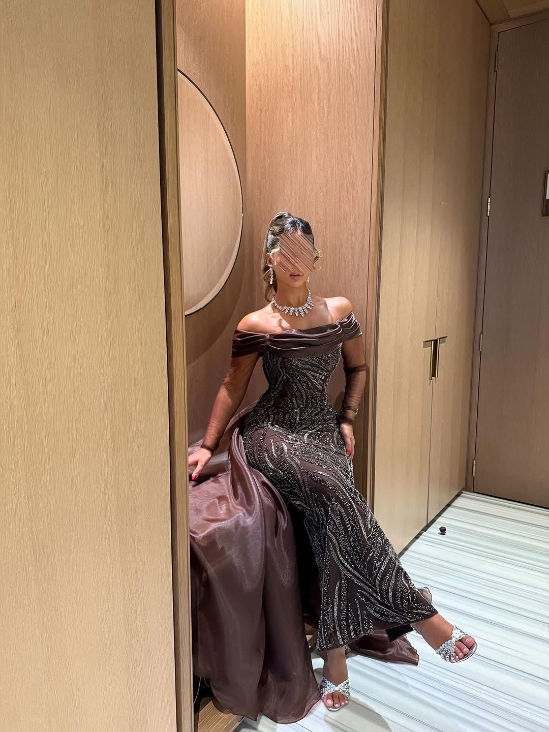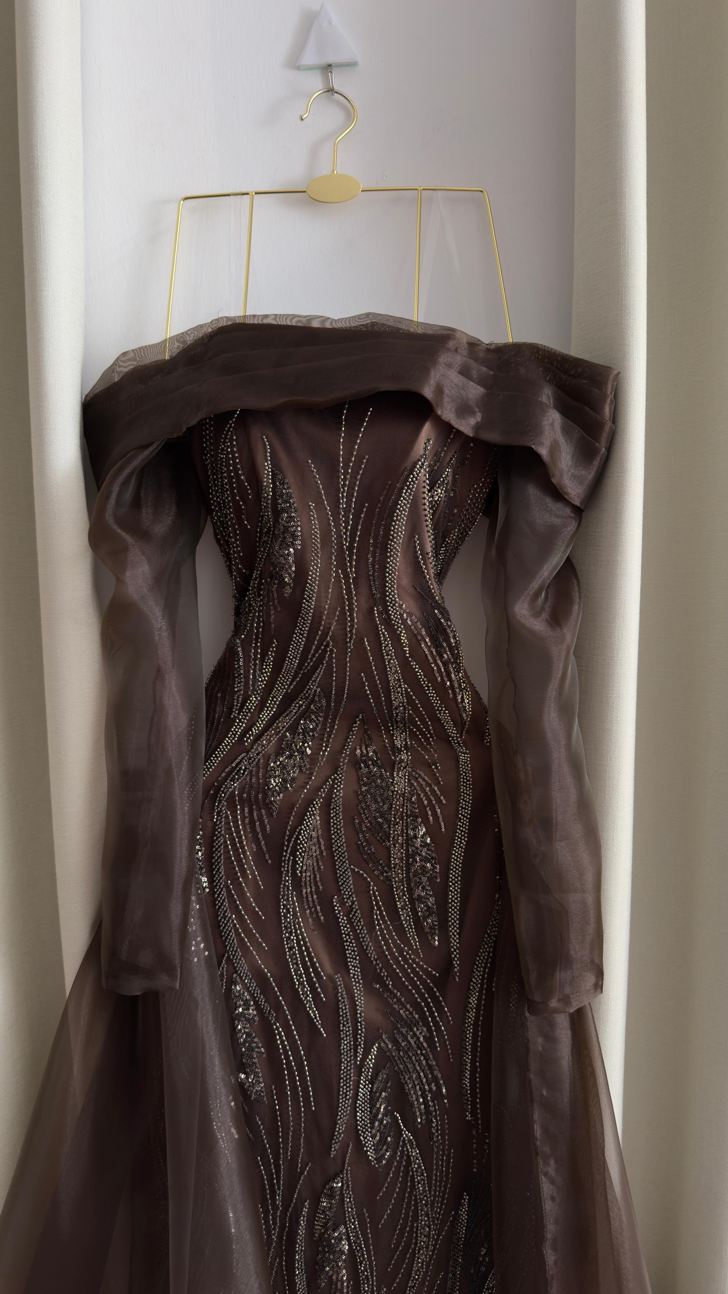 فستان سهرة ملكي بلون بني راقٍ مطرز بتفاصيل براقة تعكس الفخامة. تصميم أوف شولدر مع شق أنيق يبرز جمال الساقين، ليناسب الحفلات والأعراس بكل تميّز.