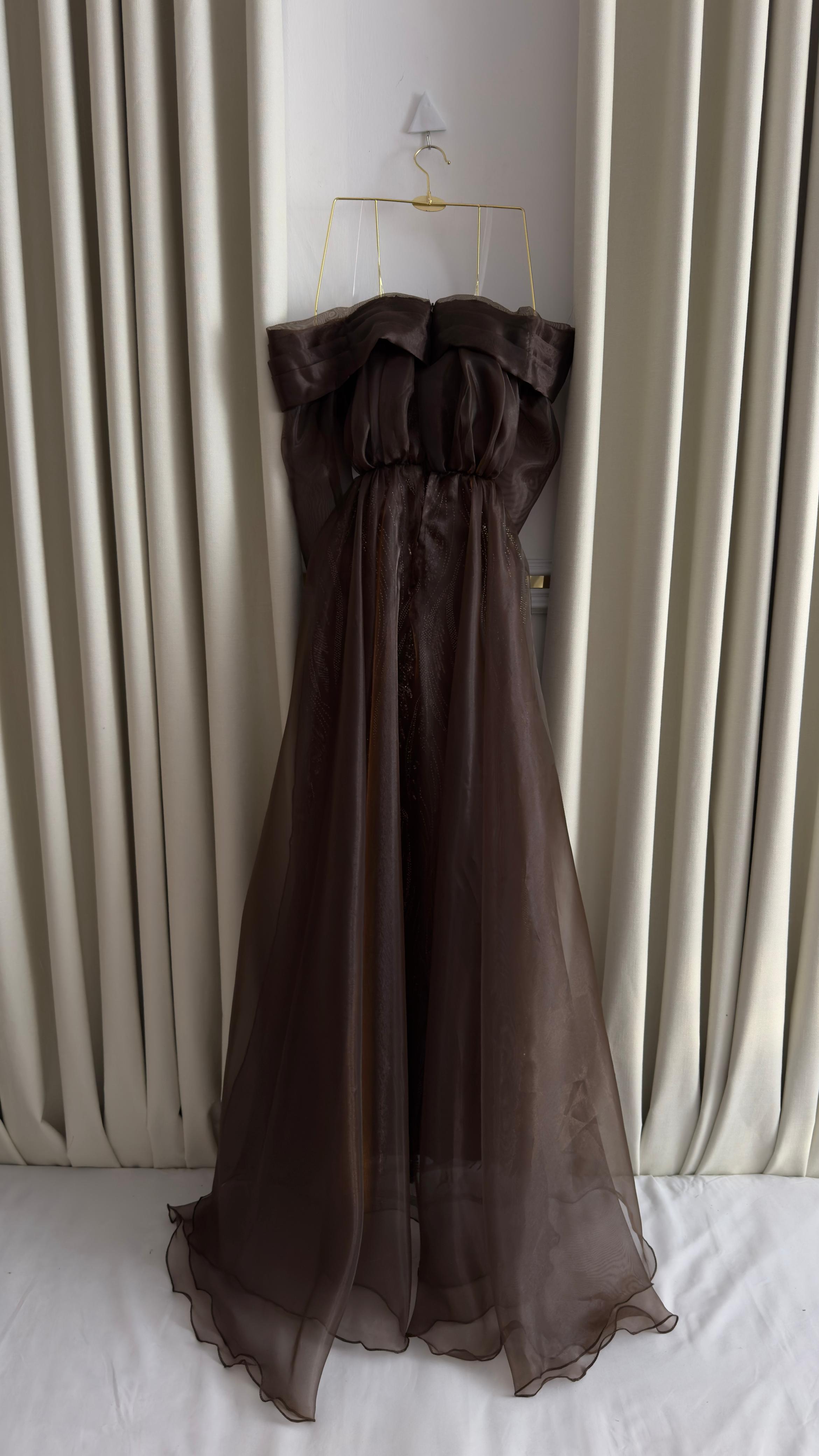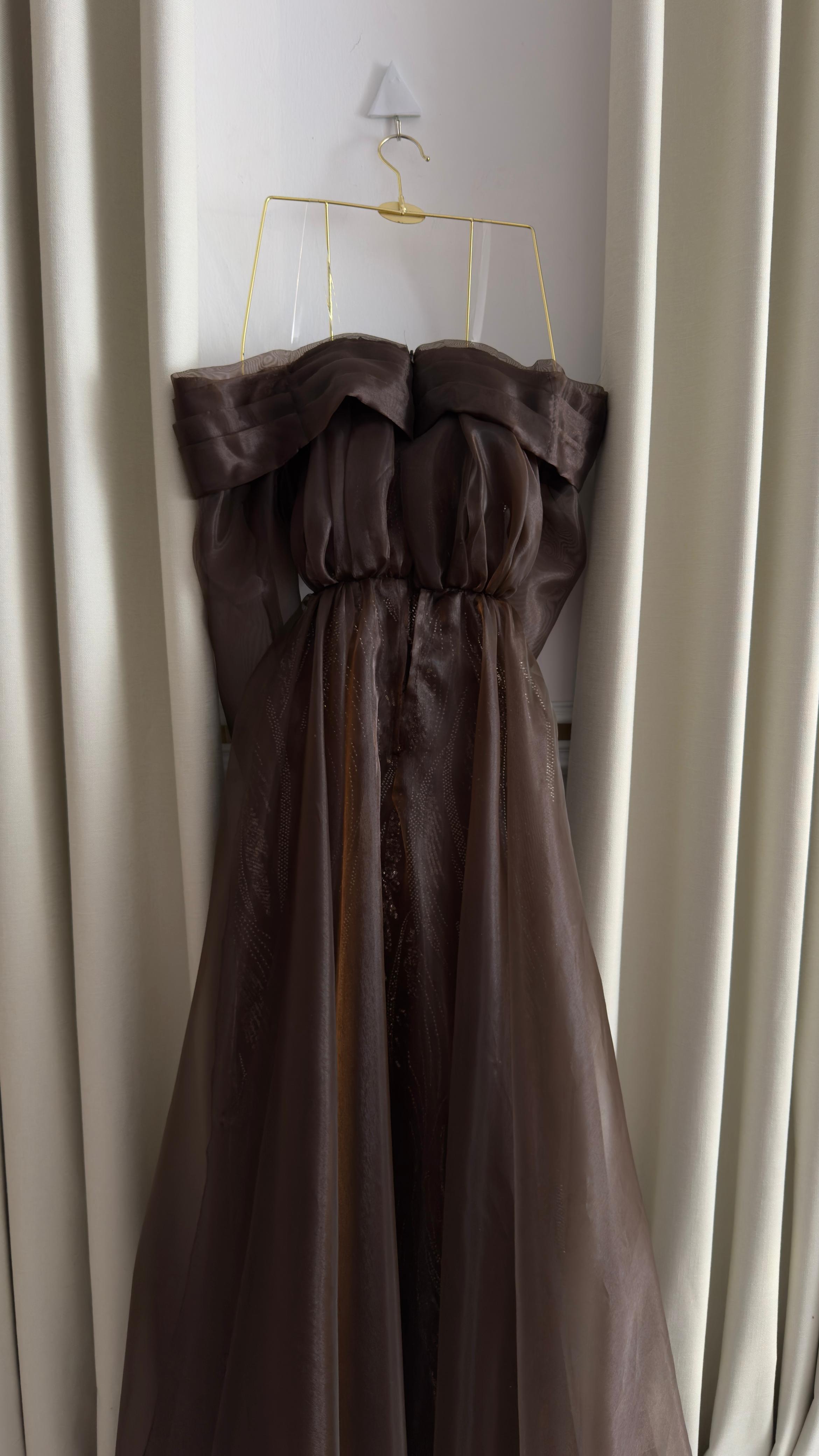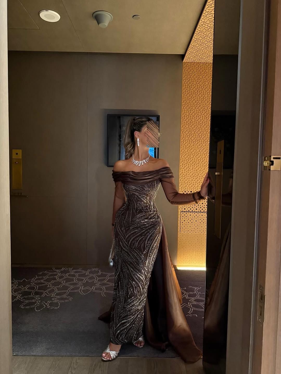 فستان سهرة ملكي بلون بني راقٍ مطرز بتفاصيل براقة تعكس الفخامة. تصميم أوف شولدر مع شق أنيق يبرز جمال الساقين، ليناسب الحفلات والأعراس بكل تميّز.