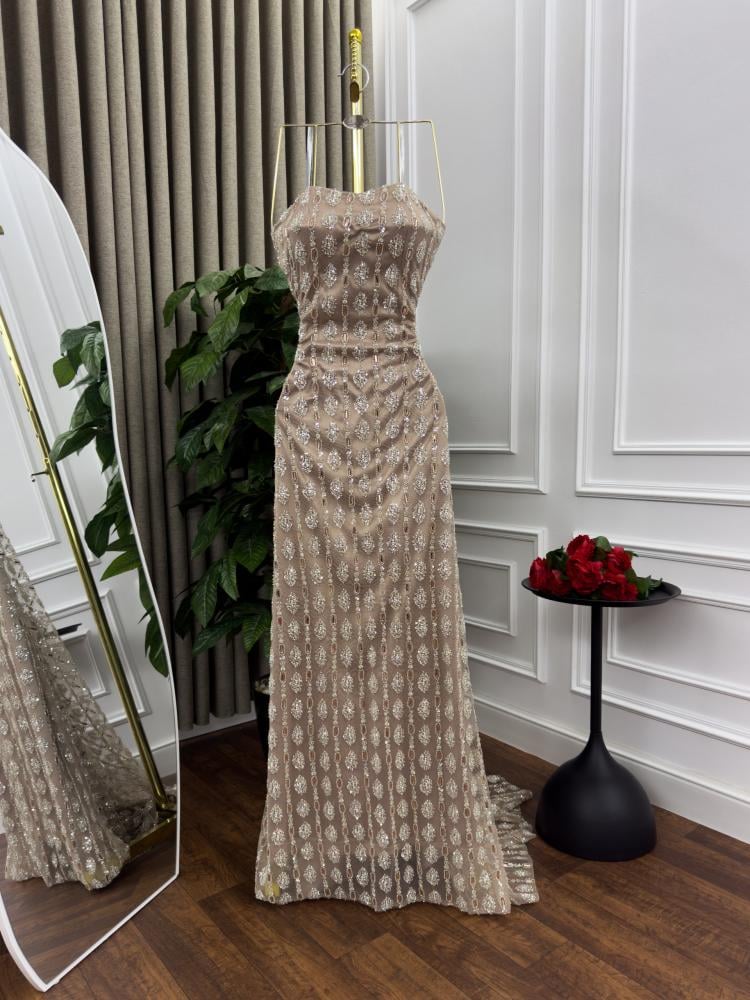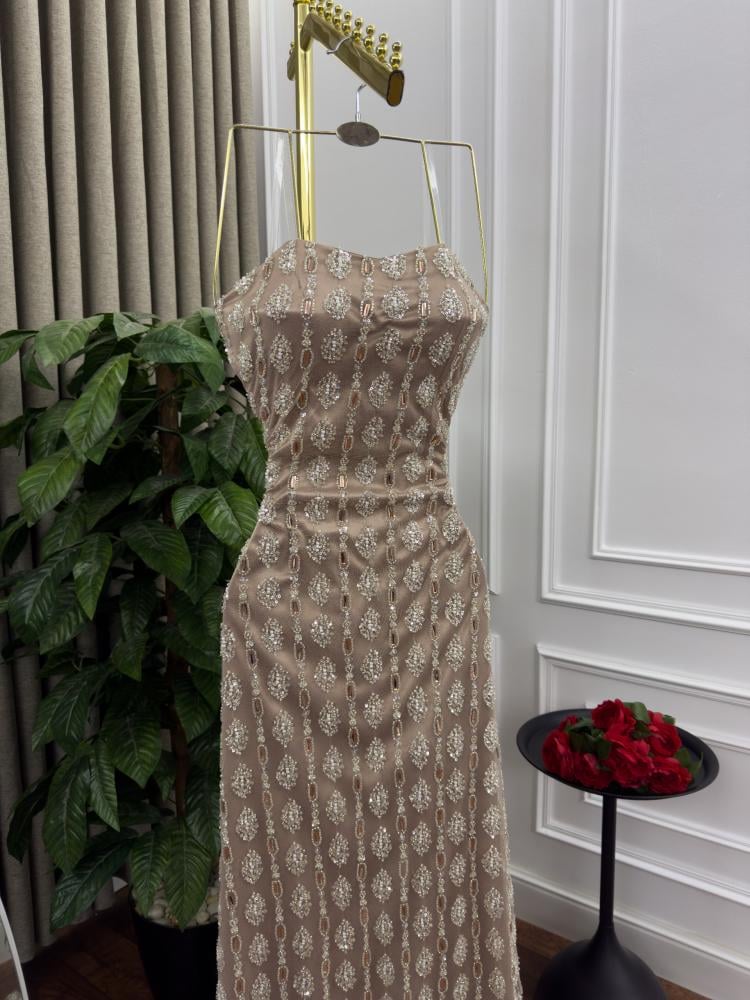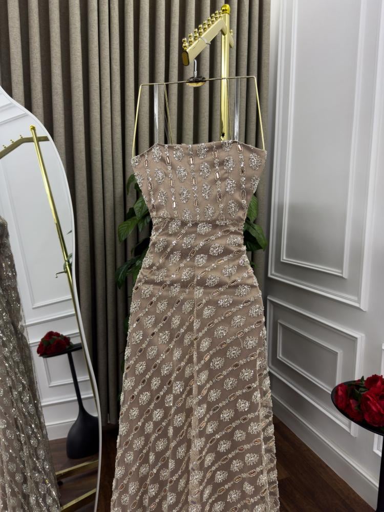 فستان سهرة طويل باللون البيج الفاتح بتصميم راقٍ ومحتشم، ينسدل بخطوط مستقيمة تمنح القوام انسيابية مثالية. مزدان بالكامل بتطريز لامع بخيوط فضية تضفي عليه لمسة من الفخامة والرقي. تصميم الأكتاف الرفيعة المكشوفة يضيف لمسة أنوثة ناعمة لإطلالة ملكية متكاملة.