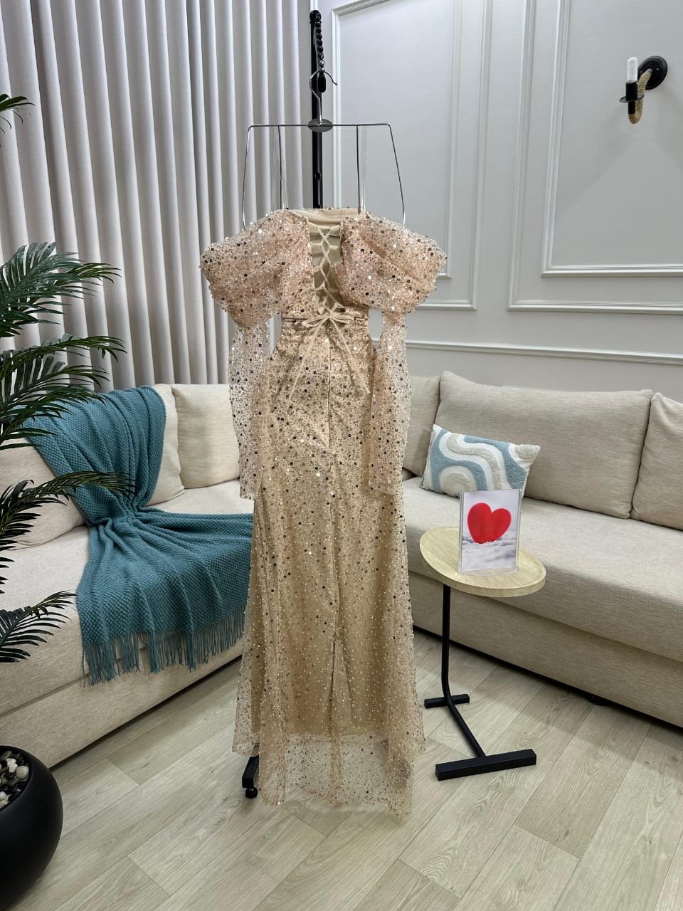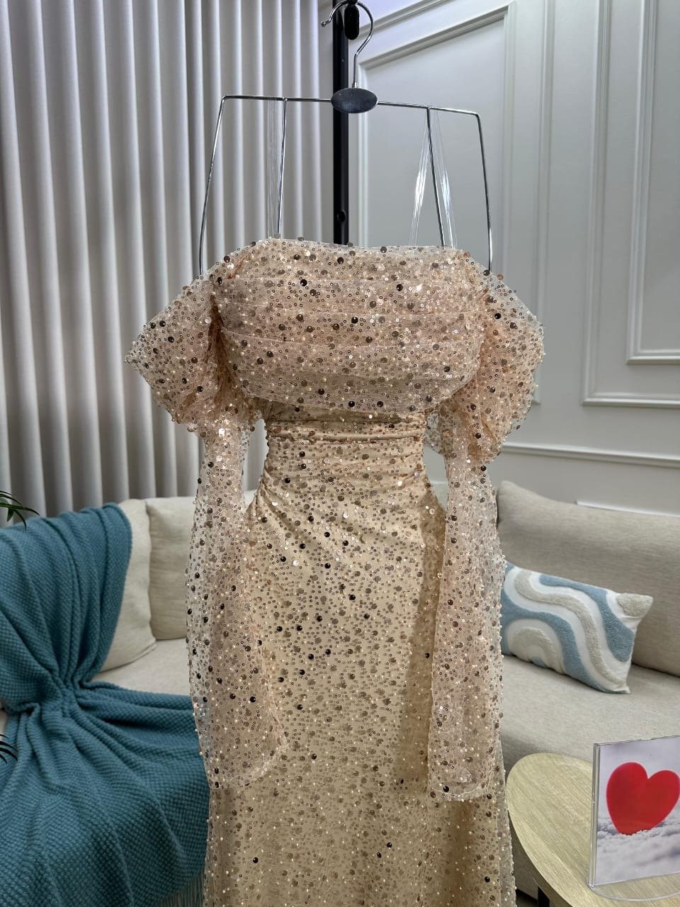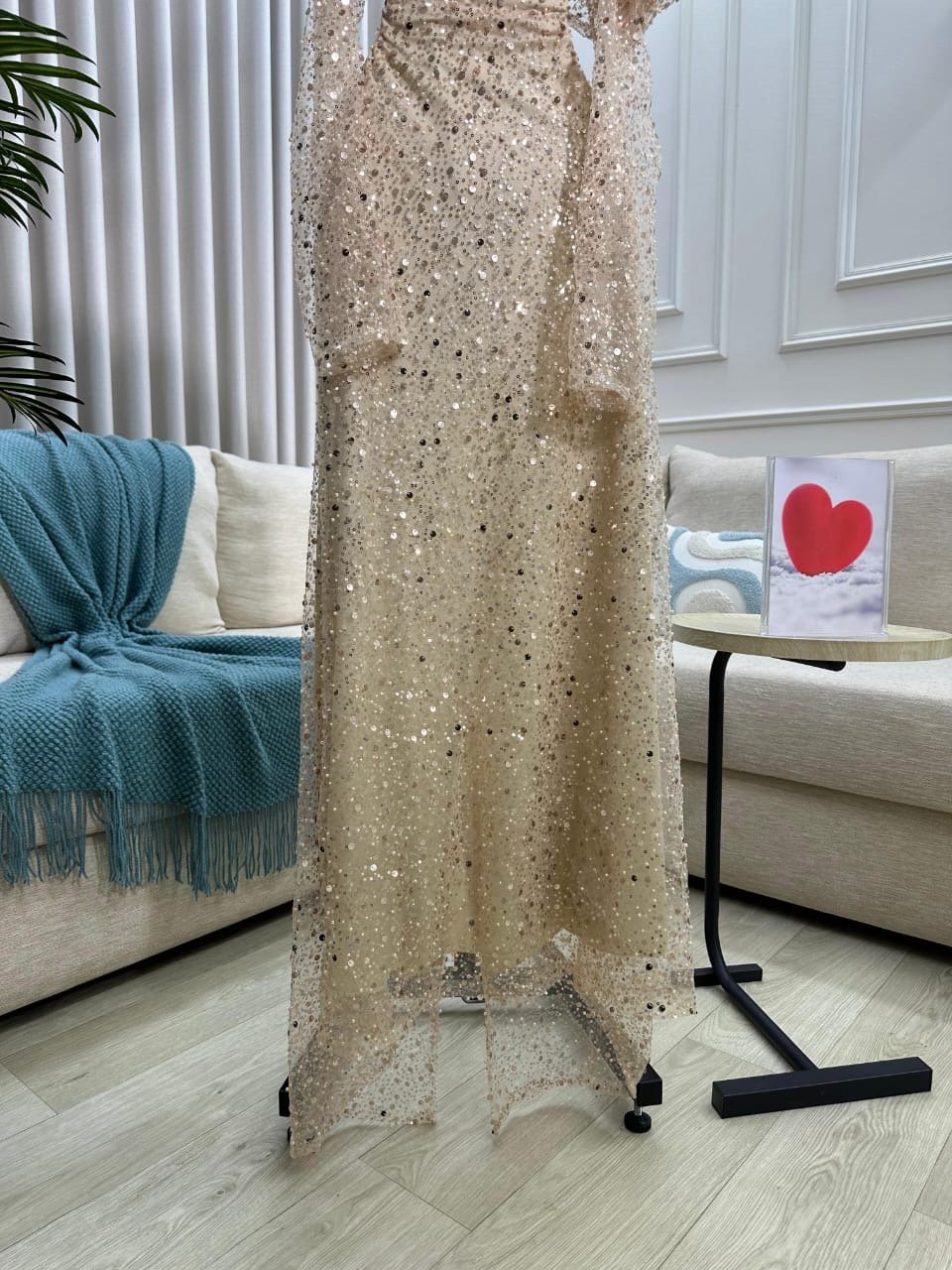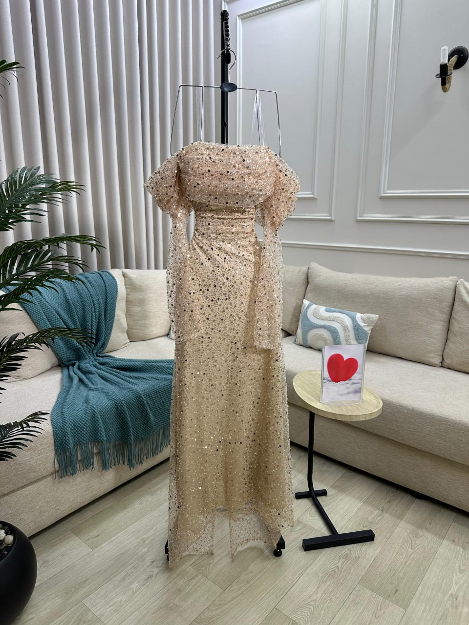 فستان سهرة بلون بيج ناعم يفيض بالرقي والفخامة. مطرز بالكامل بالترتر والكريستالات البراقة ليمنحك إطلالة تخطف الأنظار تحت الأضواء. يتميز بأكمام منسدلة تضيف لمسة رومانسية أنثوية، مع قصة انسيابية تبرز جمال القوام. الخيار المثالي لإطلالة ملوكية في المناسبات الفاخرة.