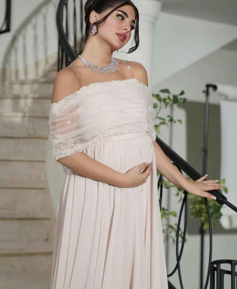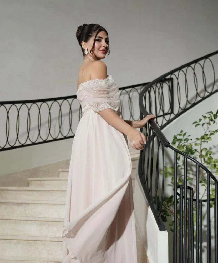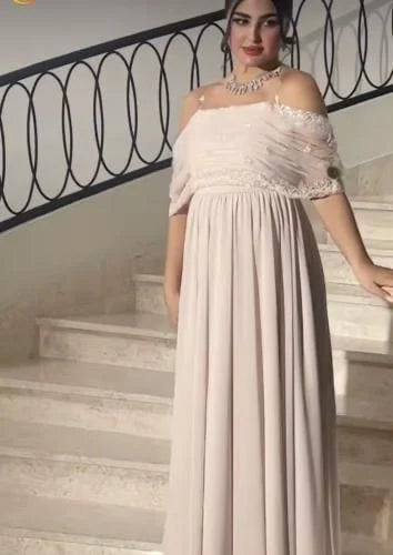 تميزي بإطلالة أنيقة مع هذا الفستان البيج الأوف شولدر المصمم بكشكش ناعم عند الصدر، ليبرز أنوثتك برقي. تنورته الطويلة تنسدل بانسيابية لتمنحك راحة وأناقة في آن واحد، ليكون خيارك الأمثل لحفلات السهرة والمناسبات الرسمية.