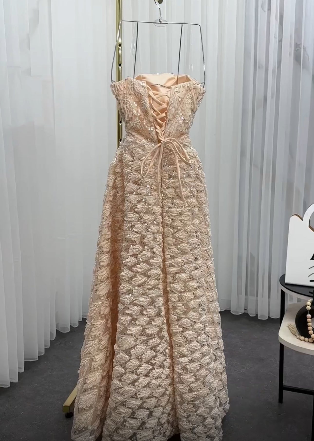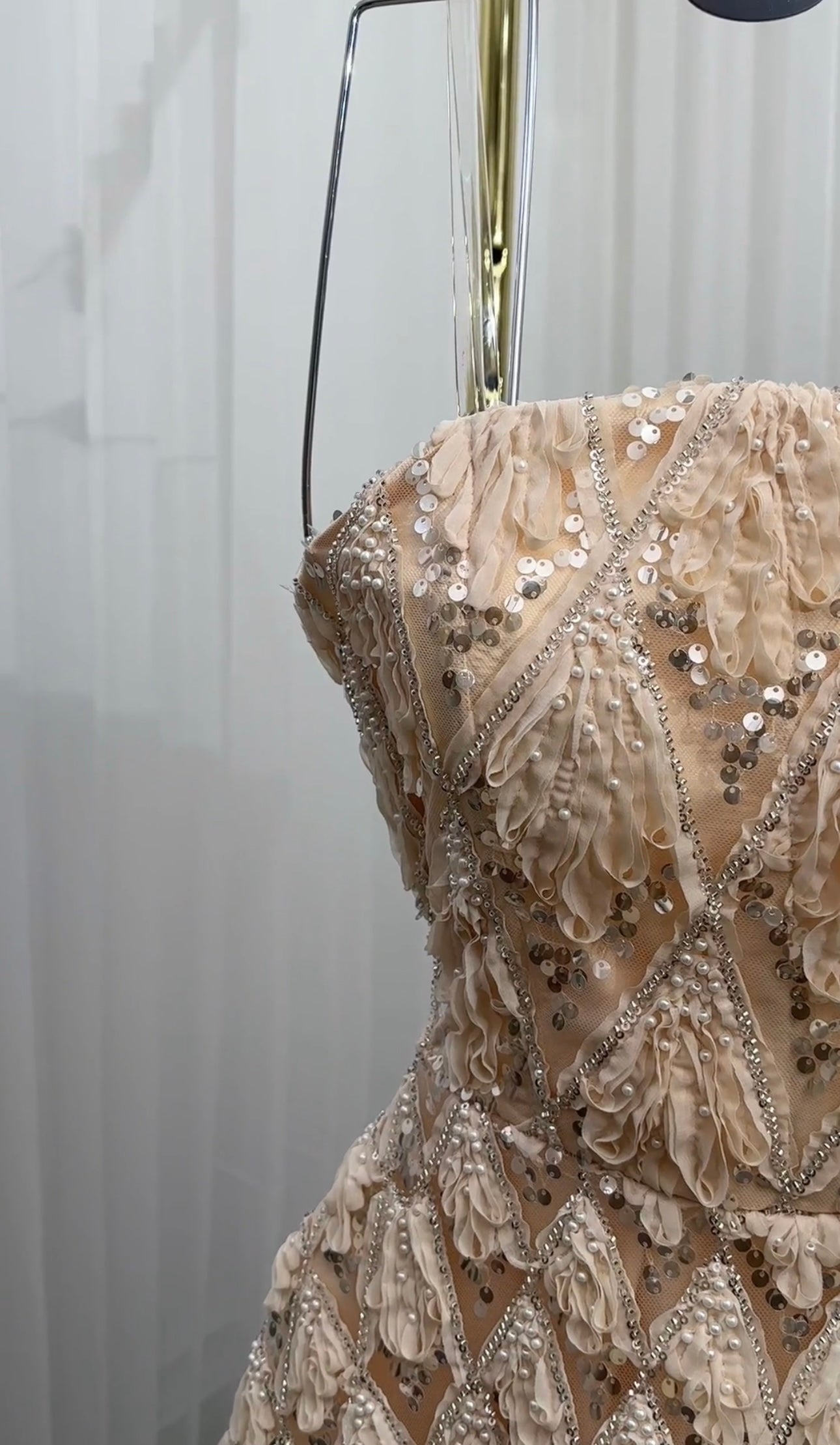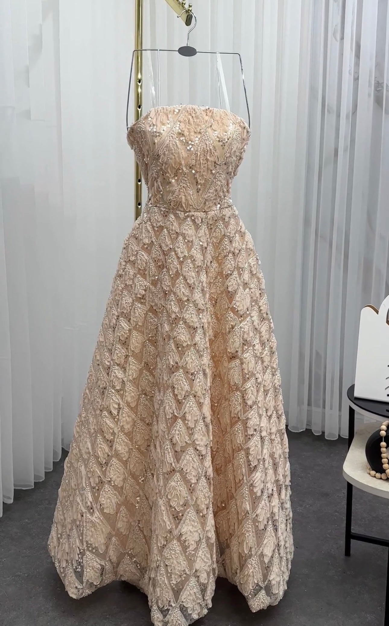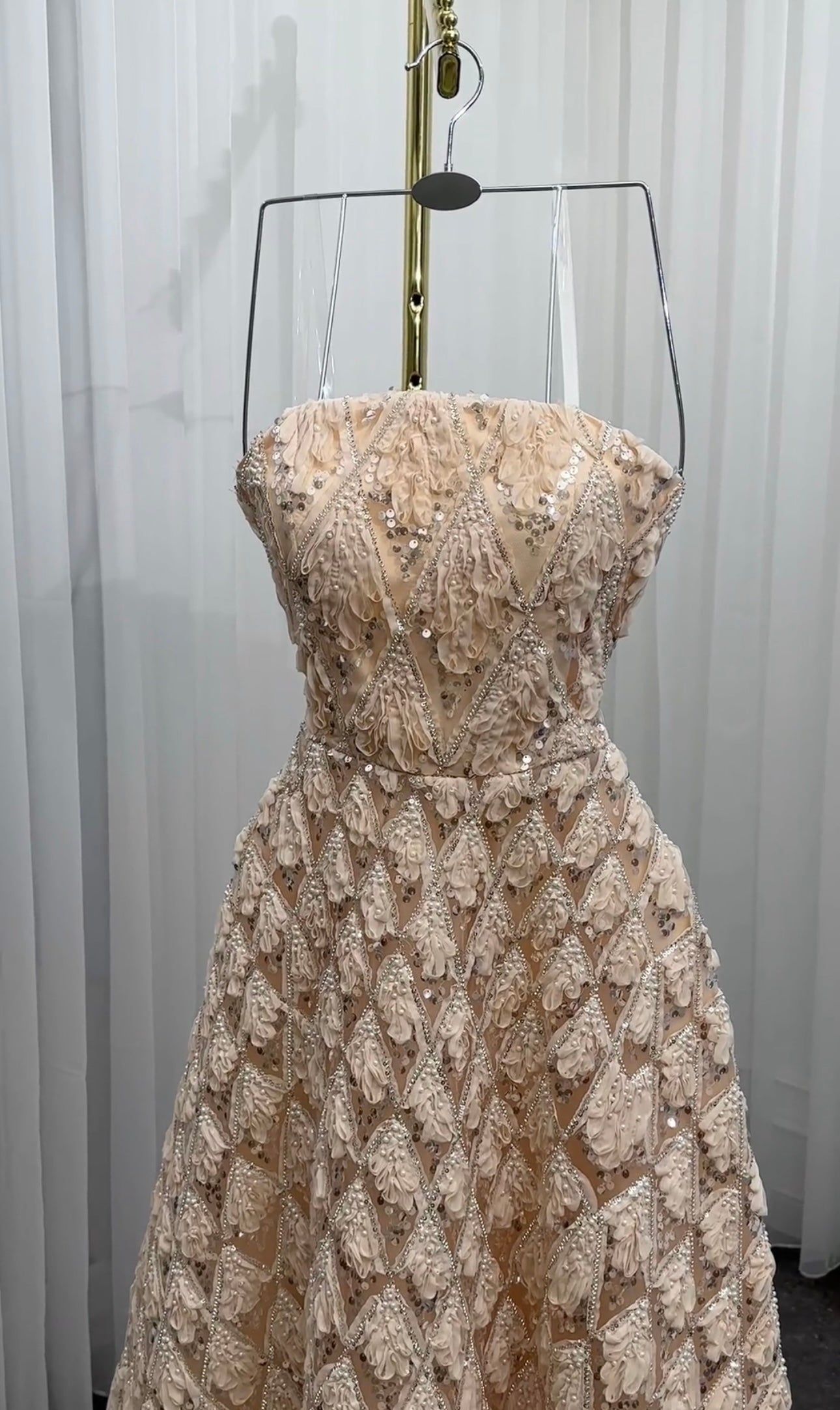 ارتقي بإطلالتك مع هذا الفستان السهرة البيج الفاخر، المصمم بأسلوب أنثوي راقٍ يدمج بين الرقي والفخامة. يتميز الفستان بقصة A-Line بدون أكمام وصدر مشدود يعزز من تناسق القوام، بينما يغطى بالكامل بتطريزات فاخرة بنقوش ناعمة لامعة تخلق تأثيراً ثلاثي الأبعاد مذهلاً.