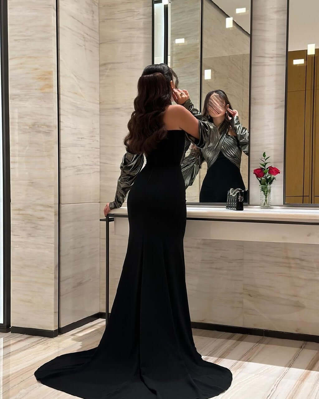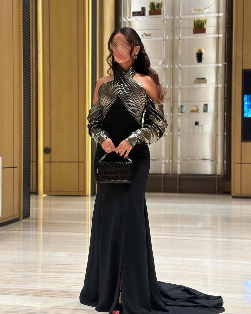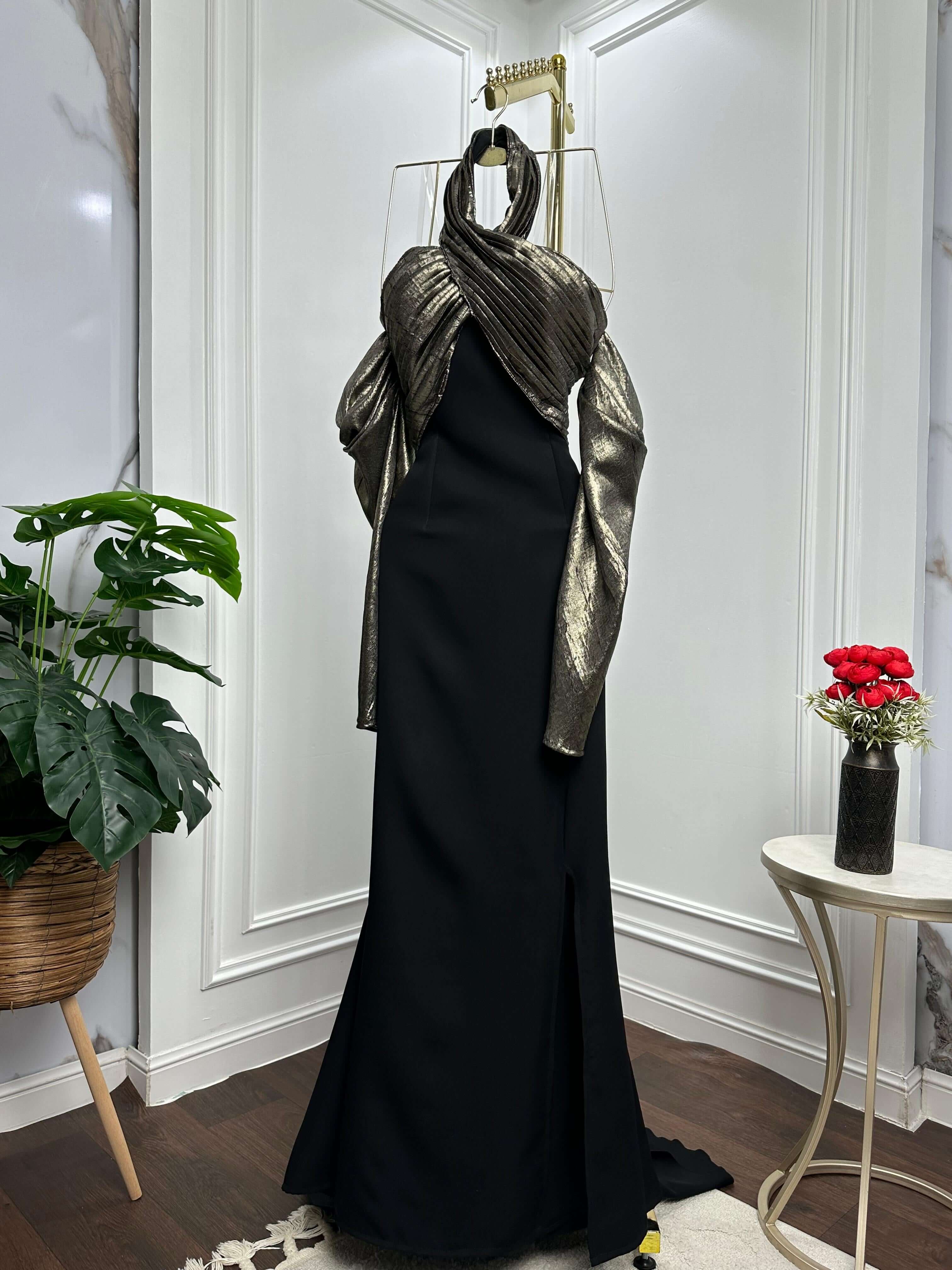فستان سهرة فاخر باللون الأسود بطول 150 سم، مصمم بأسلوب أنيق يجمع بين الجرأة والرقي. يتميز بفتحة كتف مكشوفة وتصميم ملتف حول الرقبة مع تفاصيل معدنية لامعة باللون الفضي تضيف لمسة فاخرة وجاذبية خاصة. القماش انسيابي فخم يمنح الفستان حركة ناعمة مع ذيل طويل يضفي إحساسًا بالفخامة. الفستان مزود بفتحة أمامية صغيرة لحرية الحركة مع بطانة مريحة للارتداء طوال الأمسية. تصميمه مثالي للسهرات الفاخرة، حفلات الزفاف، والمناسبات الرسمية التي تتطلب إطلالة لا تُنسى.