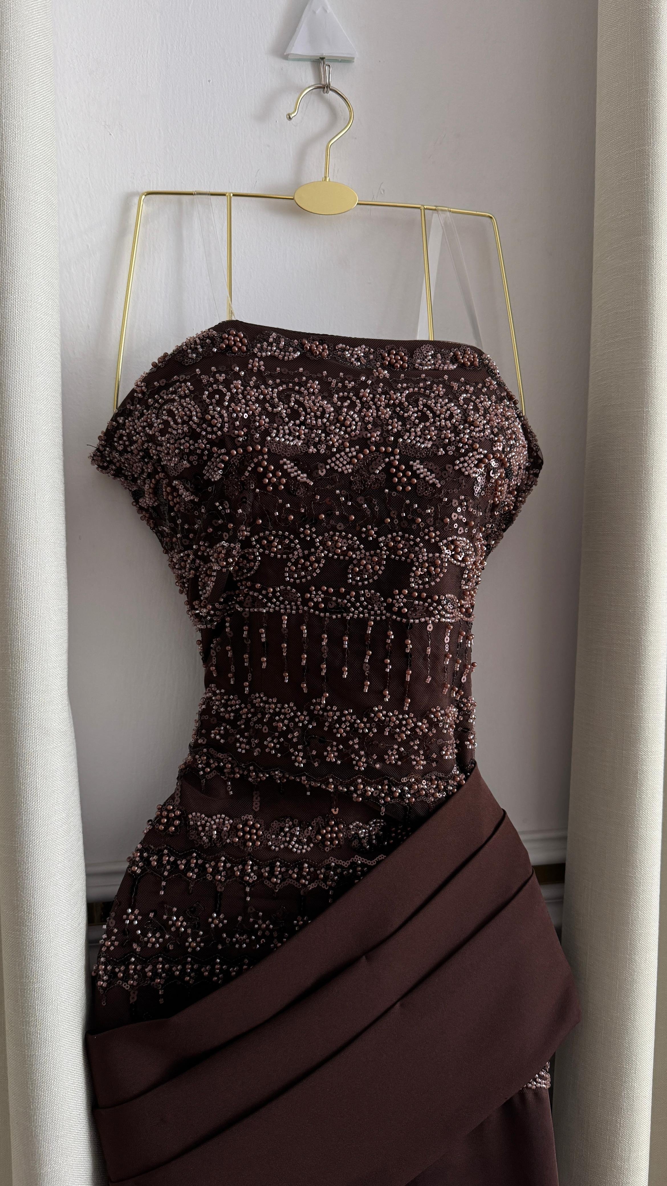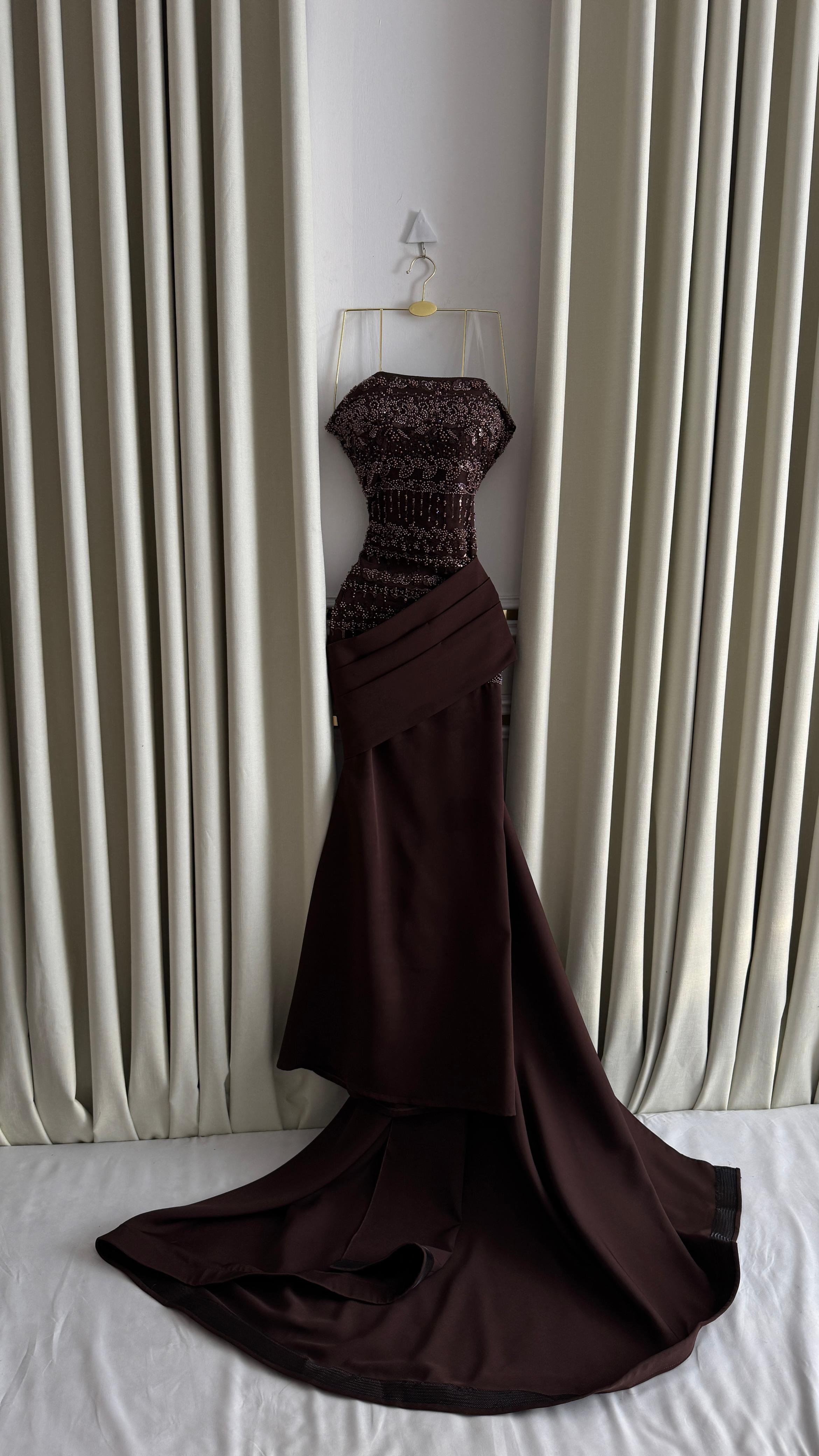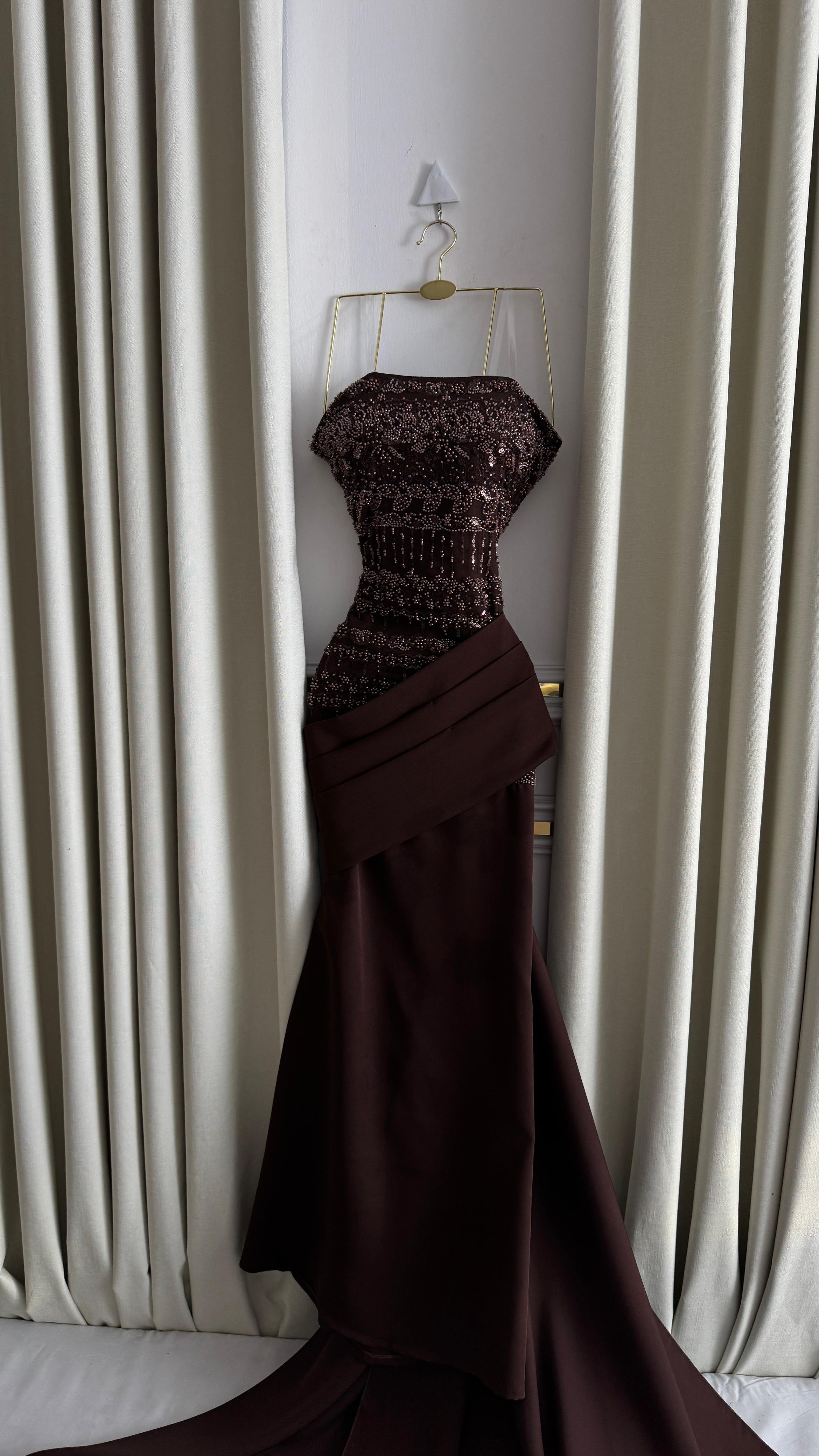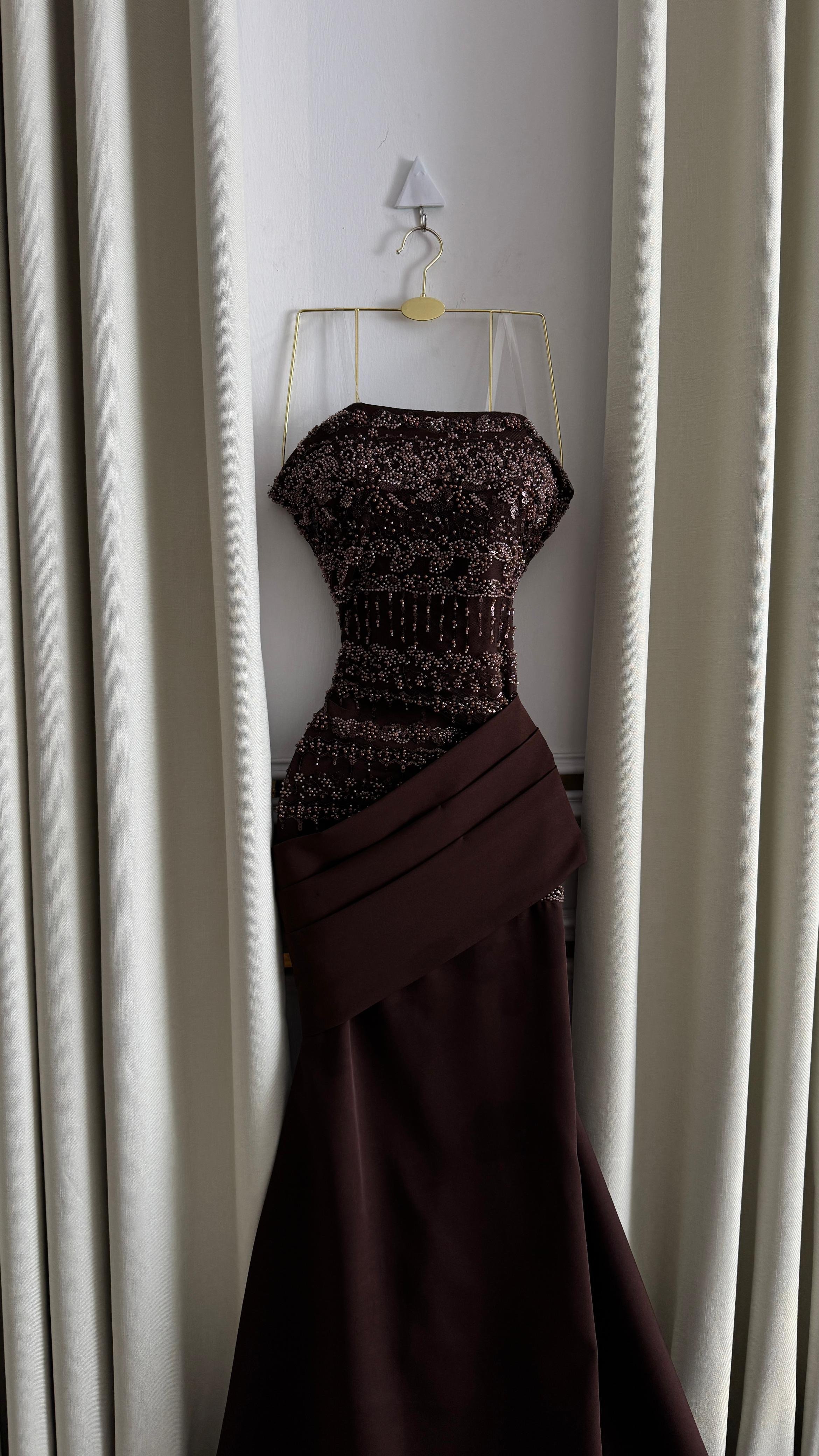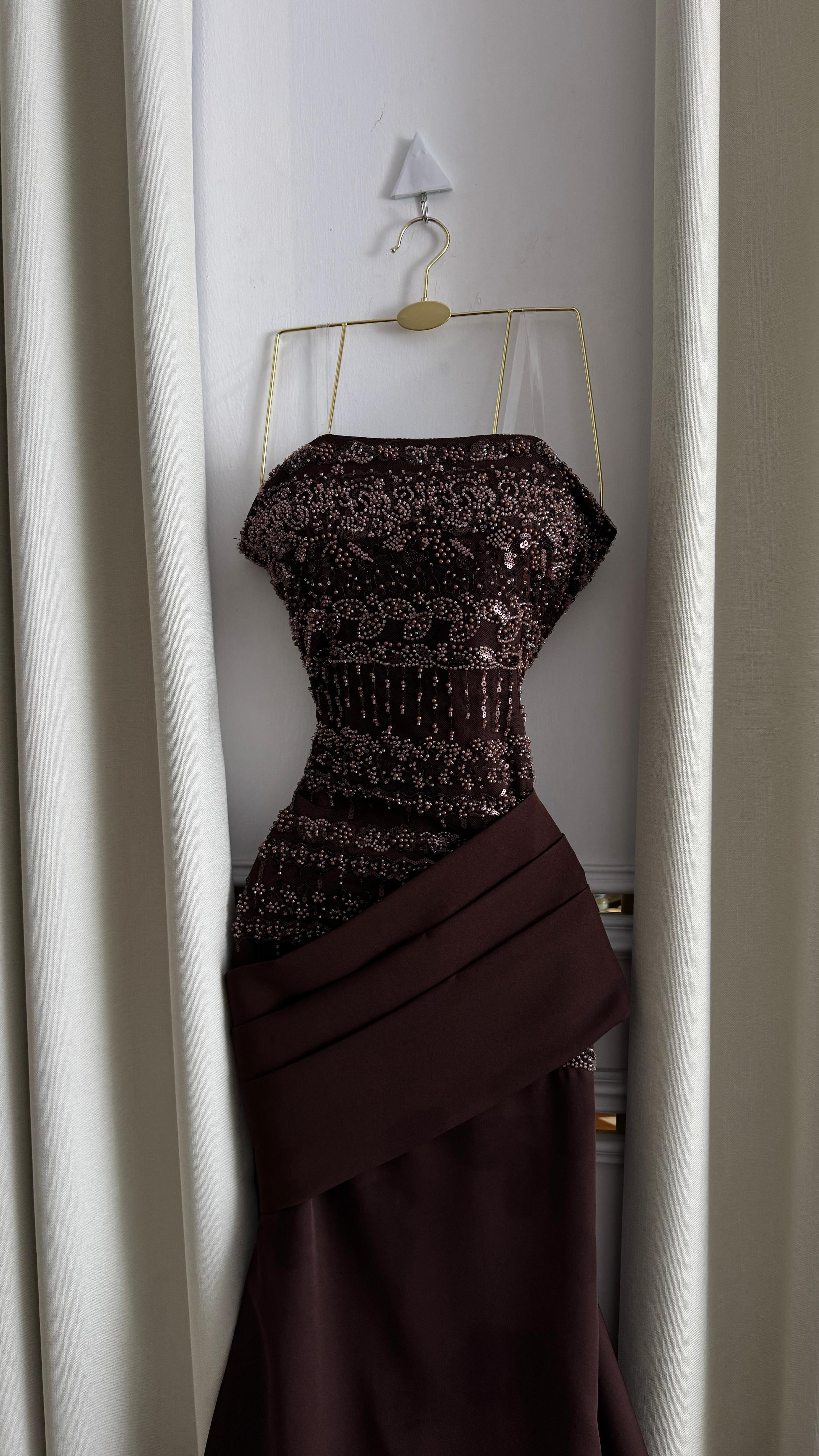 فستان سهرة بلون بني داكن يعكس الفخامة والذوق الرفيع. يتميز بصدريّة مطرزة بتفاصيل براقة تضفي لمسة ساحرة، مع تصميم ضيق يبرز جمال القوام وانسيابية الذيل الطويل ليمنحك حضوراً ملكياً. التفاف القماش على الخصر يضيف لمسة عصرية أنيقة. قطعة استثنائية تليق بأرقى المناسبات.