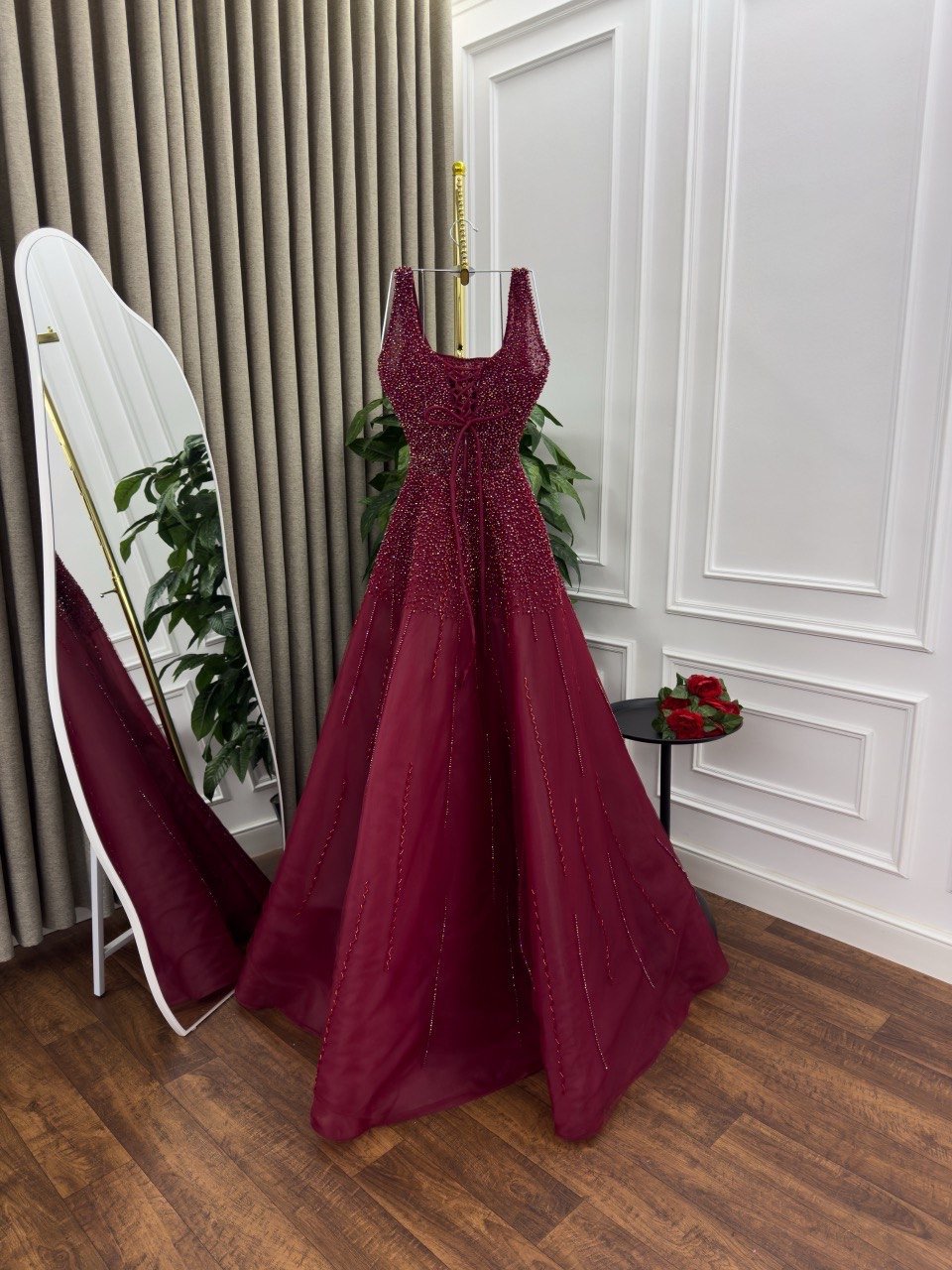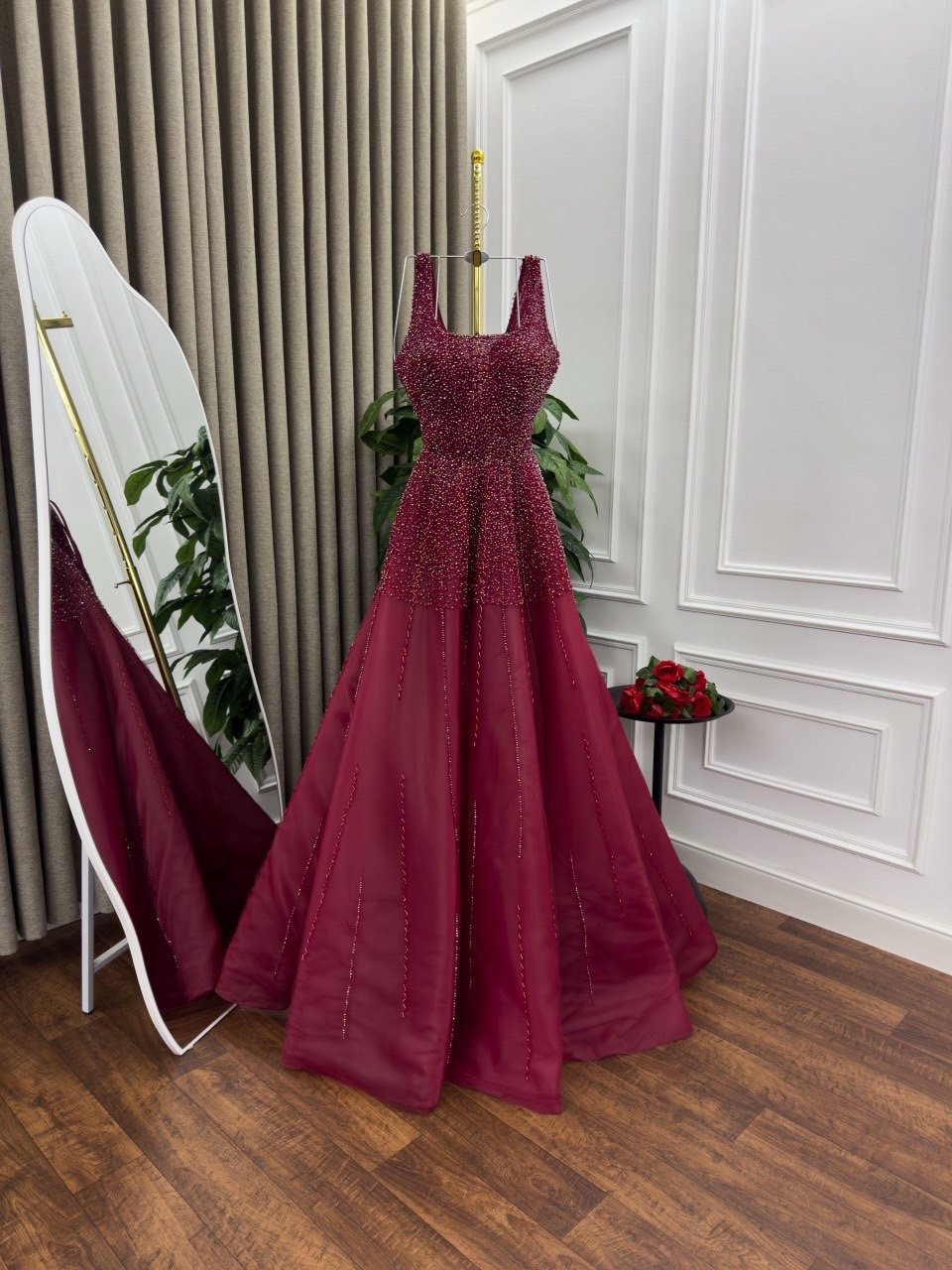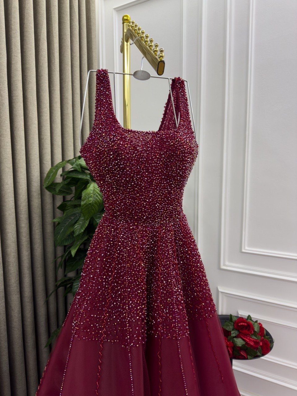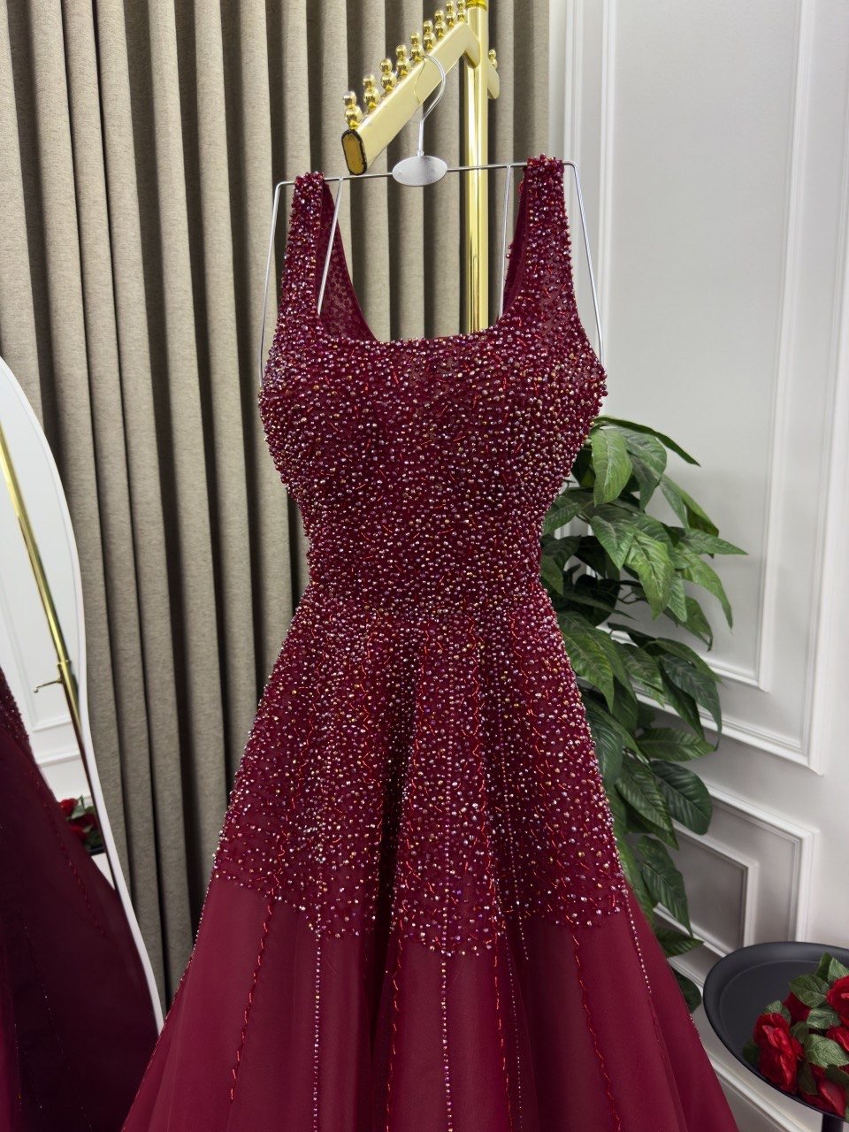 استمتعي بإطلالة ملكية مع هذا الفستان السهرة الساحر باللون العنابي، بتصميم A-Line يمنحك مظهرًا أنيقًا وانسيابيًا. يأتي الفستان بقصة صدر مربعة مع حمالات عريضة تعزز من جمال الأكتاف، بينما يغطي الجزء العلوي بالكامل بتطريز فاخر من الخرز والترتر اللامع بتدرجات دافئة تضيف له لمسة فاخرة تخطف الأنظار. يمتد التطريز بكثافة من الأعلى إلى بداية التنورة، ثم يتدرج ليندمج بسلاسة مع التول الشفاف الناعم، ما يضفي لمسة رومانسية جذابة.