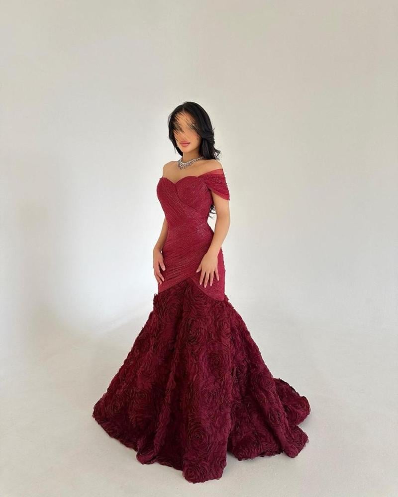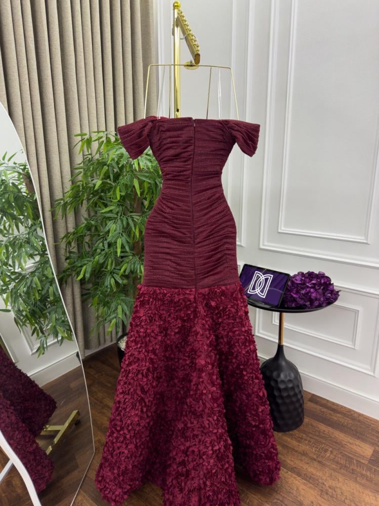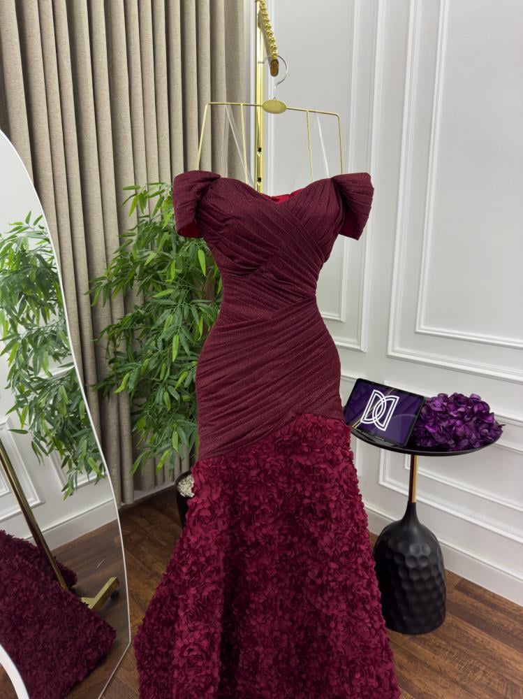 استعدي للتألق بإطلالة لا مثيل لها مع هذا الفستان العنابي الساحر، المصمم بقصة حورية تبرز جمال القوام بأنوثة راقية. الجزء العلوي يأتي بخامة لامعة تلف الجسم بانسيابية، بينما تنورة الفستان مصنوعة من ورود بارزة ثلاثية الأبعاد تمنحك فخامة ملكية في كل خطوة.