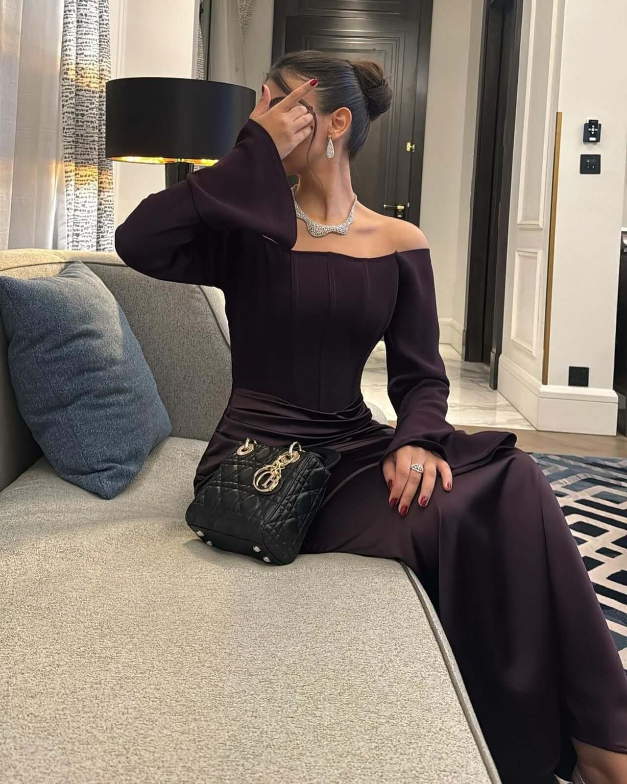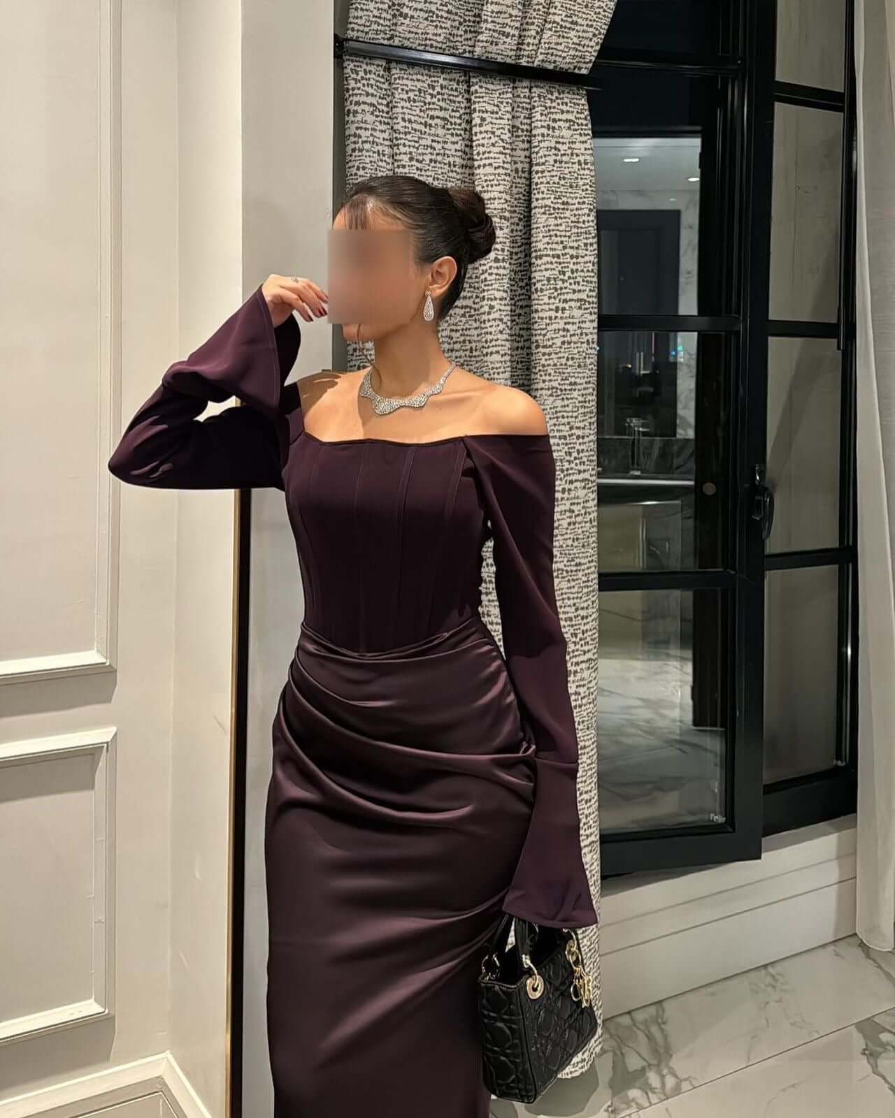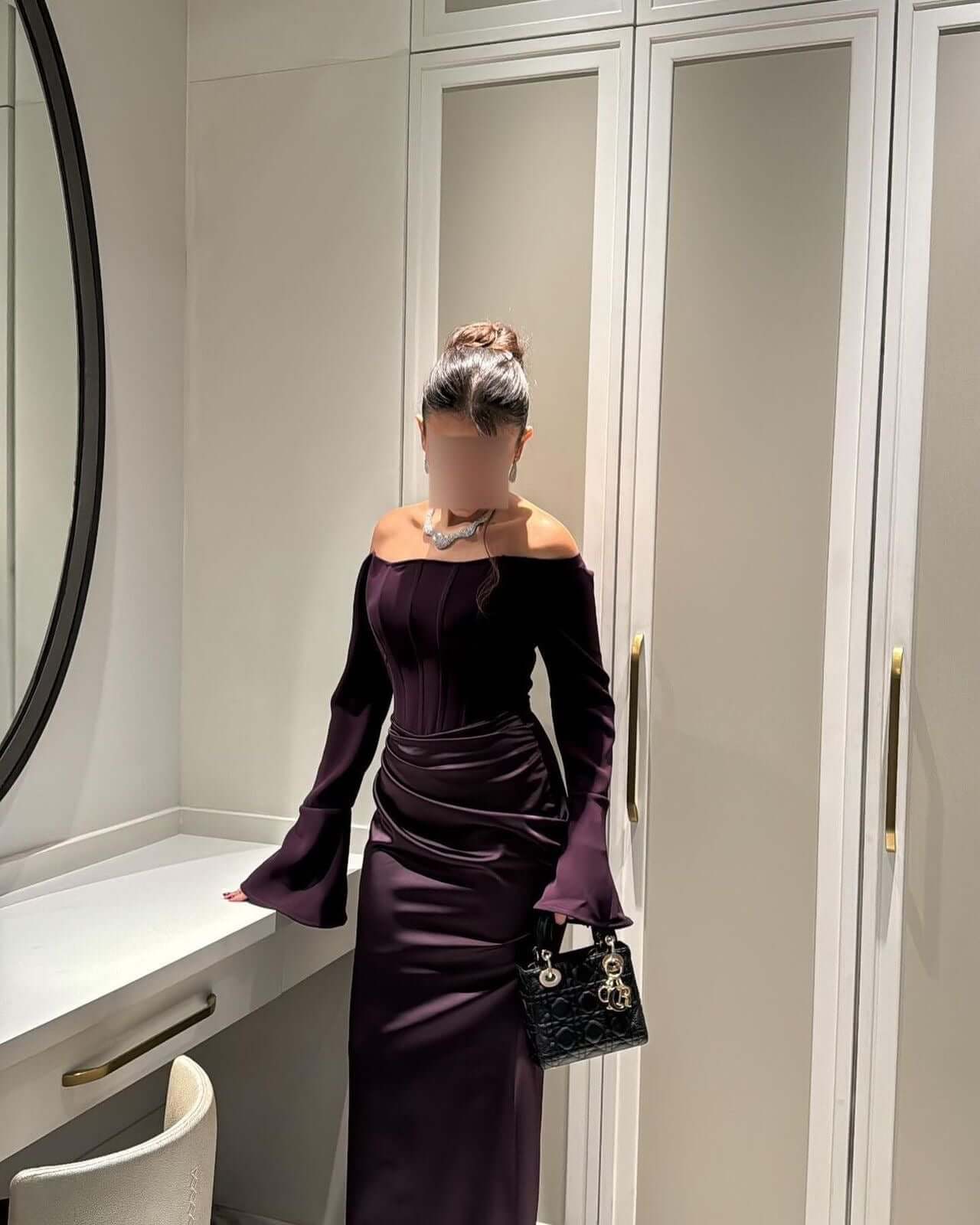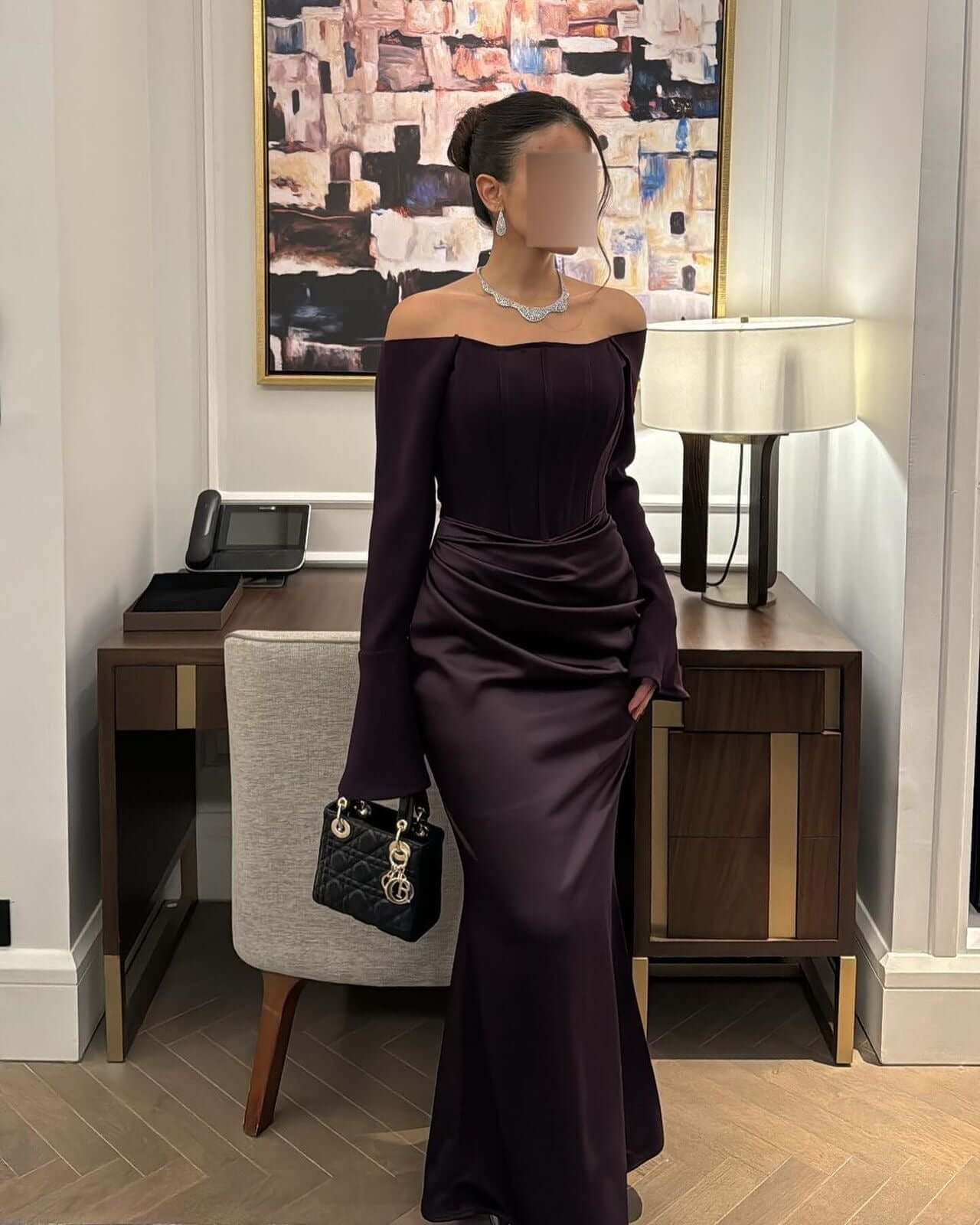 فستان سهرة فاخر بلون بنفسجي داكن بتصميم أوف شولدر أنيق وأكمام طويلة واسعة عند المعصم، مع قصة ضيقة وانسيابية تبرز جمال القوام. يتميز بتفاصيل خصر ملفوفة تضيف لمسة راقية، مما يجعله خيارًا مثاليًا للمناسبات الراقية والسهرات المميزة.