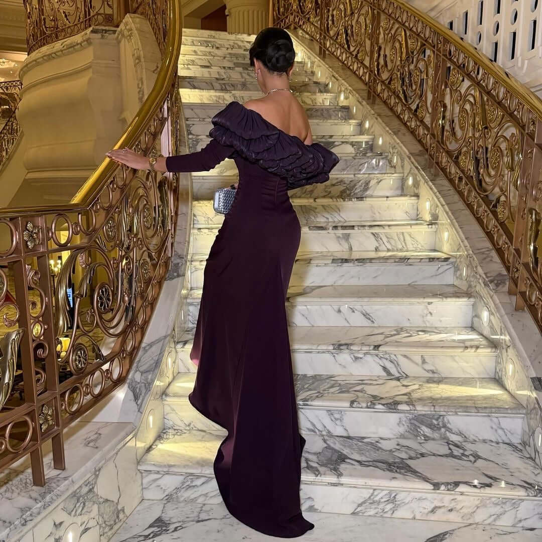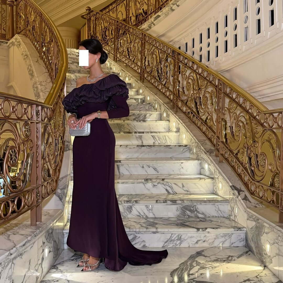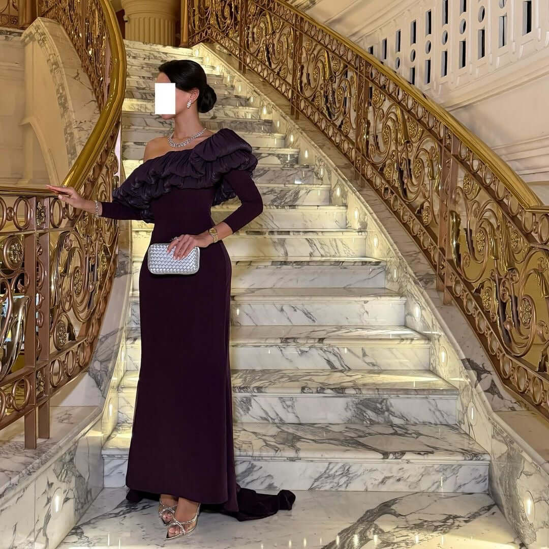فستان سهرة فاخر بلون بنفسجي داكن، بتصميم كتف واحد مزين بكشاكش أنيقة تضيف لمسة درامية راقية. قصة ضيقة تبرز جمال القوام مع ذيل خفيف من الخلف لإطلالة ملكية مبهرة، مثالي للمناسبات الفاخرة.