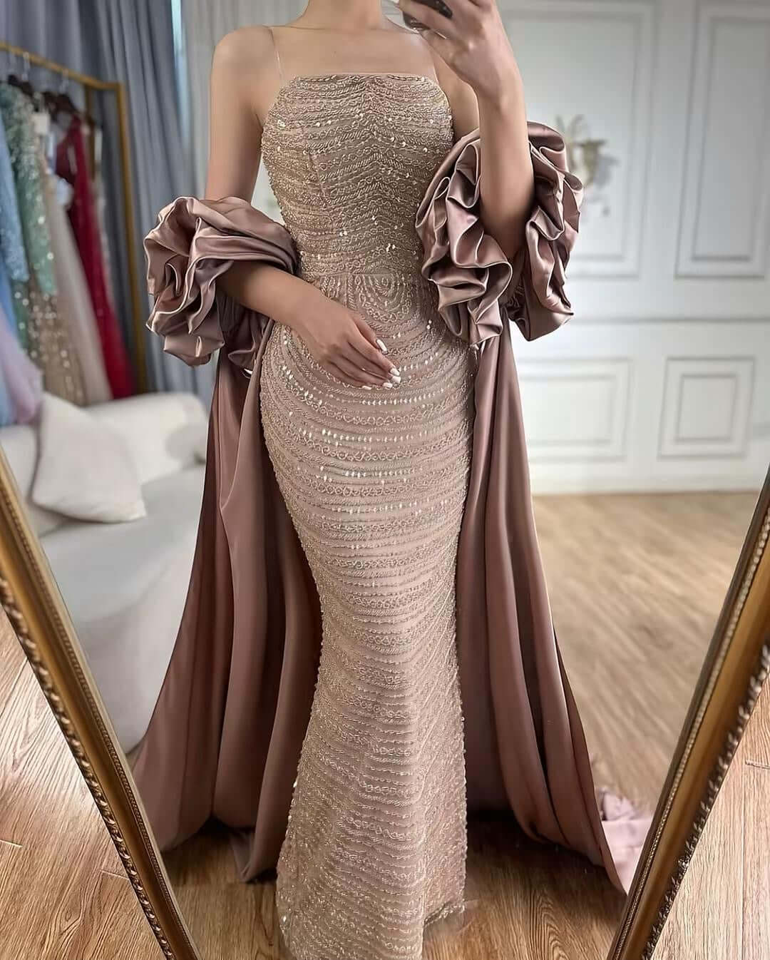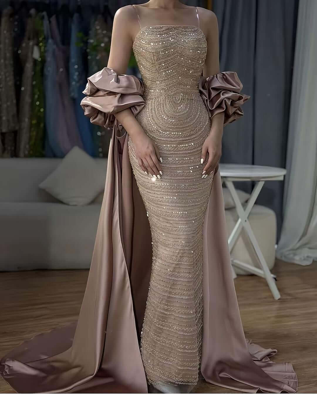 تألقي بإطلالة ملكية مع هذا الفستان الذهبي اللامع المصمم بقصة ضيقة تبرز جمال القوام. يتميز بتطريز لامع فاخر يضفي لمسة من الفخامة، ويأتي مع عباءة ساتان فاخرة ذات أكمام واسعة تضيف بعدًا راقيًا للإطلالة. خيار مثالي لحفلات الزفاف والمناسبات الفاخرة، ويمكن تنسيقه مع إكسسوارات معدنية أو مرصعة بالكريستال لمزيد من التألق.