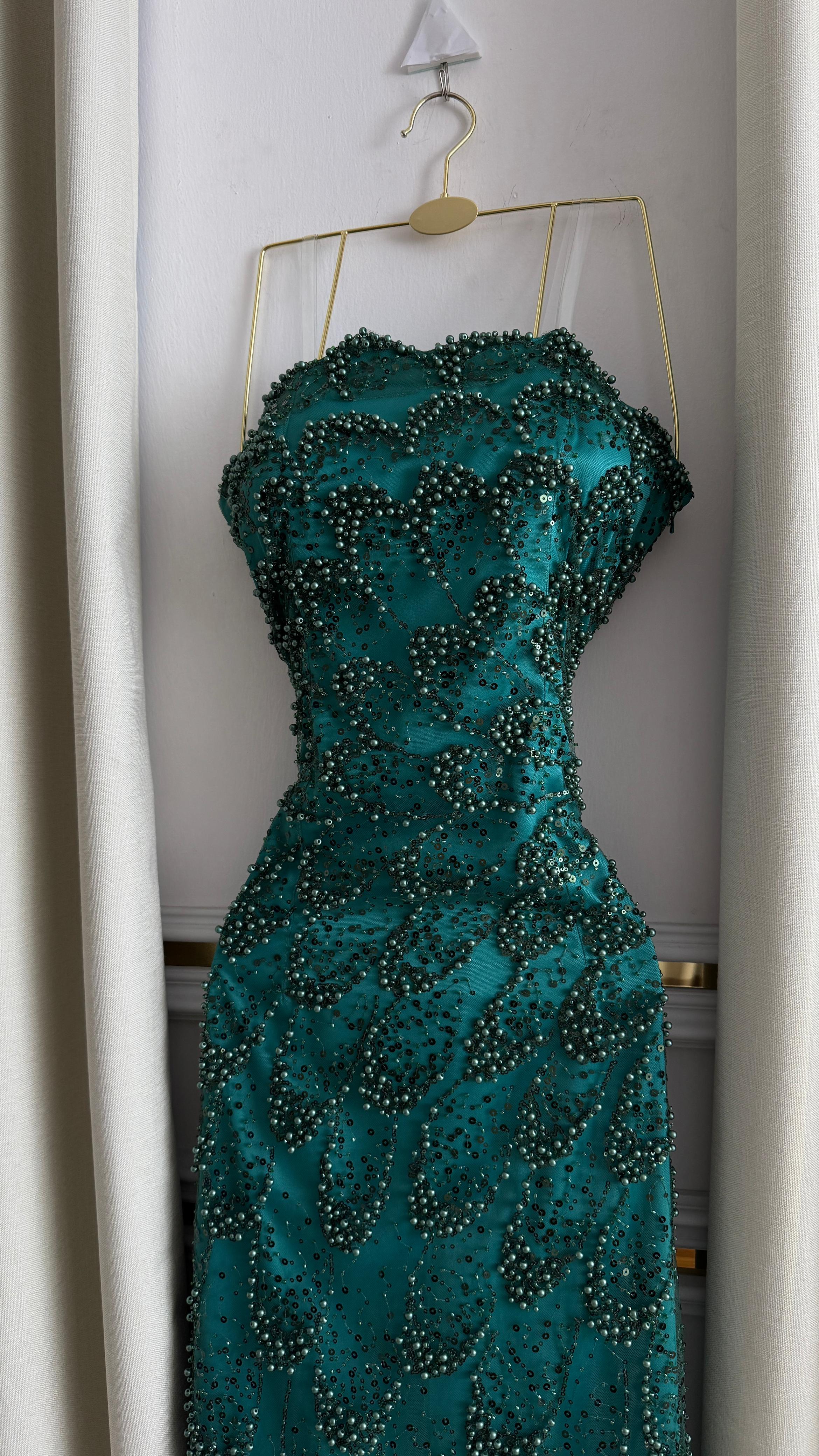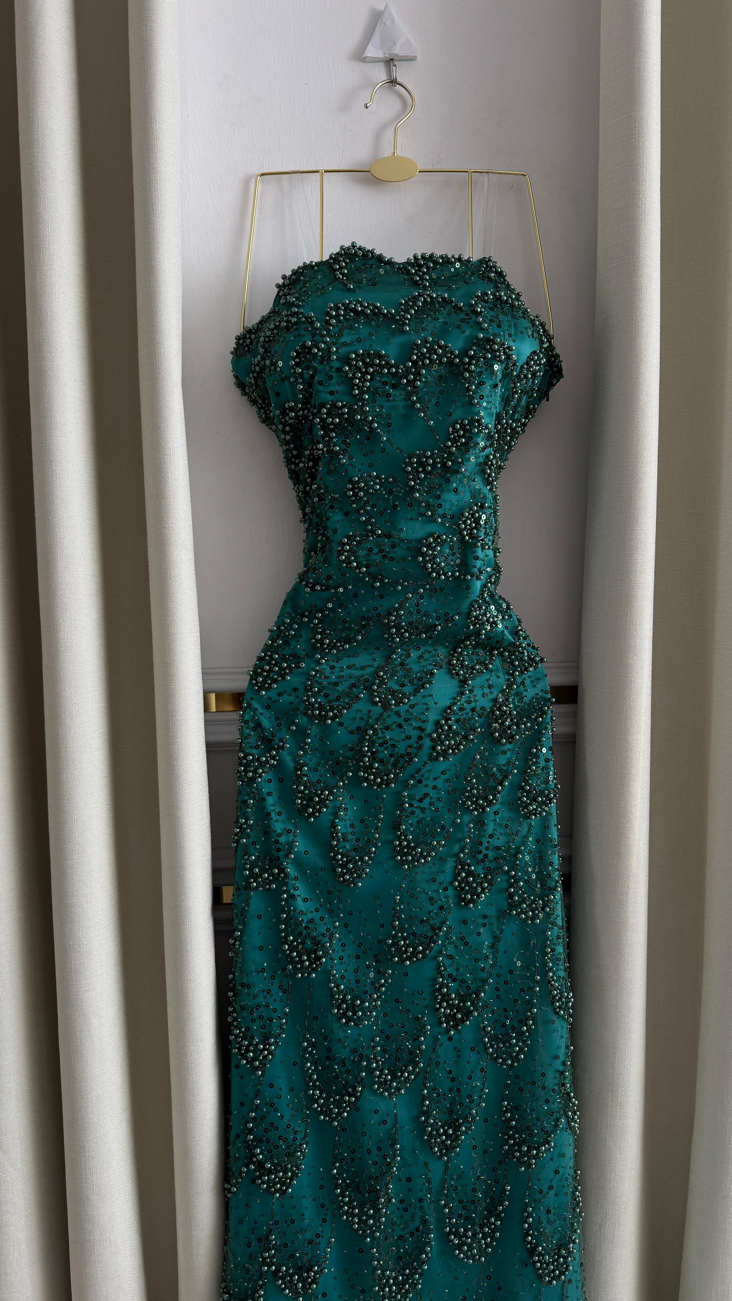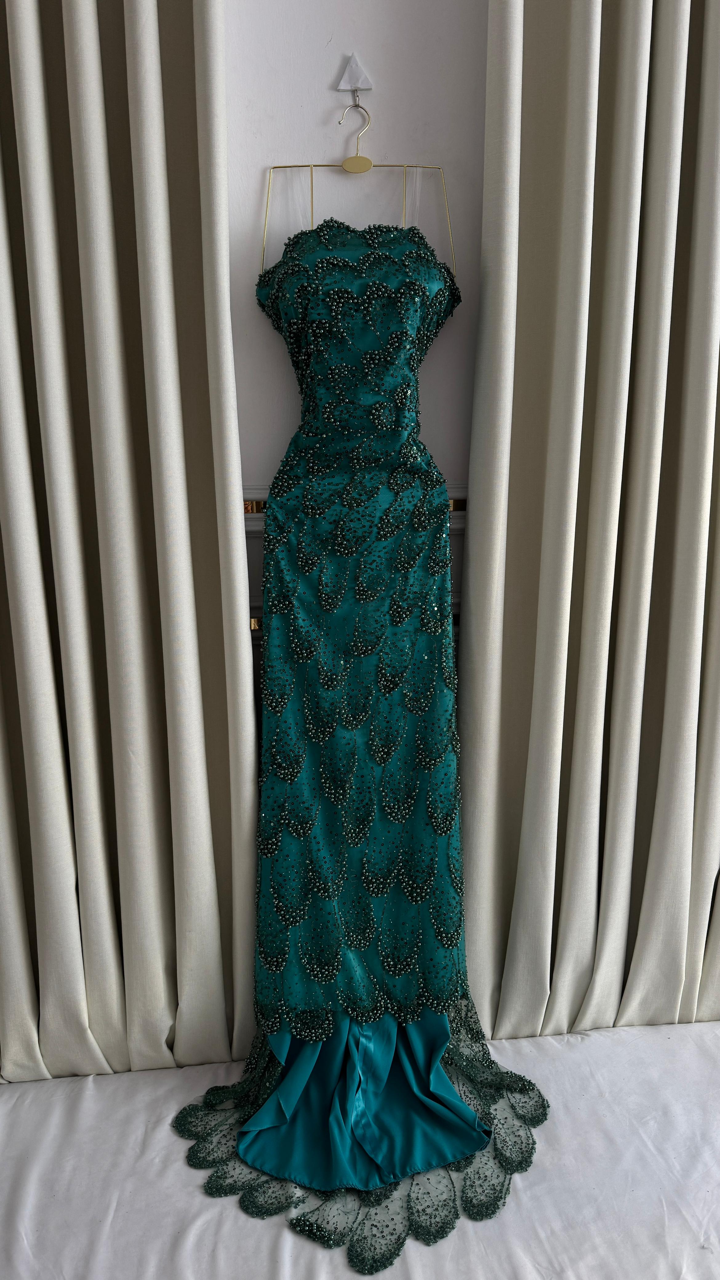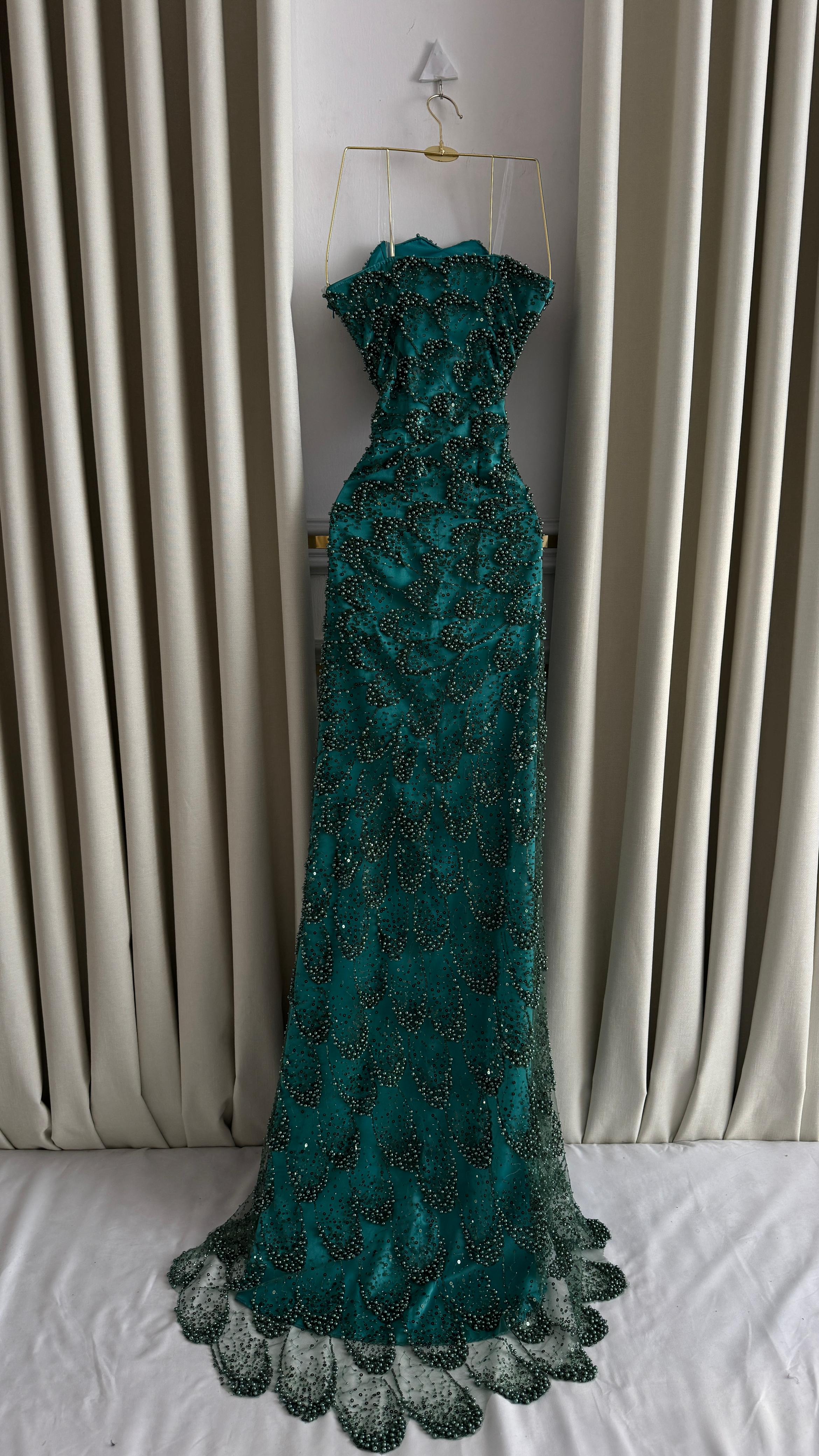 فستان سهرة أنيق باللون الأخضر الزمردي، مطرز يدويًا بالخرز اللامع بتصميم متدرج يمنح إطلالة ملكية تخطف الأنظار. يتميز بقصة ضيقة تبرز جمال القوام مع ذيل قصير يضفي لمسة فخمة.