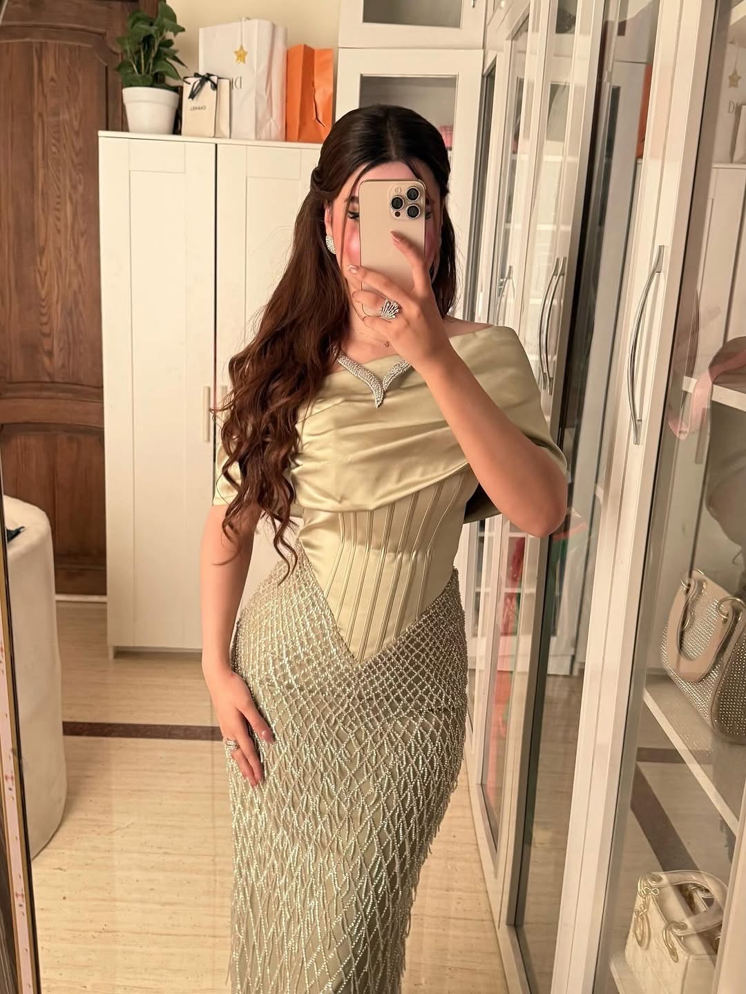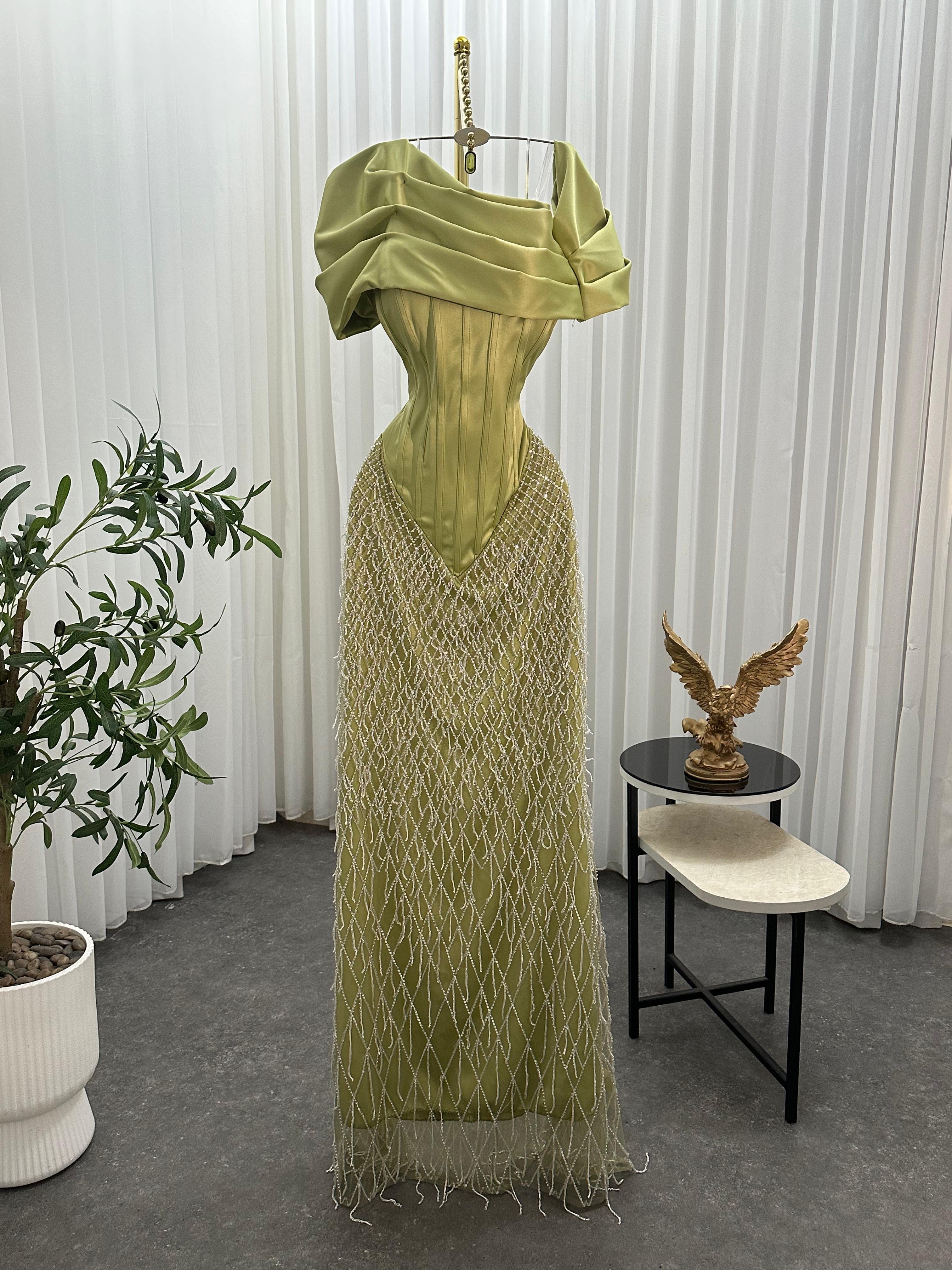 فستان سهرة أنيق باللون الأخضر الزيتي المائل للبيج، يتميز بتصميم فاخر يجمع بين الانسيابية والفخامة. الصدر مطوي بطريقة مبتكرة تمنحه لمسة ملكية، بينما يأتي الخصر مشدودًا ليبرز جمال القوام. التنورة مزدانة بتطريز شبكي متقاطع بخيوط لامعة كالألماس، تمنح الفستان بريقًا ساحرًا مع كل حركة.