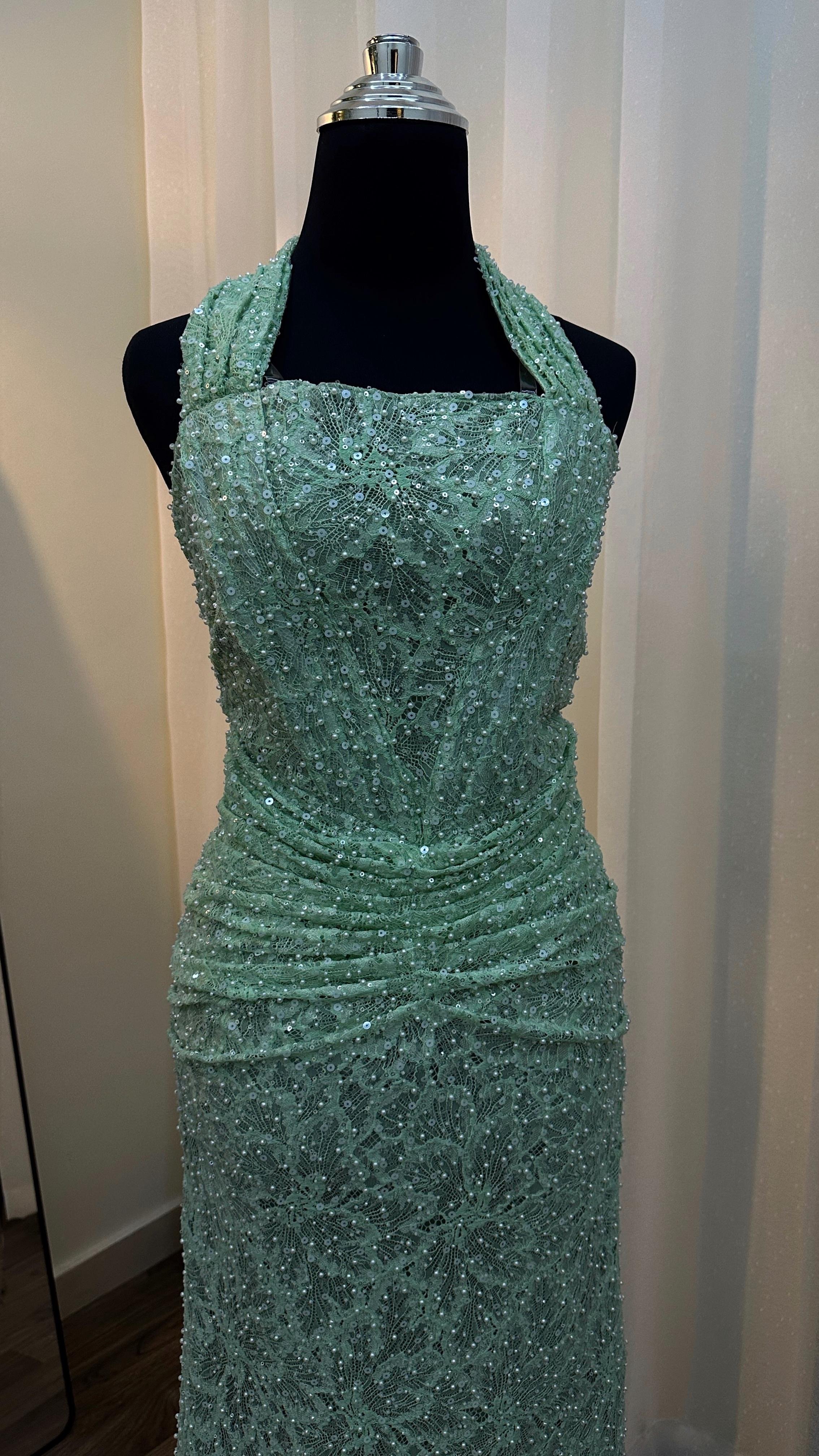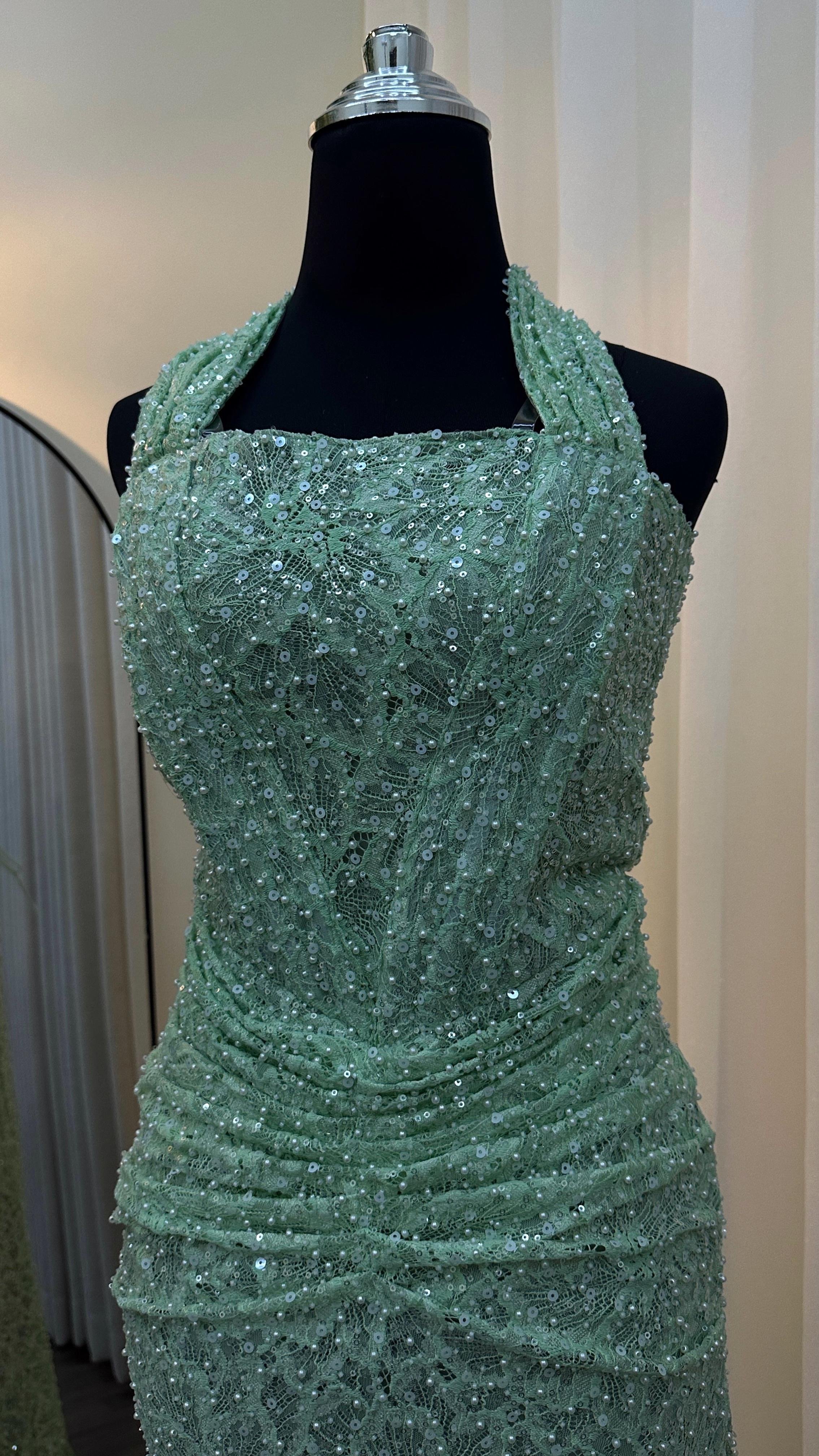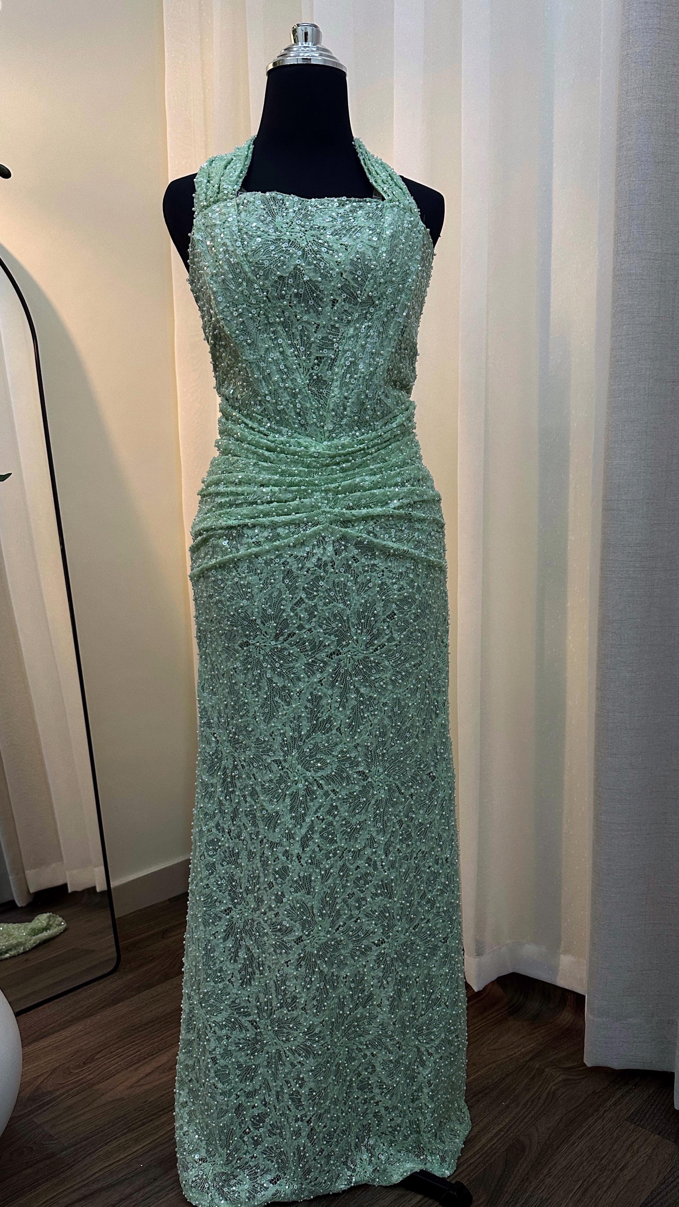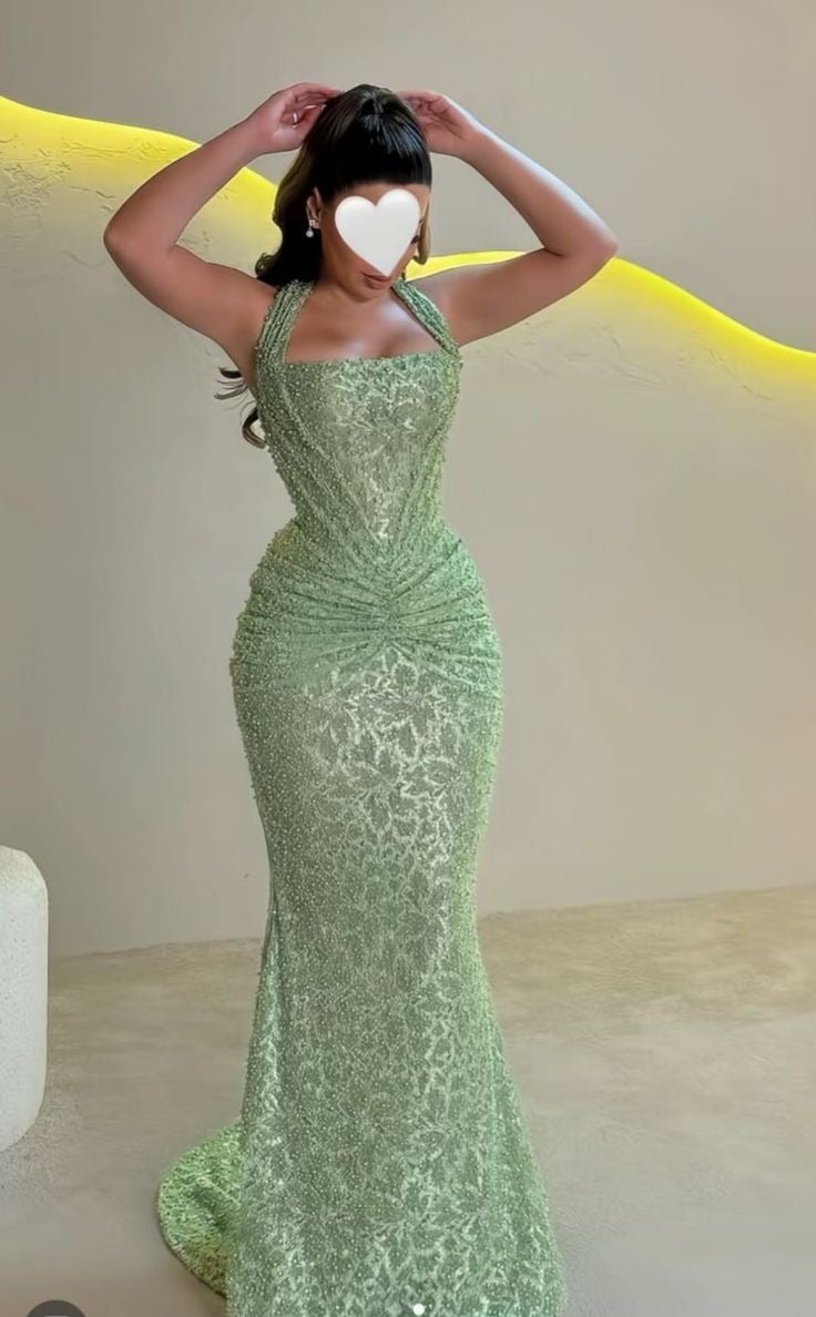 تألقي بإطلالة لا تُنسى مع هذا الفستان الأخضر الساحر المصمم بأسلوب الحورية، والذي يجمع بين الرقي والجرأة. يأتي الفستان بقماش مطرز بالكامل بالترتر اللامع الذي يعكس الضوء بشكل مدهش، ليمنحك وهجاً ناعماً يشبه إشراقة النجوم. القصة الضيقة المصممة باحتراف تبرز جمال القوام الأنثوي، بينما يضيف التصميم المجمع عند الخصر لمسة نحافة وأناقة إضافية. الحمالات العريضة والصدر المربّع يعكسان ثقة وفخامة، مما يجعله خيارًا مثاليًا للمناسبات الراقية مثل الأعراس، الحفلات، أو الليالي الخاصة.