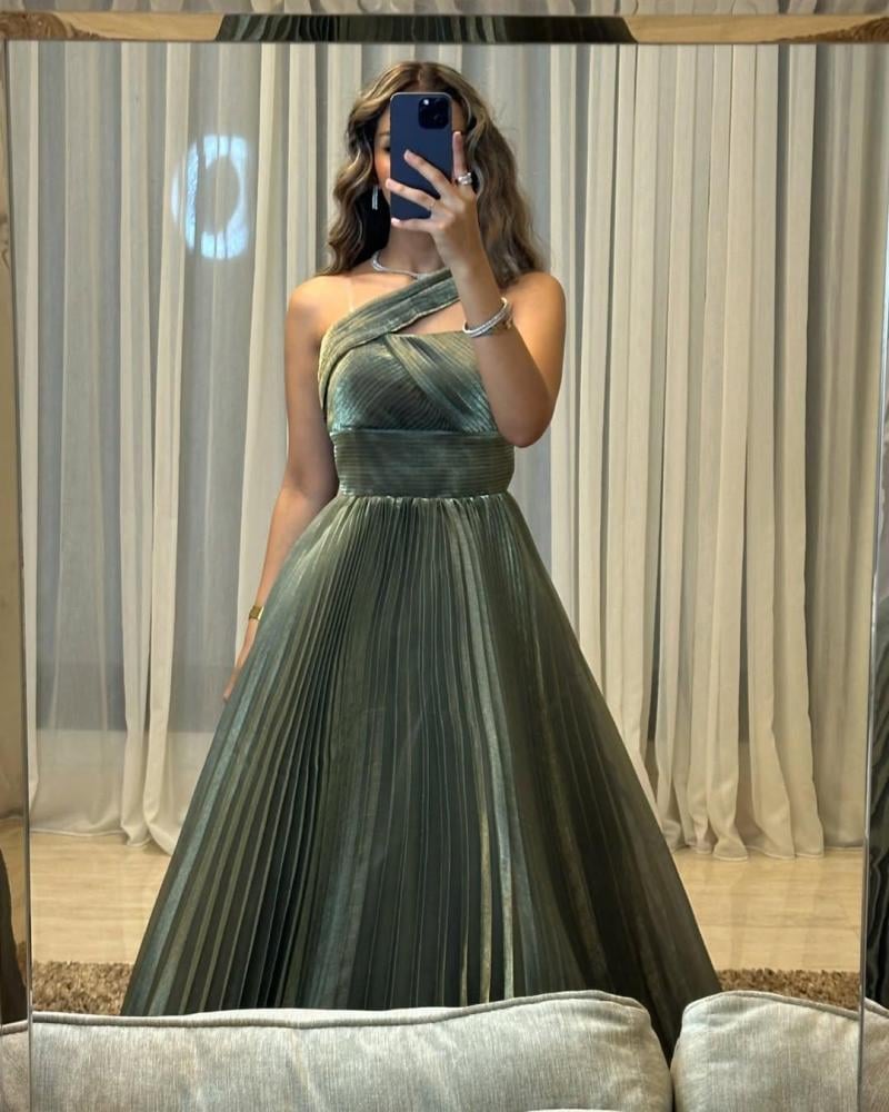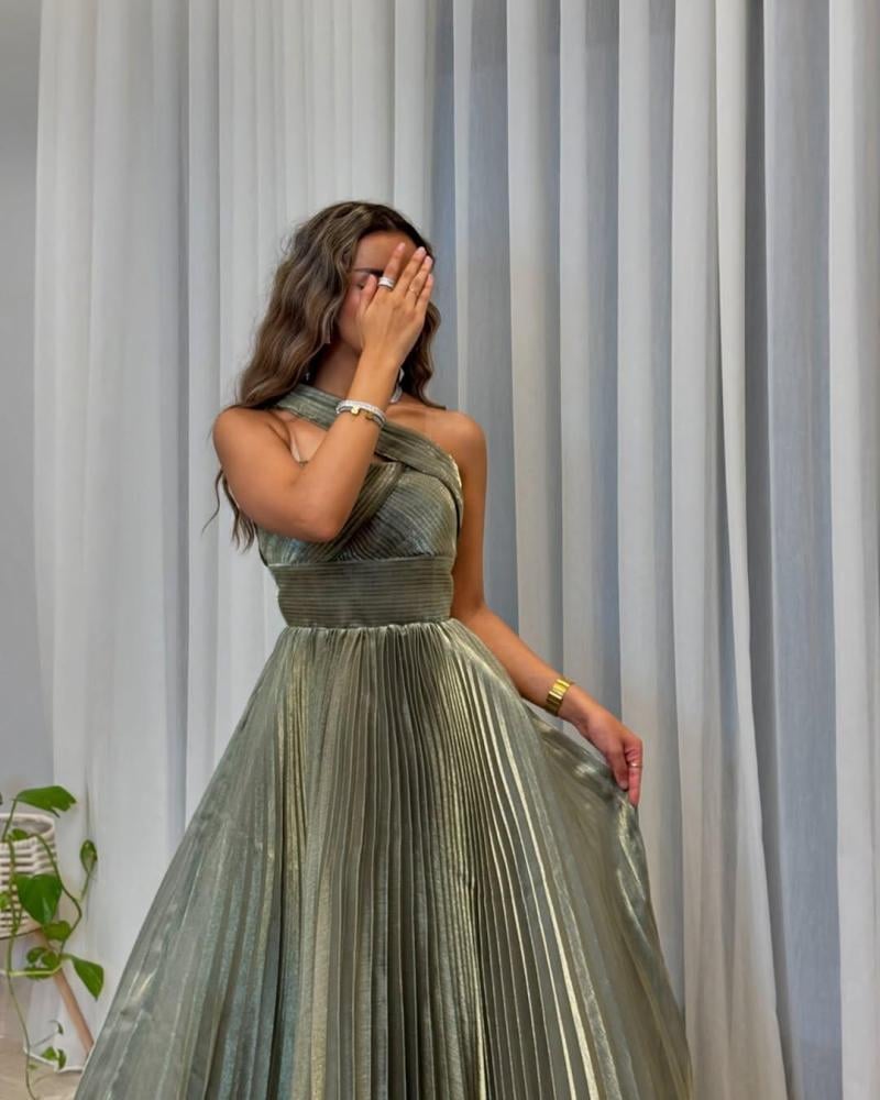 ارتدي سحر الأناقة مع هذا الفستان الأخضر الزيتي بكتف واحد وتصميم مطوي فاخر. قصّته الانسيابية تبرز جمال القوام وتمنحك حضوراً ملكياً يخطف الأنظار في كل مناسبة. قماش فاخر بلمعة أنيقة، وخطوط بليسيه تضيف لمسة رقي لا مثيل لها. مثالي للأعراس، الحفلات، والمناسبات الراقية.