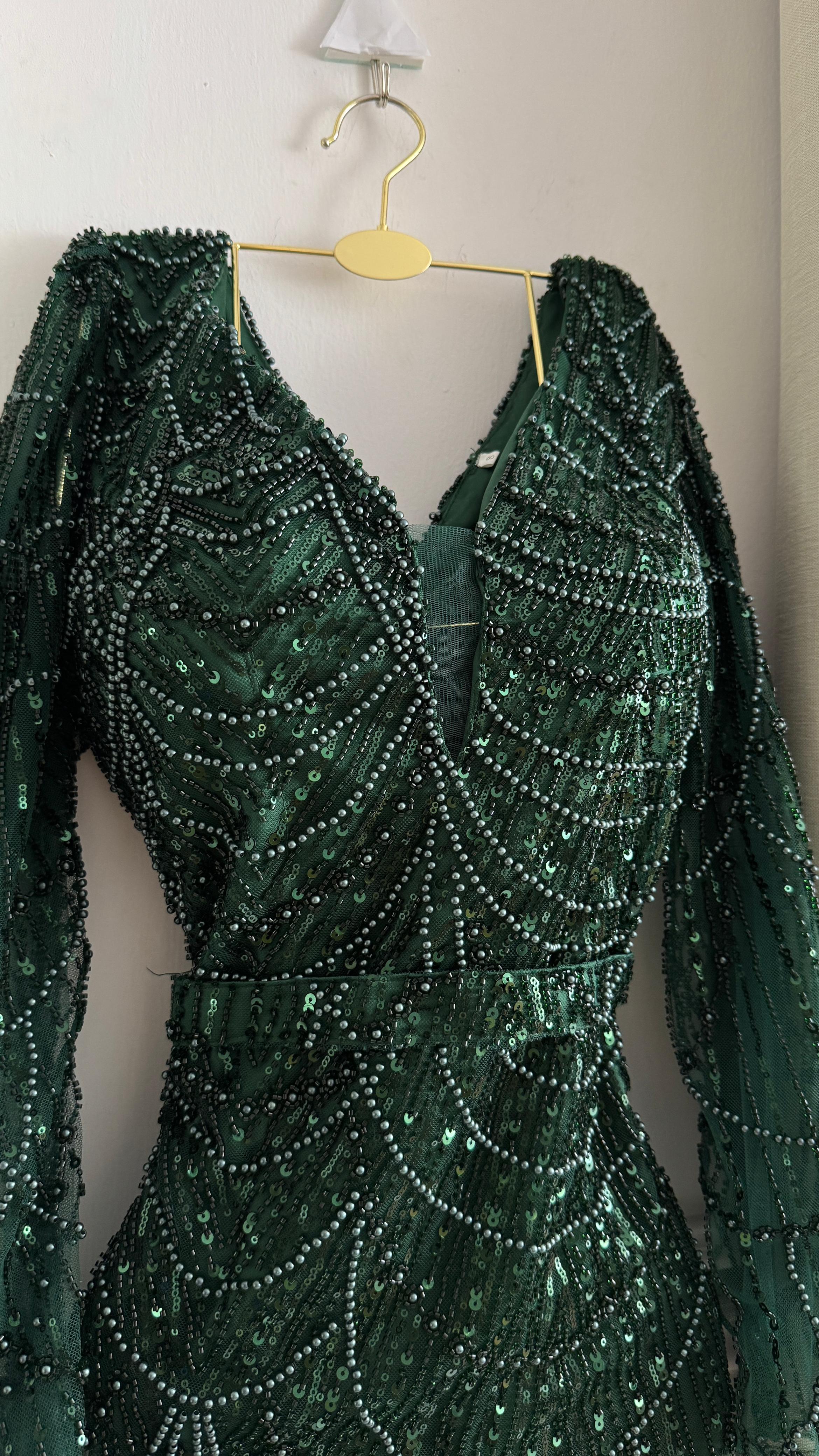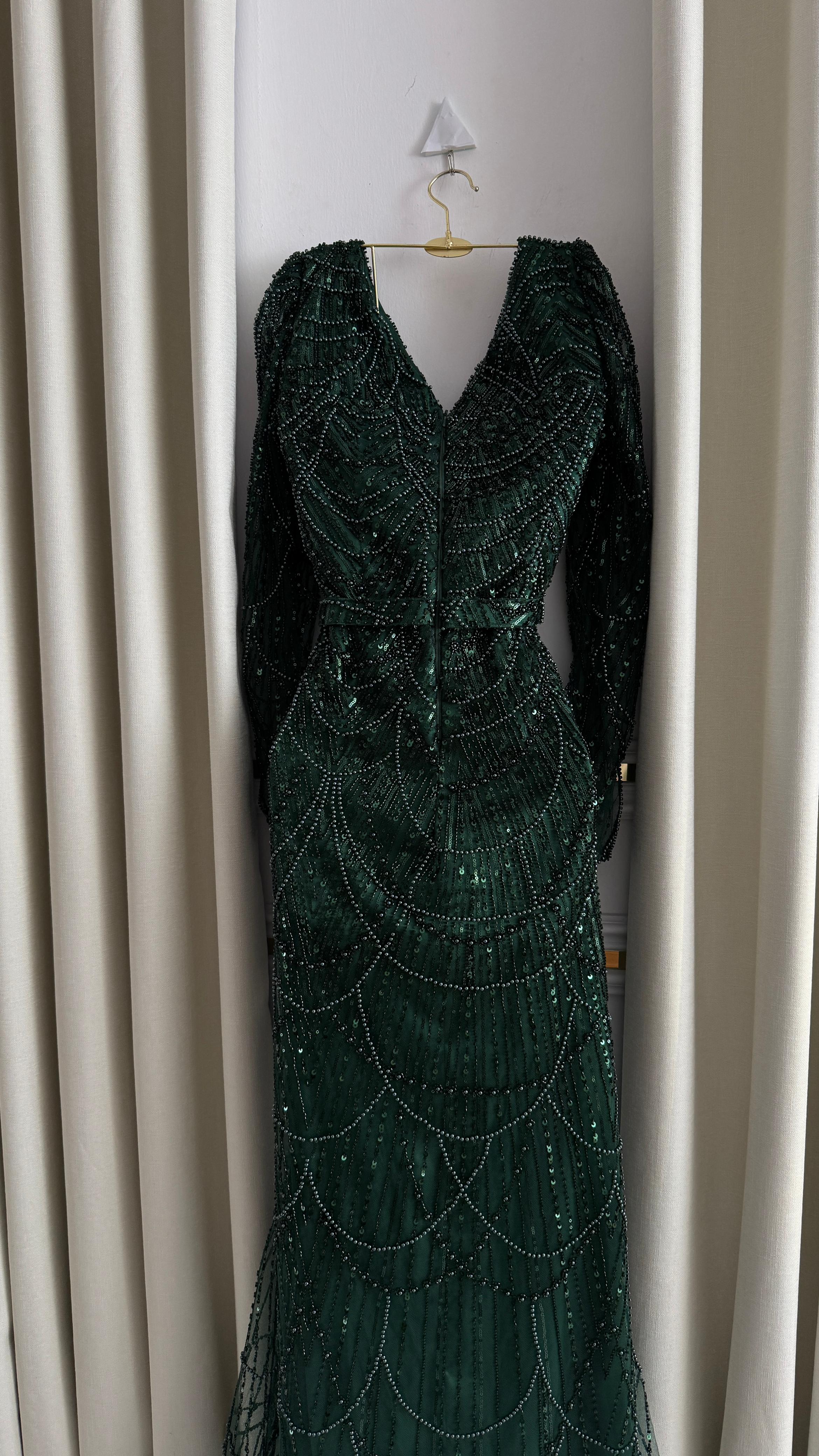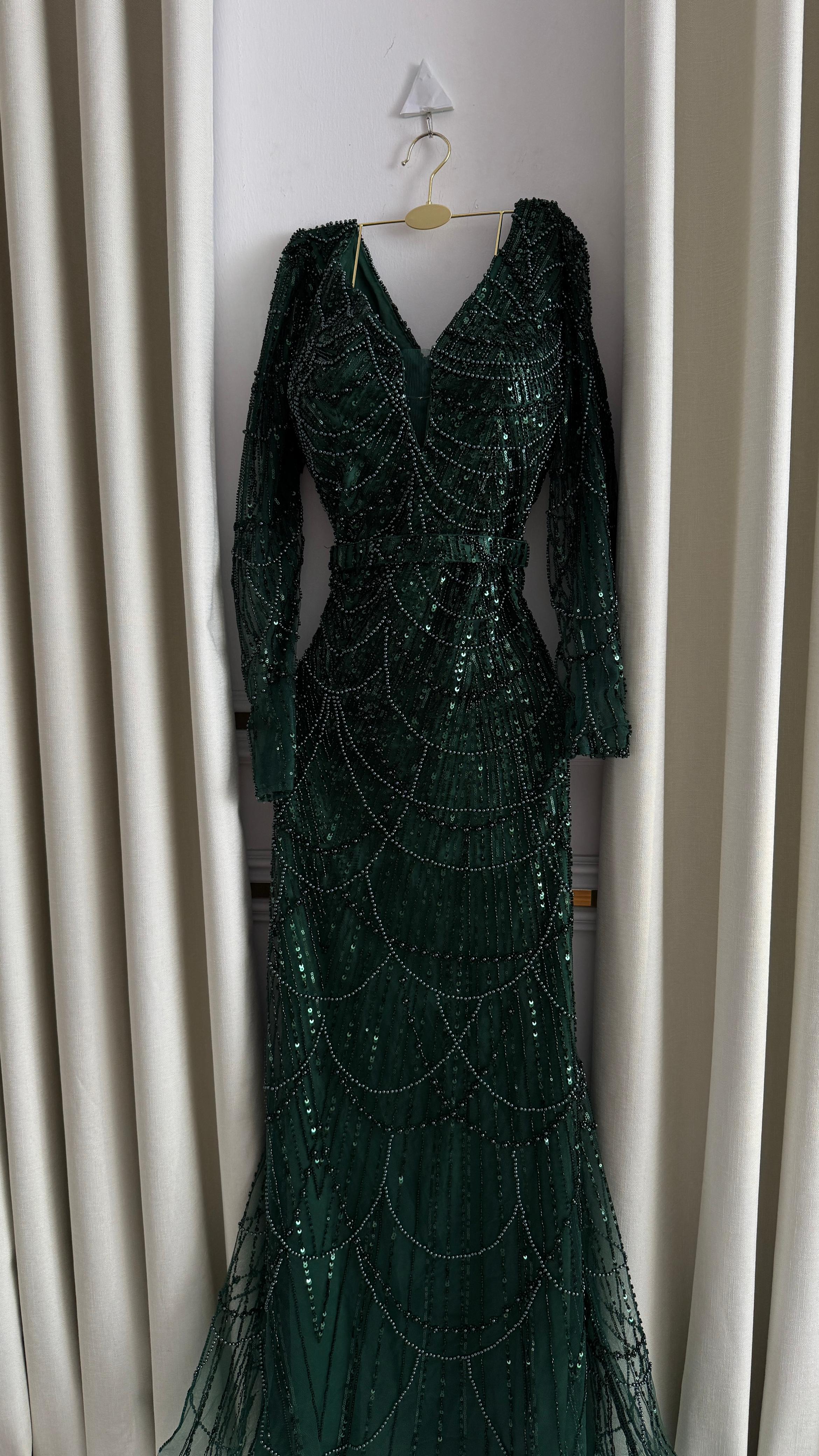 فستان سهرة أنيق بلون أخضر داكن يعكس الفخامة والجاذبية. يتميز بقصة ضيقة راقية مع فتحة صدر على شكل V تمنح إطلالة أنثوية راقية، بينما تضفي الأكمام الطويلة المطرزة لمسة من الرقي والاحتشام.
