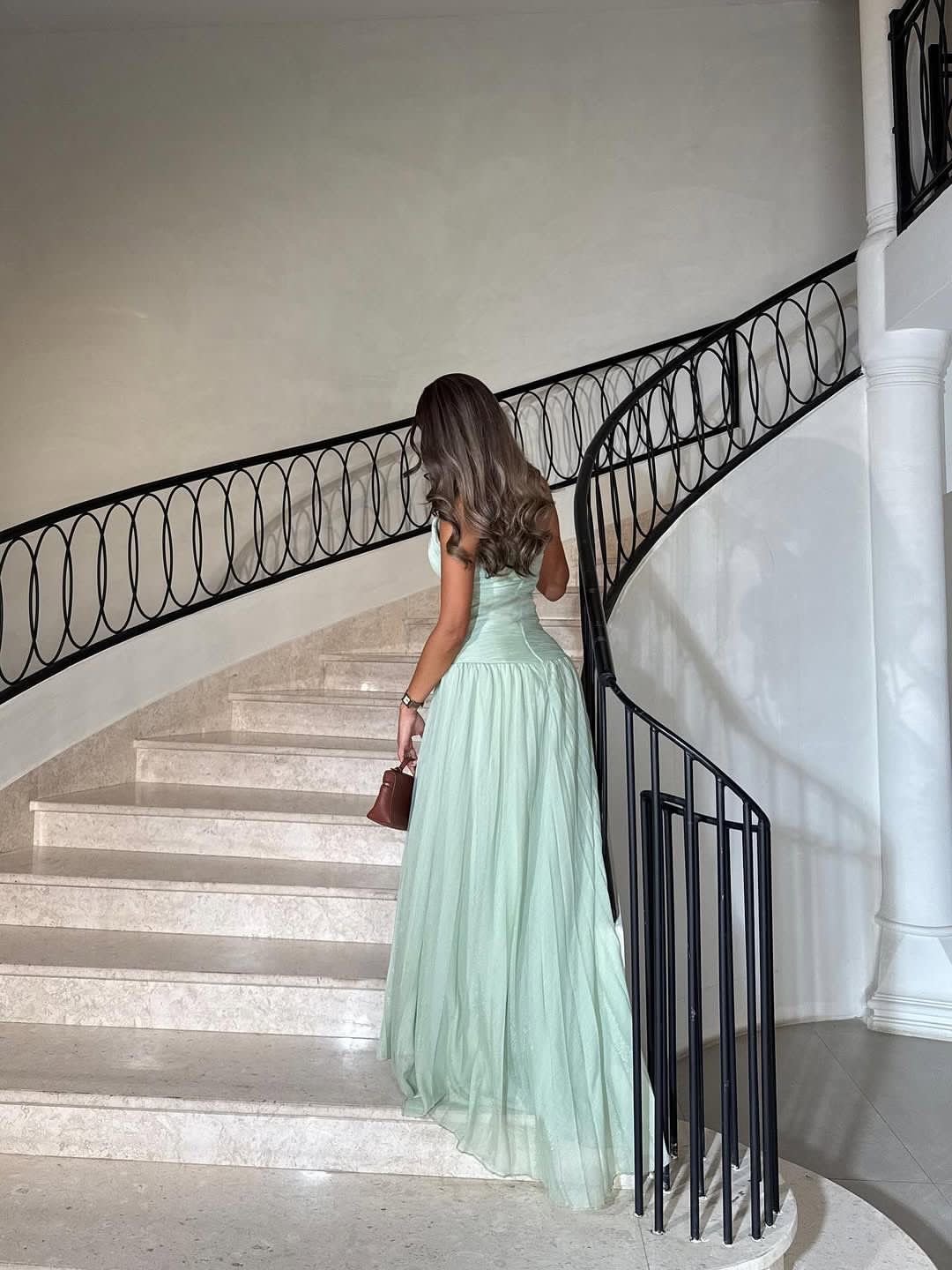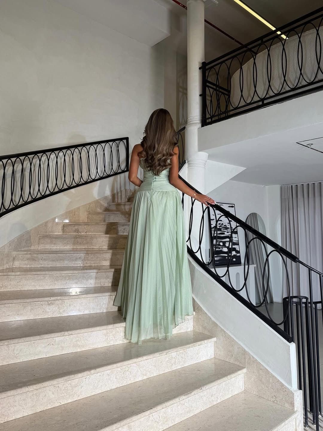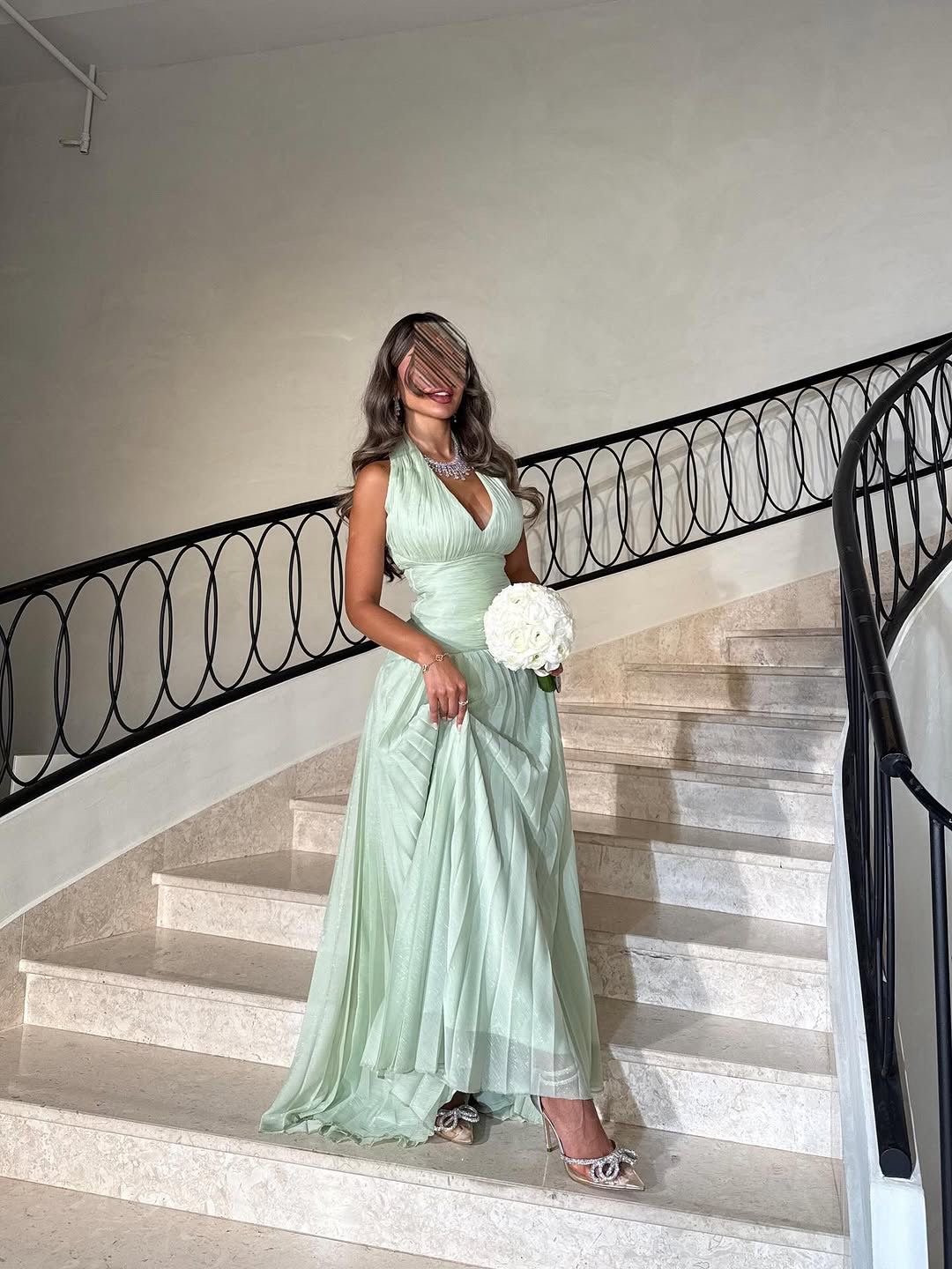 فستان سهرة باللون الأخضر الفاتح (Mint) بتصميم ناعم وأنيق، يتميز بقصة صدر متقاطعة تضفي جاذبية خاصة مع تنورة واسعة منسدلة بخفة ورقي. قماشه الخفيف ولمعته subtle تمنحك إطلالة ملكية حالمة مثالية للمناسبات الراقية وحفلات الخطوبة أو الأعراس.
