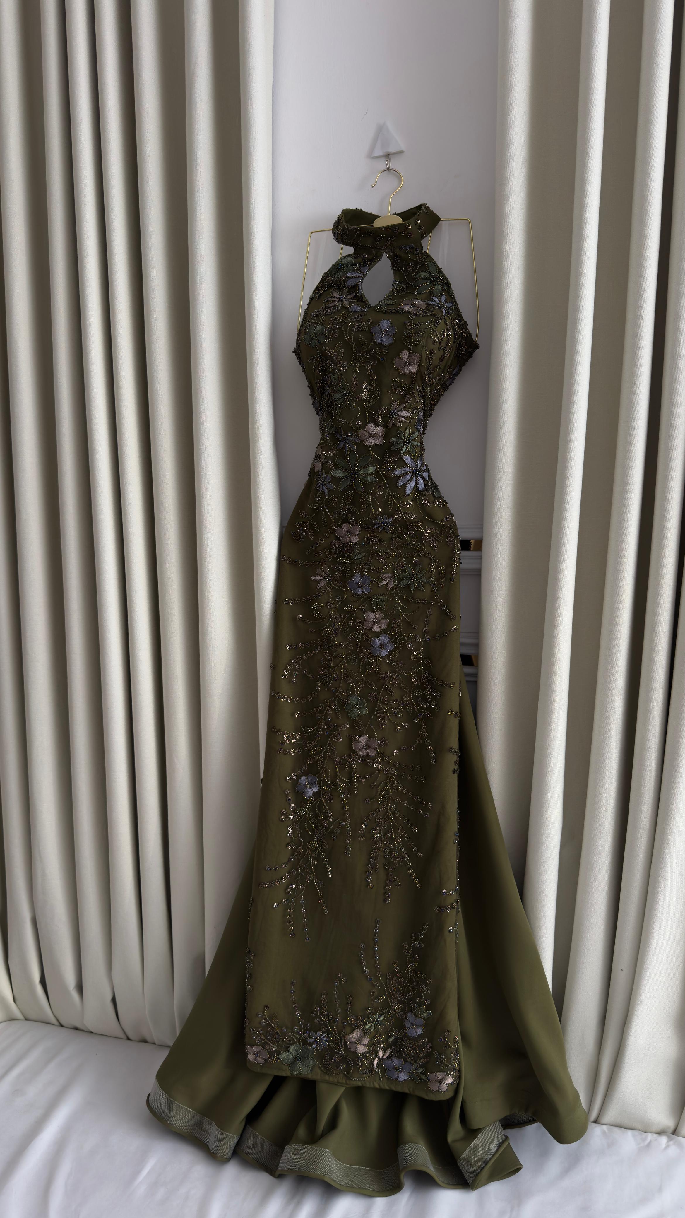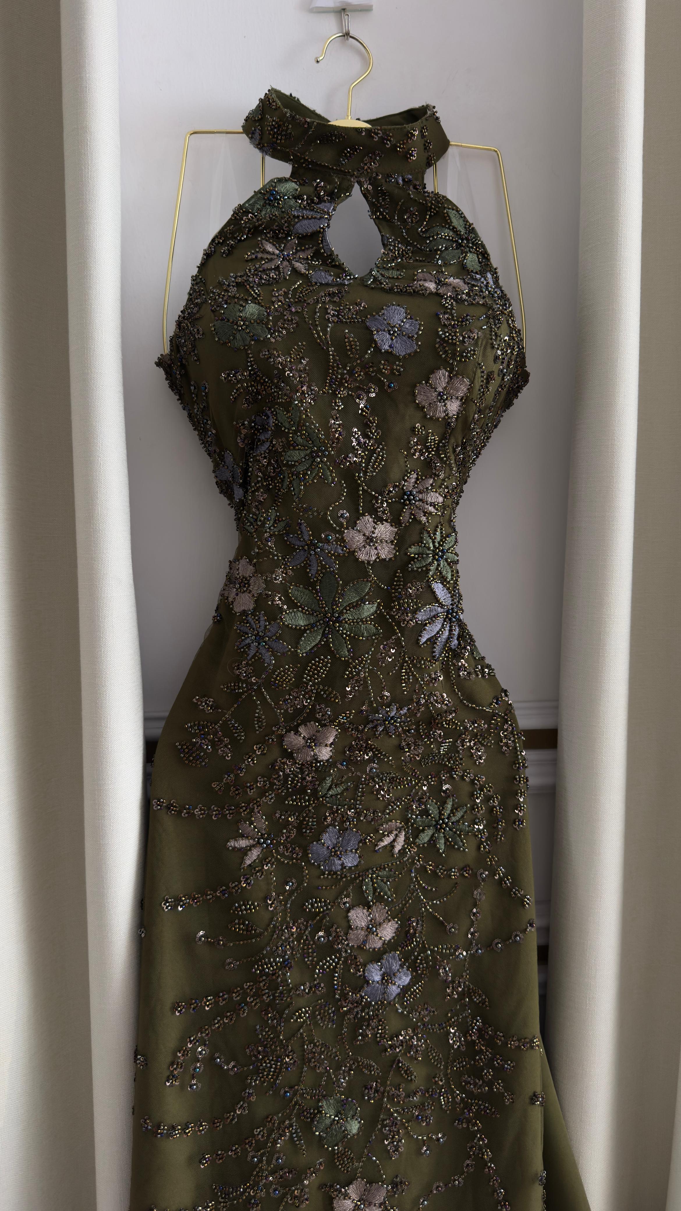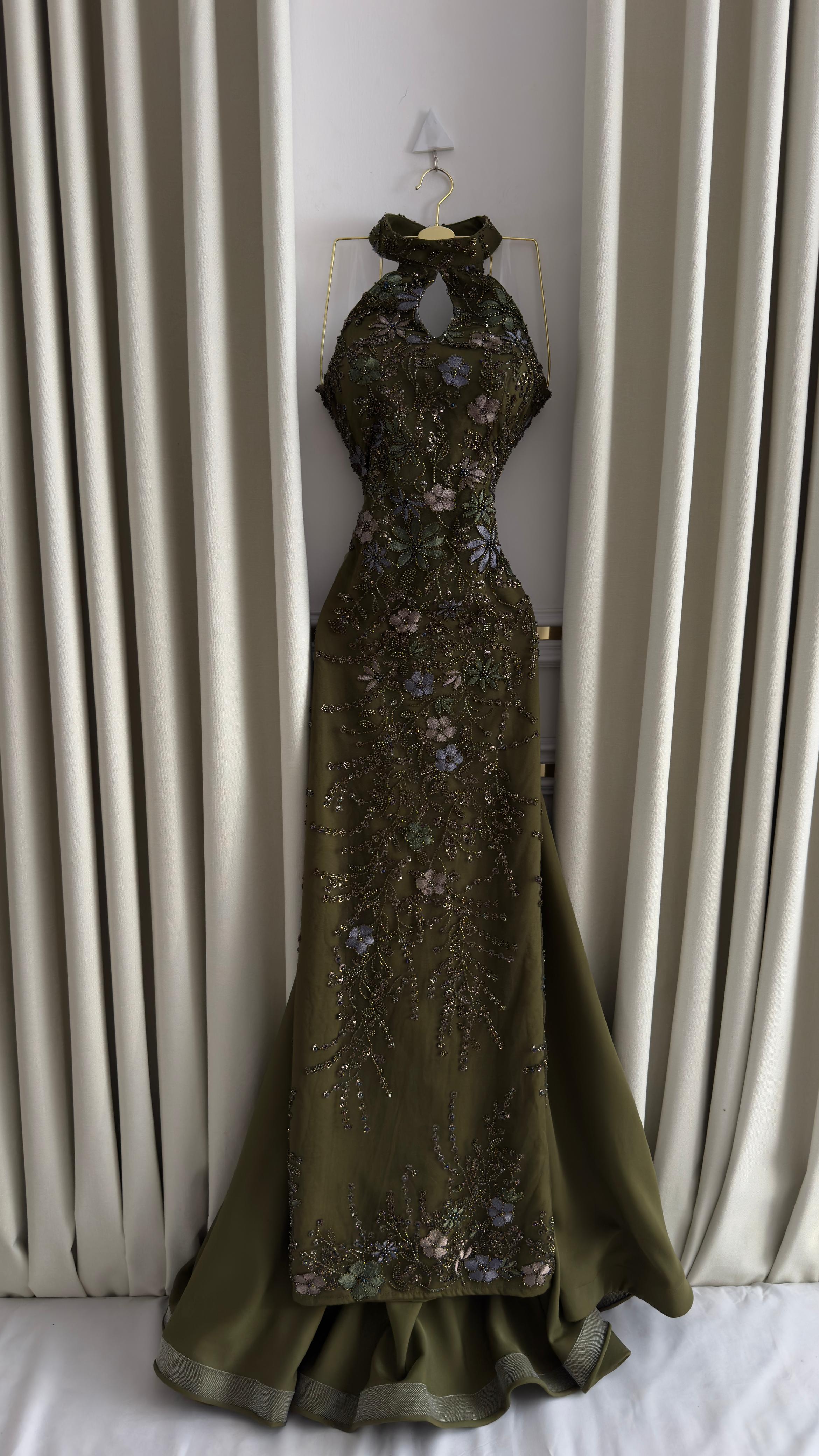 فستان سهرة بلون زيتوني فاخر يفيض بالأناقة والفخامة. تزيّنه تطريزات زهرية راقية مرصعة بالكريستال، مع قصة رقبة مبتكرة بفتحة أنيقة تضيف لمسة عصرية. تصميمه الانسيابي يحدد الخصر ويمنحك حضوراً ملكياً يخطف الأنظار في الحفلات والمناسبات الفاخرة.