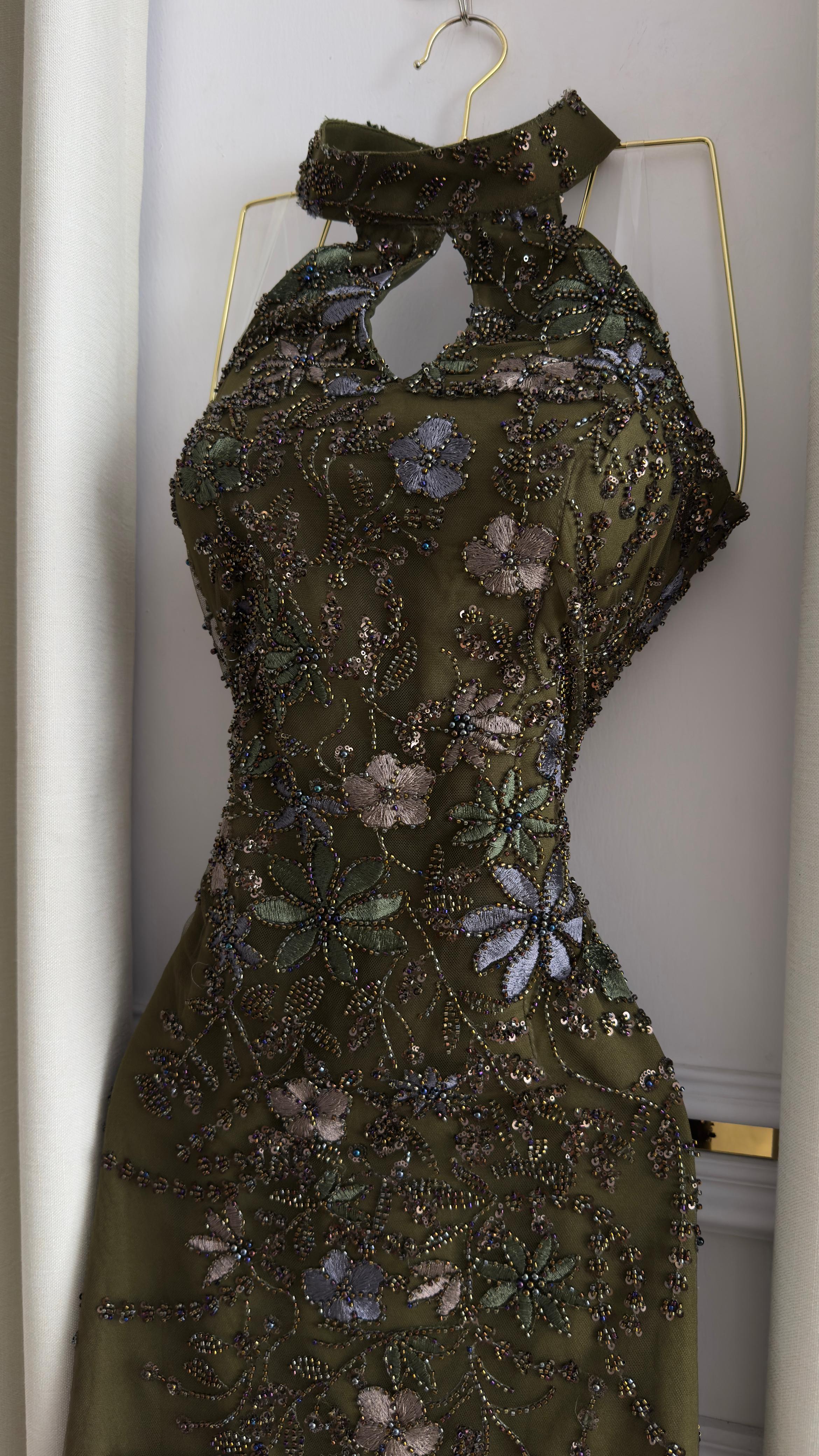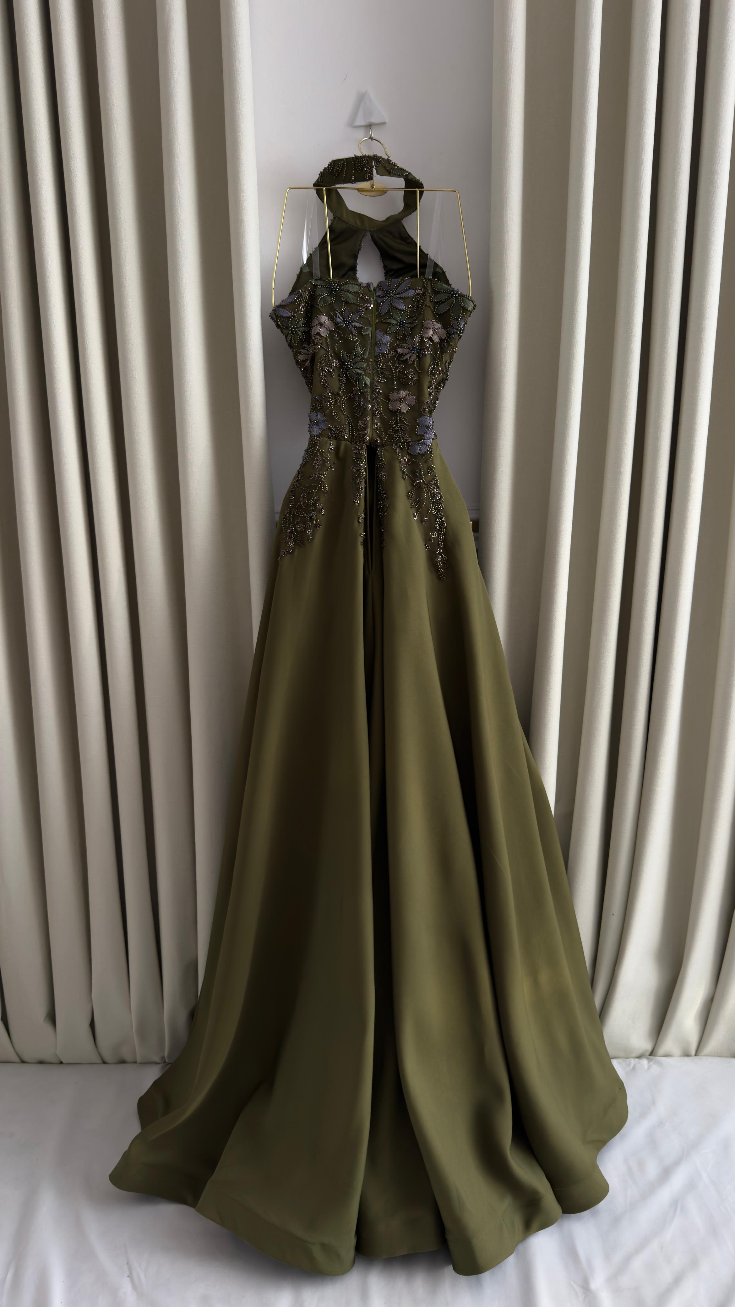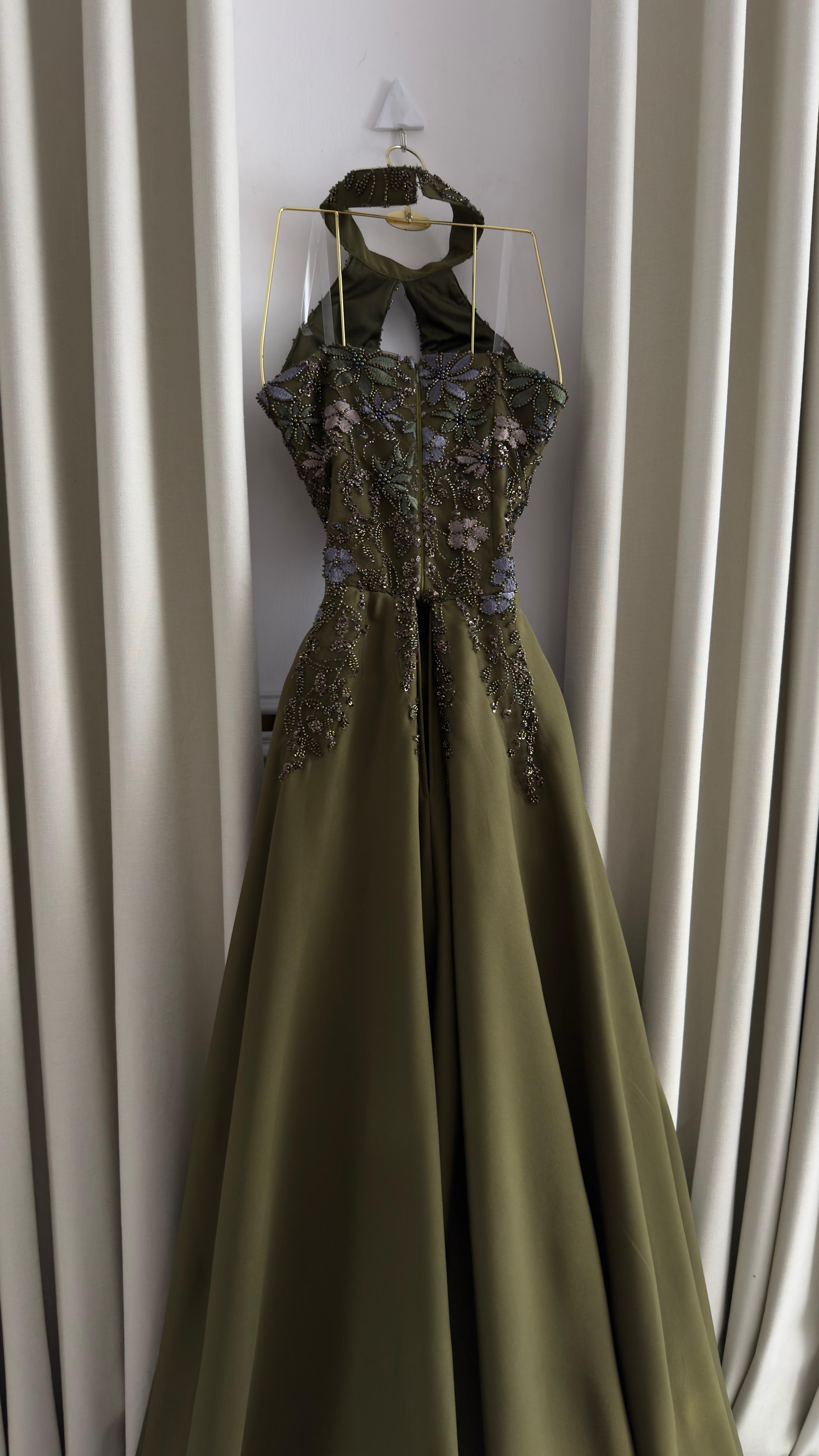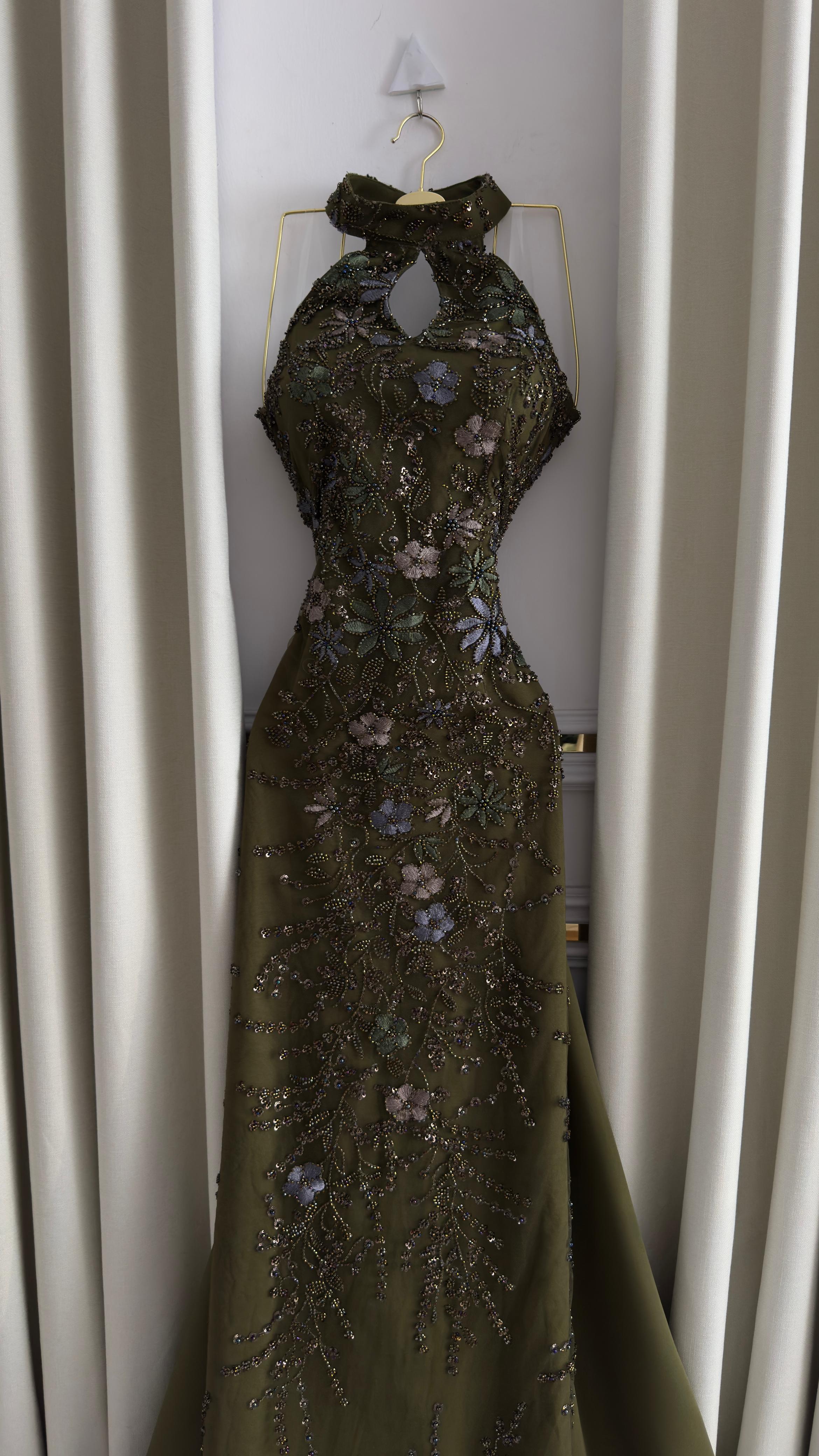 فستان سهرة بلون زيتوني فاخر يفيض بالأناقة والفخامة. تزيّنه تطريزات زهرية راقية مرصعة بالكريستال، مع قصة رقبة مبتكرة بفتحة أنيقة تضيف لمسة عصرية. تصميمه الانسيابي يحدد الخصر ويمنحك حضوراً ملكياً يخطف الأنظار في الحفلات والمناسبات الفاخرة.