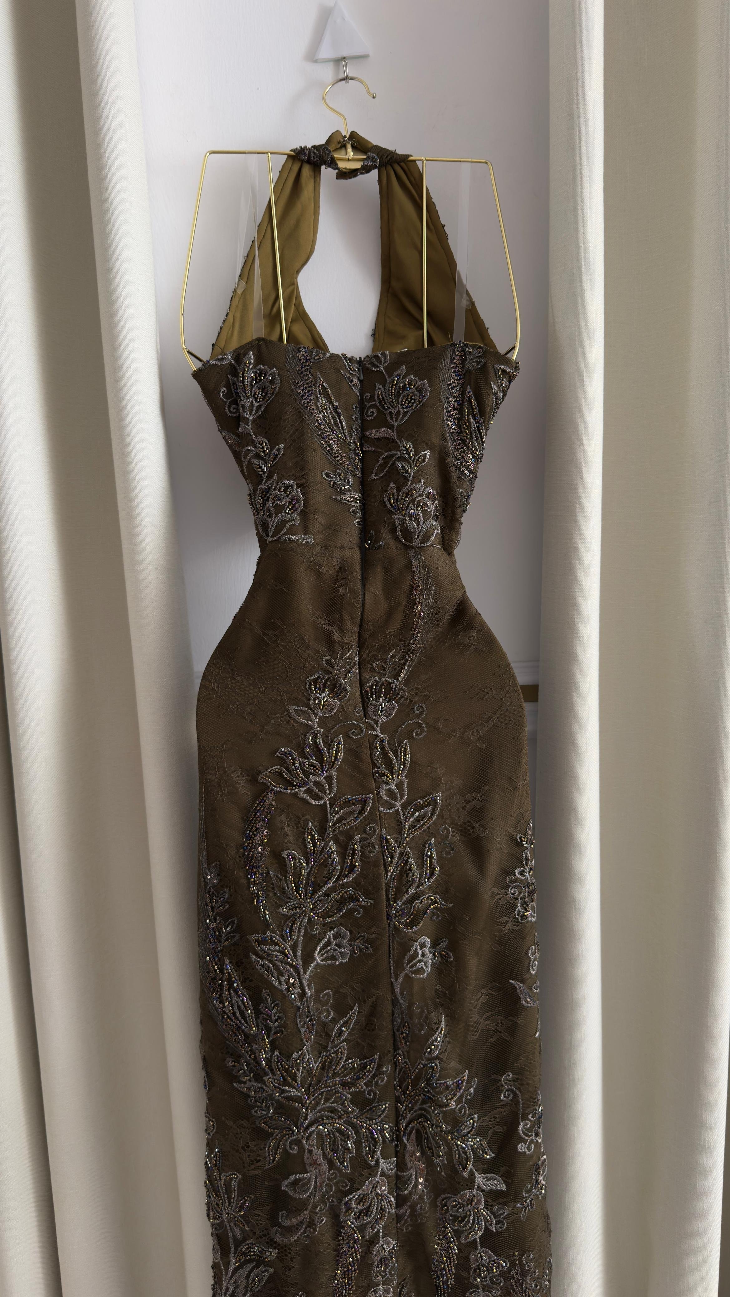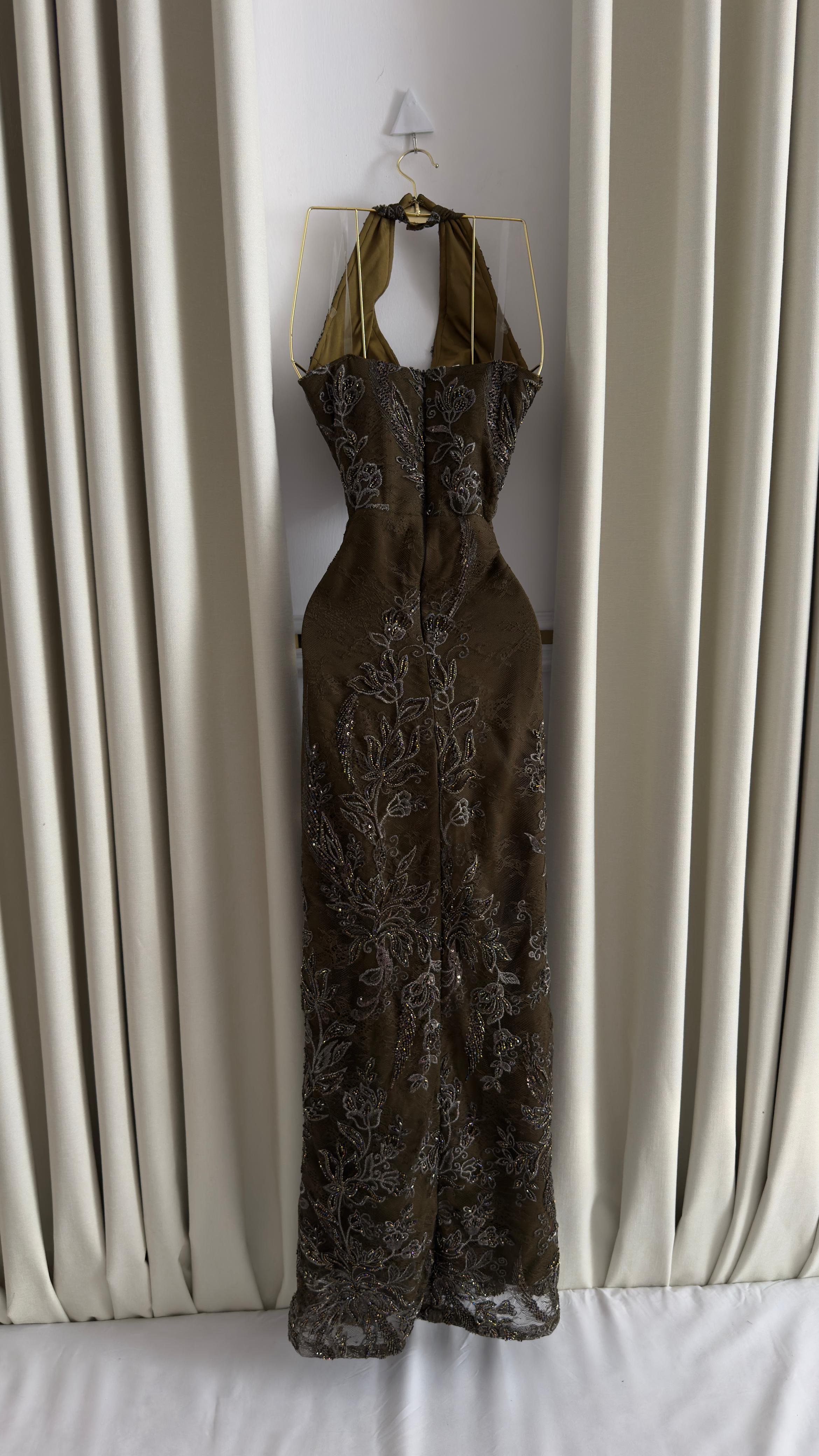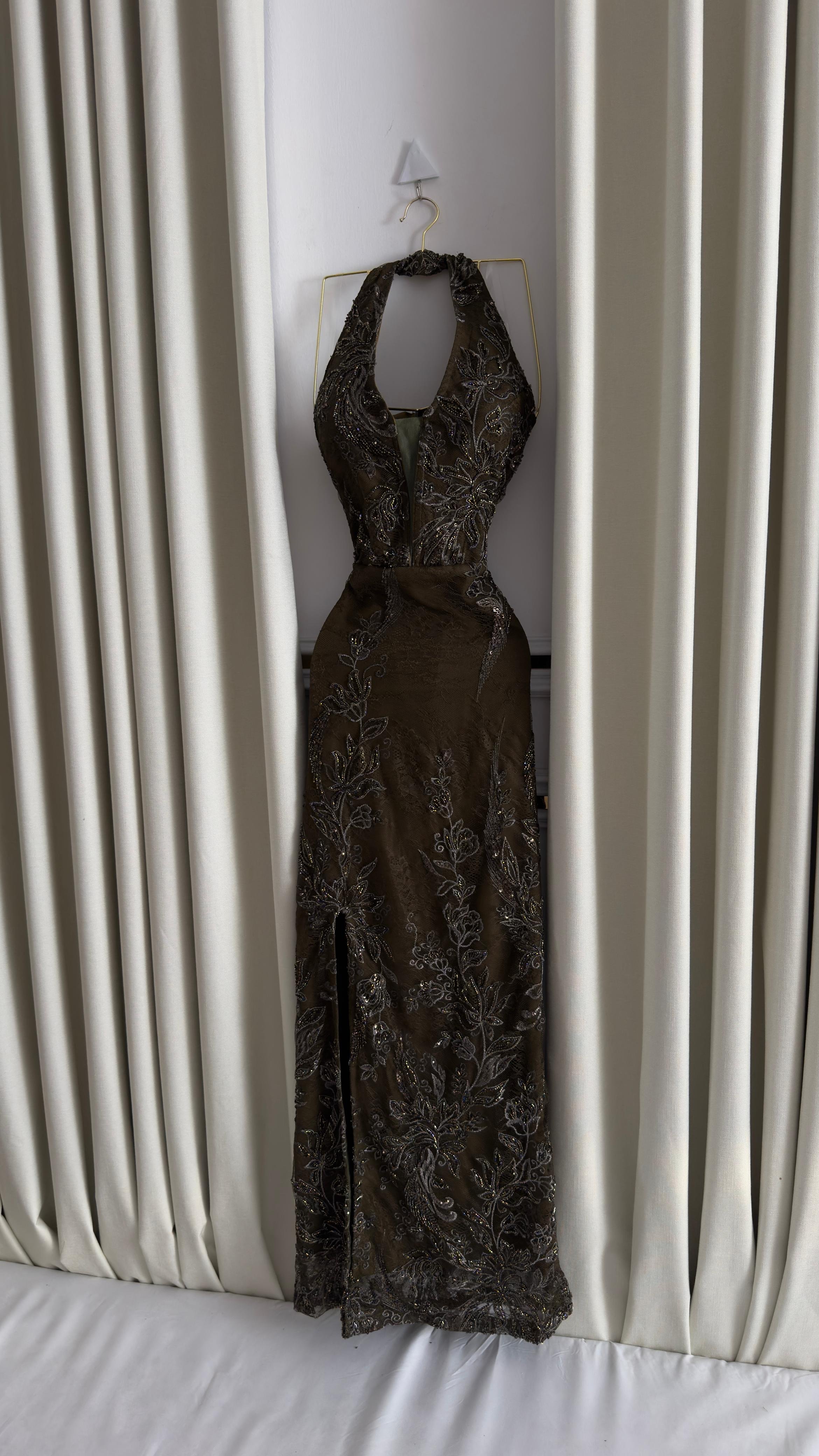 هذا الفستان يجمع بين الفخامة والجرأة بلونه الزيتي الداكن وتطريزه المتقن الذي يبرز جمال القوام. تصميم الرقبة الهالتر مع قصة الخصر الضيقة يضفي لمسة أنوثة آسرة، فيما يمنح الشق الأمامي حرية في الحركة وجاذبية إضافية.