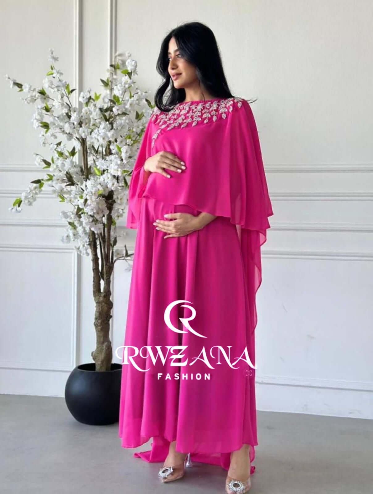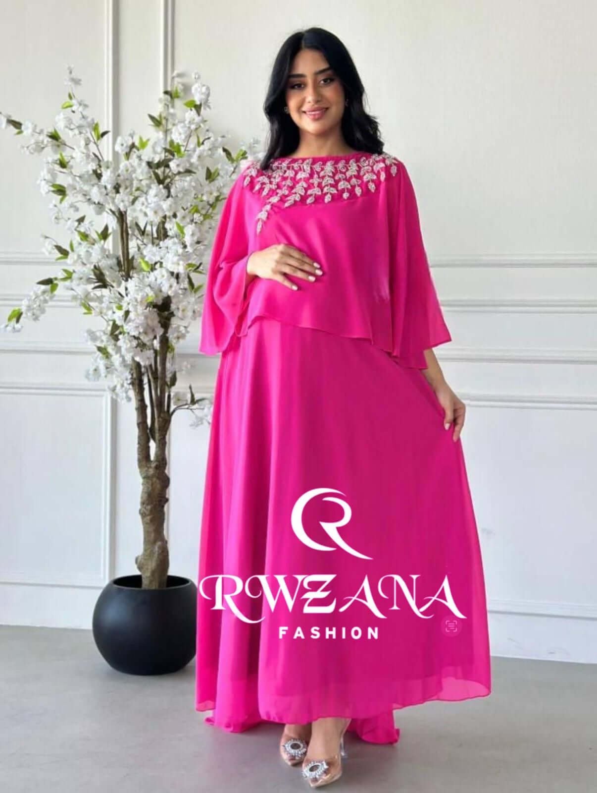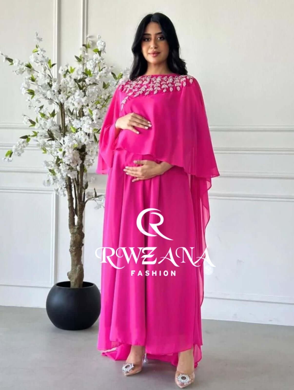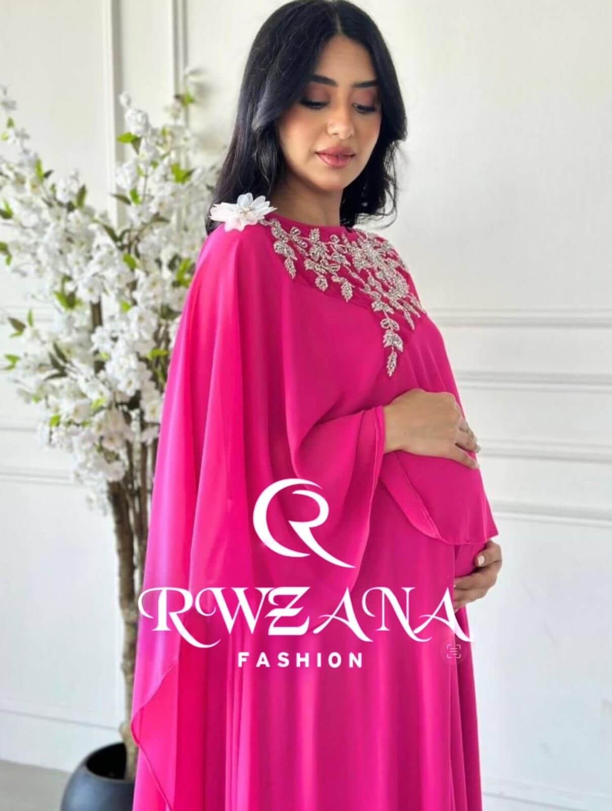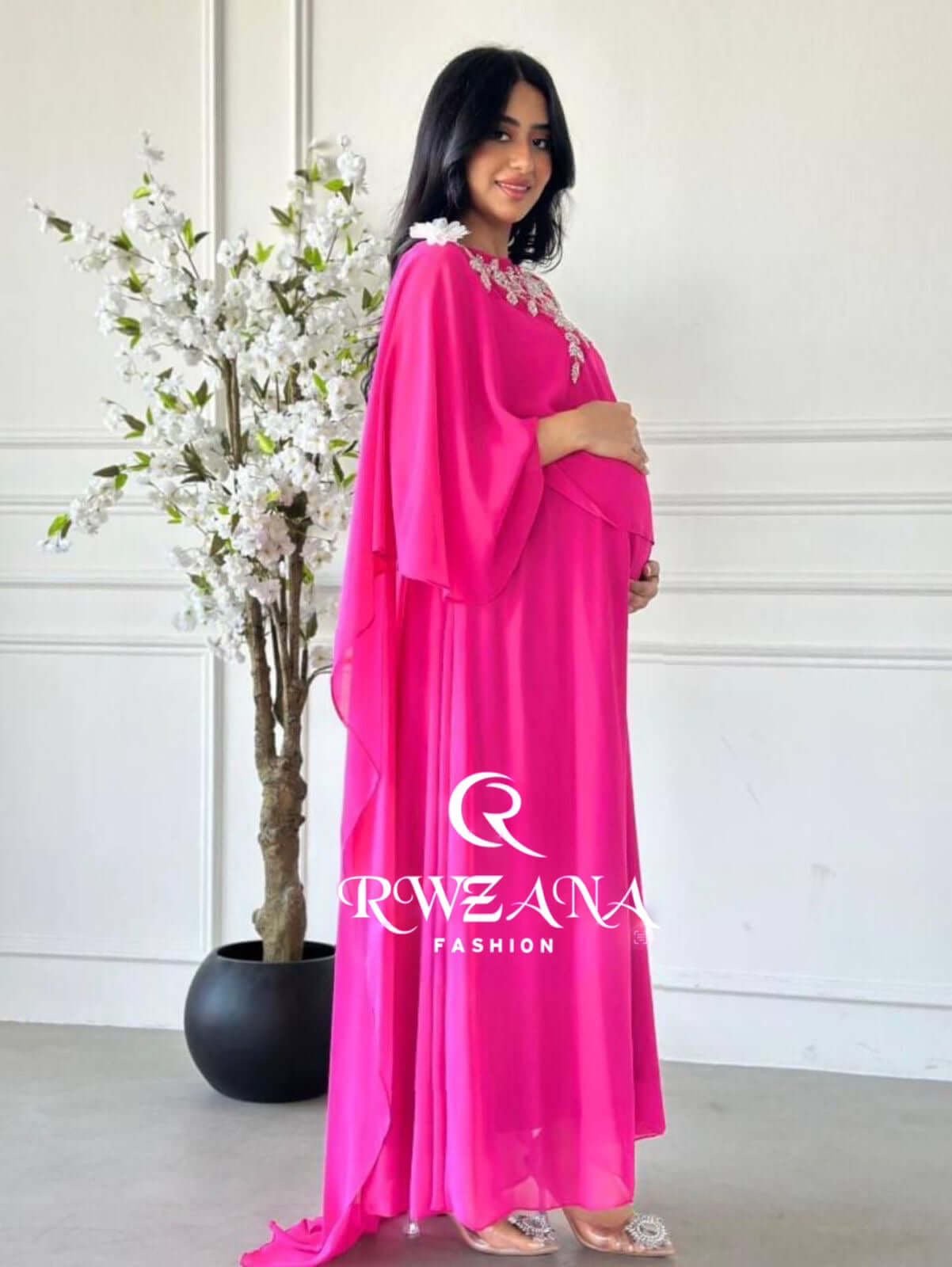 تألقي بإطلالة لافتة مع هذا الفستان الوردي المميز بقصة ماكسي انسيابية وتطريز فاخر عند الصدر يضفي لمسة فاخرة وناعمة. الأكمام الواسعة تمنحك راحة وأناقة في الوقت ذاته، ليكون خيارك الأمثل لإطلالة متكاملة في المناسبات.