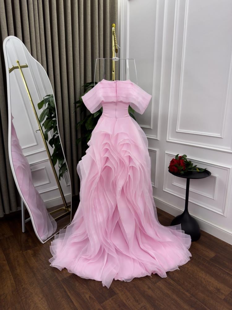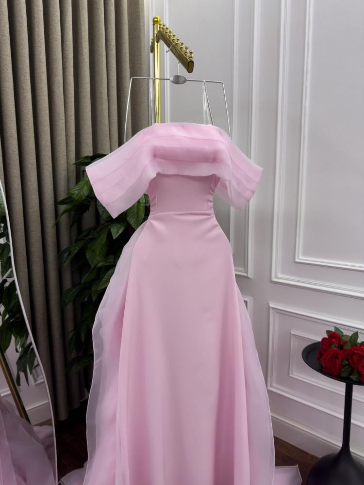 فستان سهرة فاخر باللون الوردي الفاتح، مصمم بأسلوب أوف شولدر يبرز الأكتاف بأسلوب أنثوي راقٍ. يتميز بقصة ضيقة عند الخصر والفخذين لإبراز القوام، مع ذيل طويل منفوش من طبقات الشيفون أو التول المموج يمنح الفستان حجمًا ملكيًا وحركة انسيابية جذابة. الخامة الفاخرة والتصميم المتقن يجعلان منه خيارًا مثاليًا لحفلات الزفاف، الخطوبة، والمناسبات الفاخرة التي تتطلب إطلالة لا تُنسى.