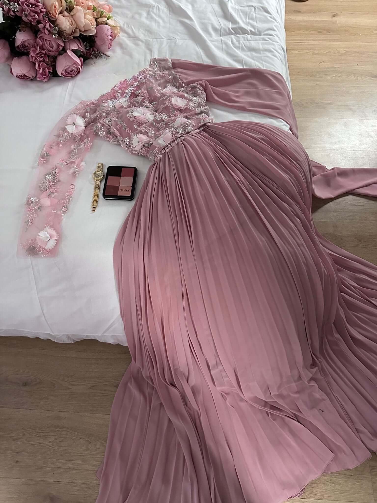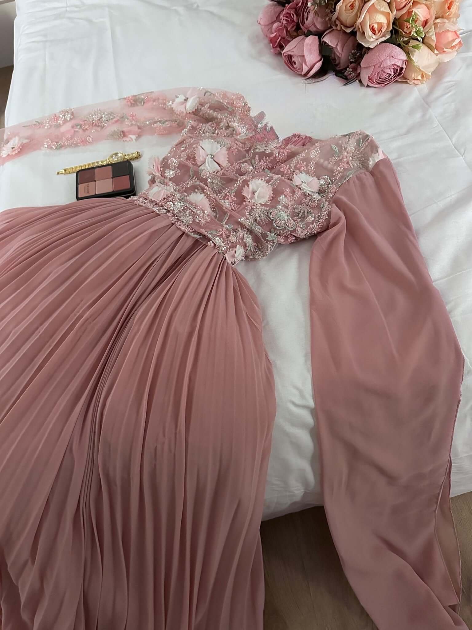 تألقي بفستان وردي ناعم يجمع بين الأنوثة والفخامة، بتصميم أوف شولدر مطرز بدانتيل لامع وأكمام طويلة شفافة تزيدك جاذبية. تنورته البليسيه الواسعة تنسدل بانسيابية لتمنحك حضوراً ملكياً يخطف الأنظار في كل مناسبة.
