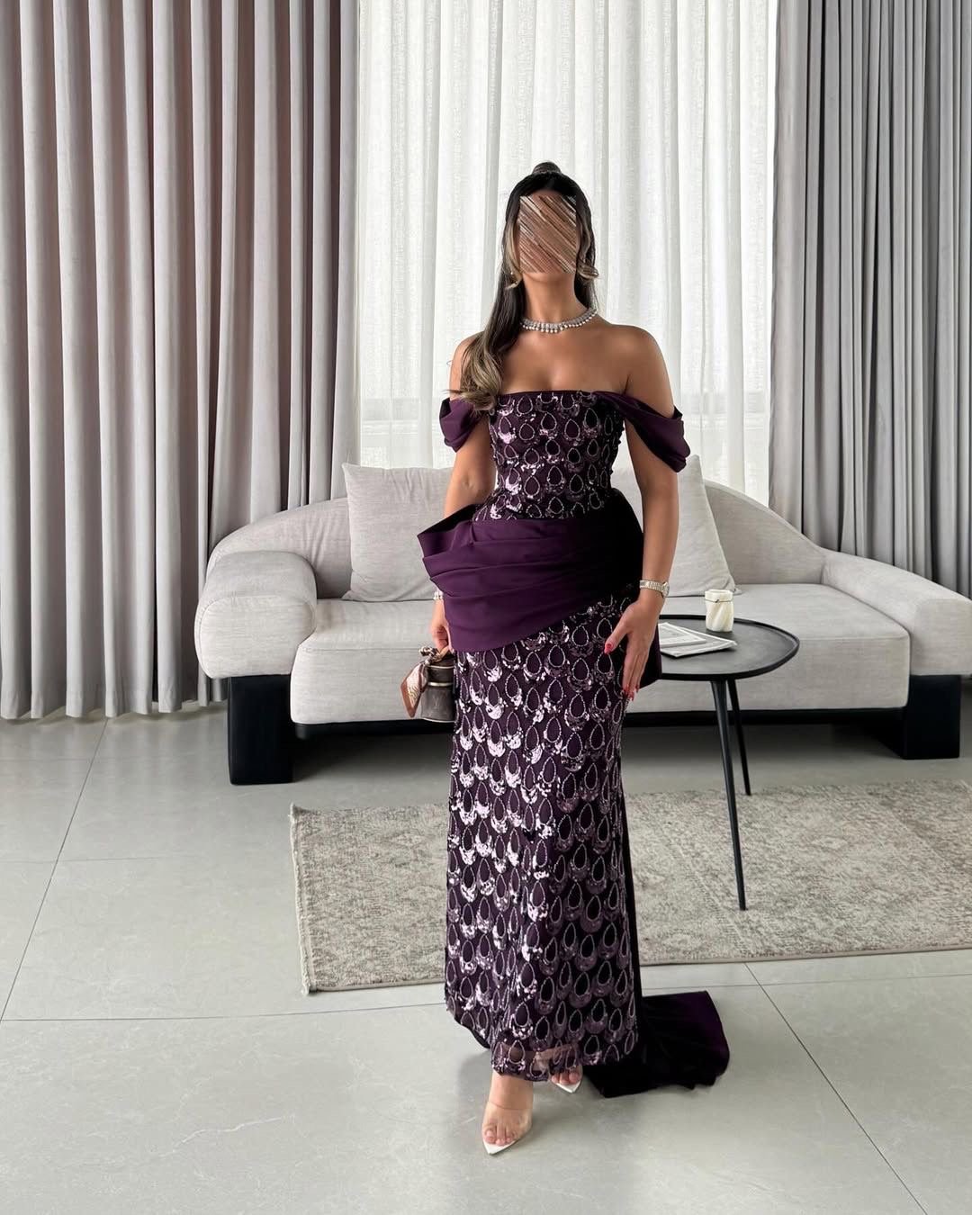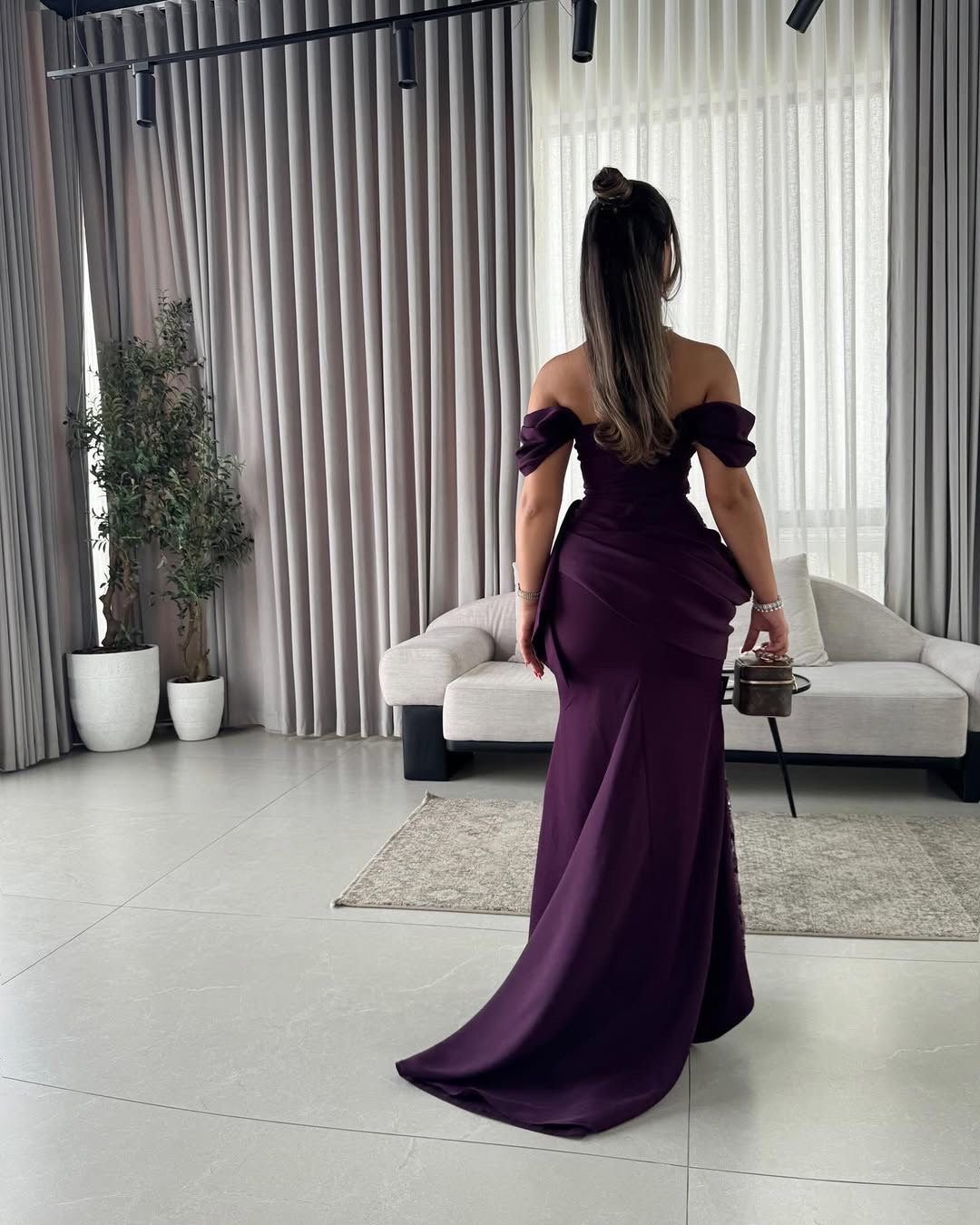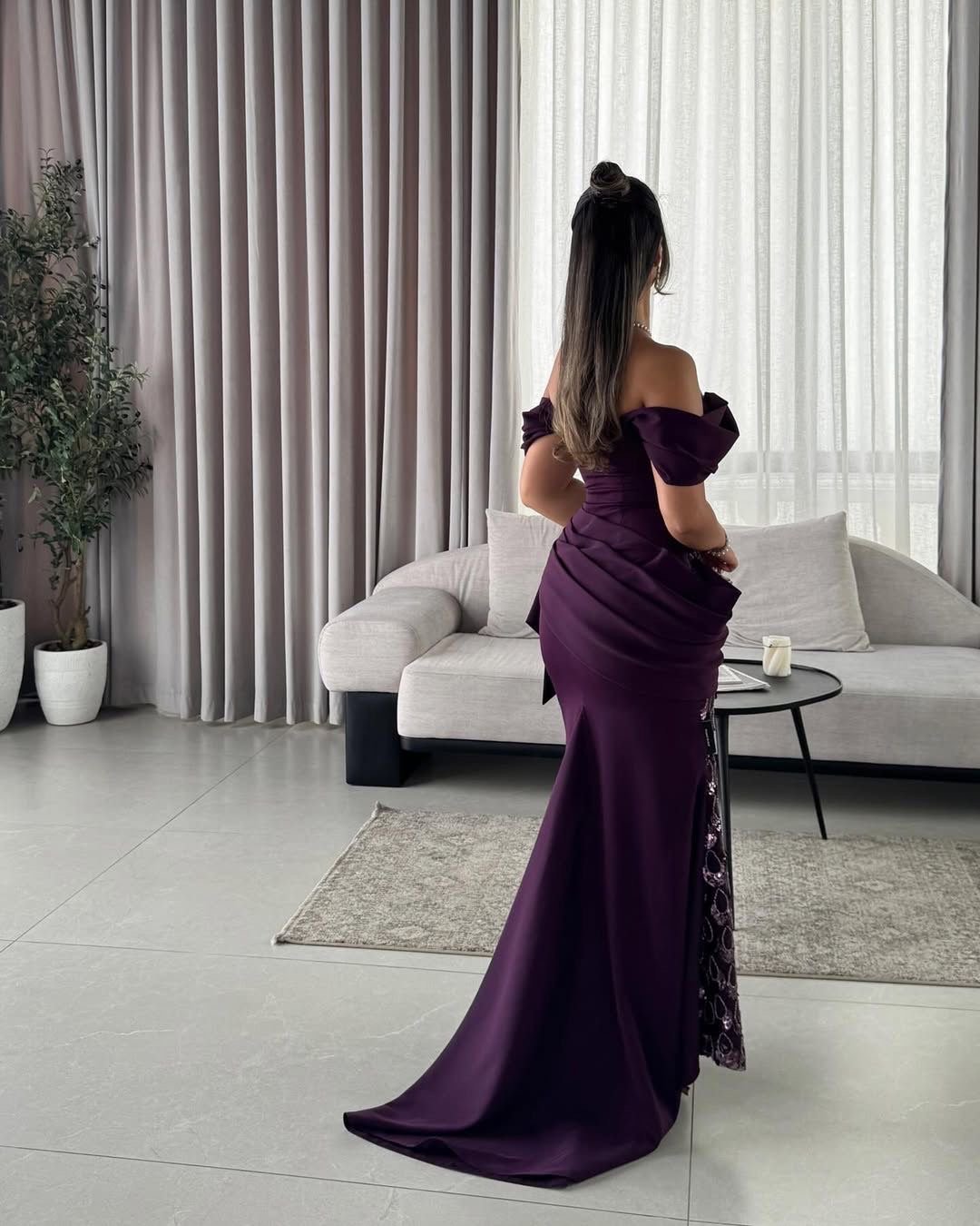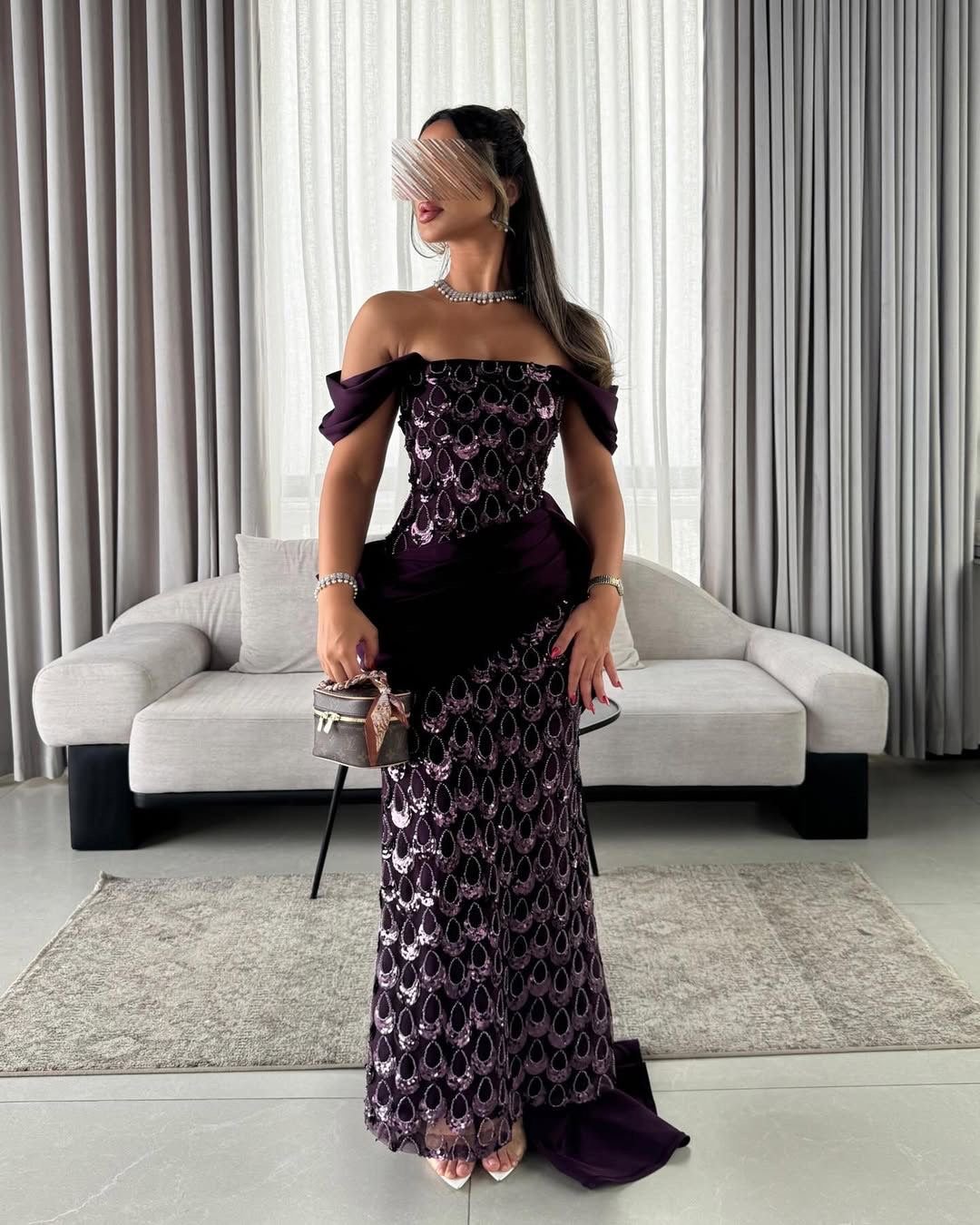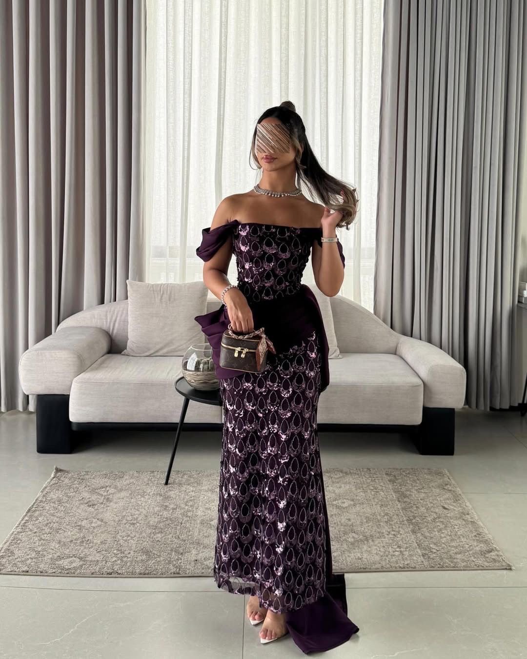 أبهري الجميع بإطلالة راقية مع هذا الفستان البنفسجي الغني، المصمم بتفاصيل تطريز لامعة تنبض فخامة. قصة الأوف شولدر تضيف لمسة أنثوية ناعمة، بينما تضيف القصة المستقيمة مع الذيل الجانبي الطويل لمسة من التميز والثقة في مناسبات السهرة الفاخرة.