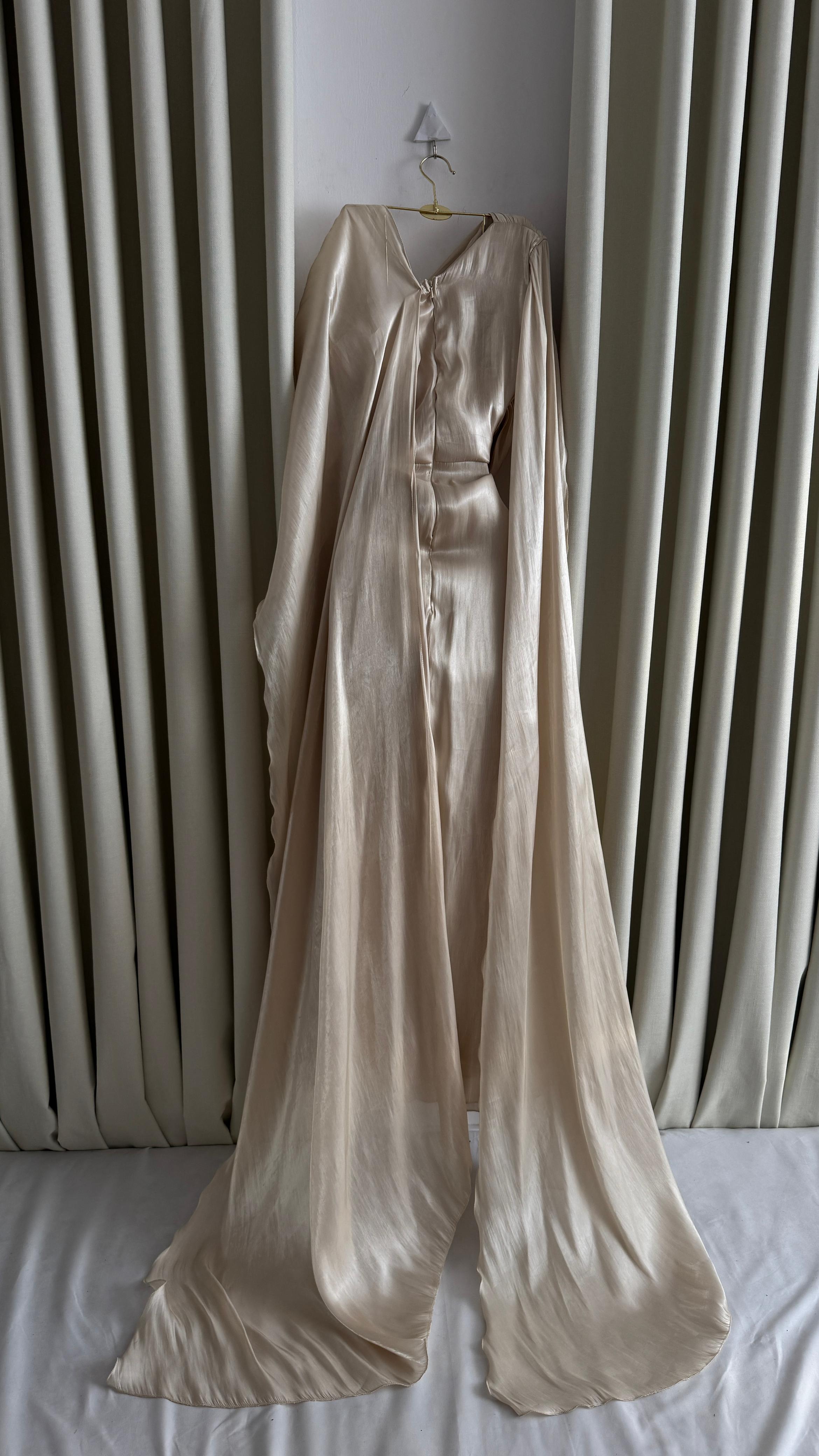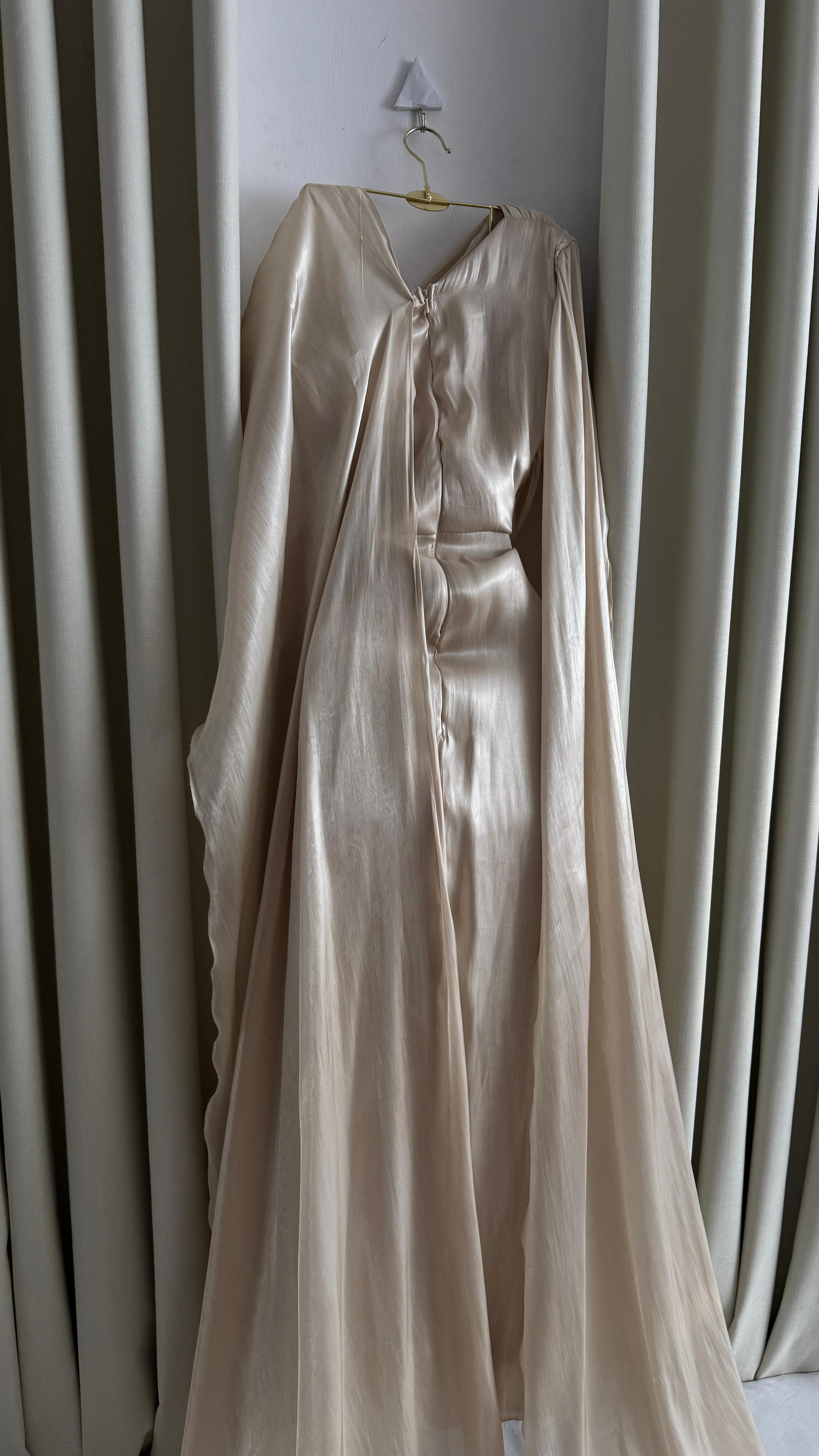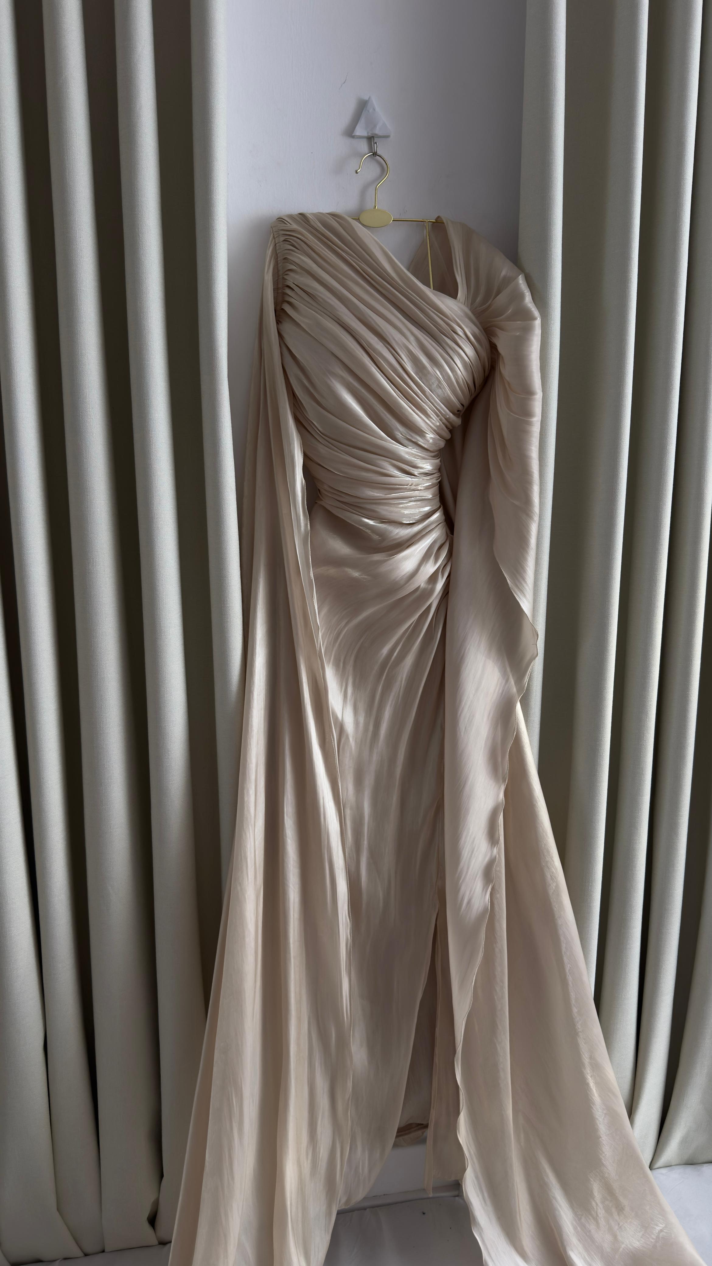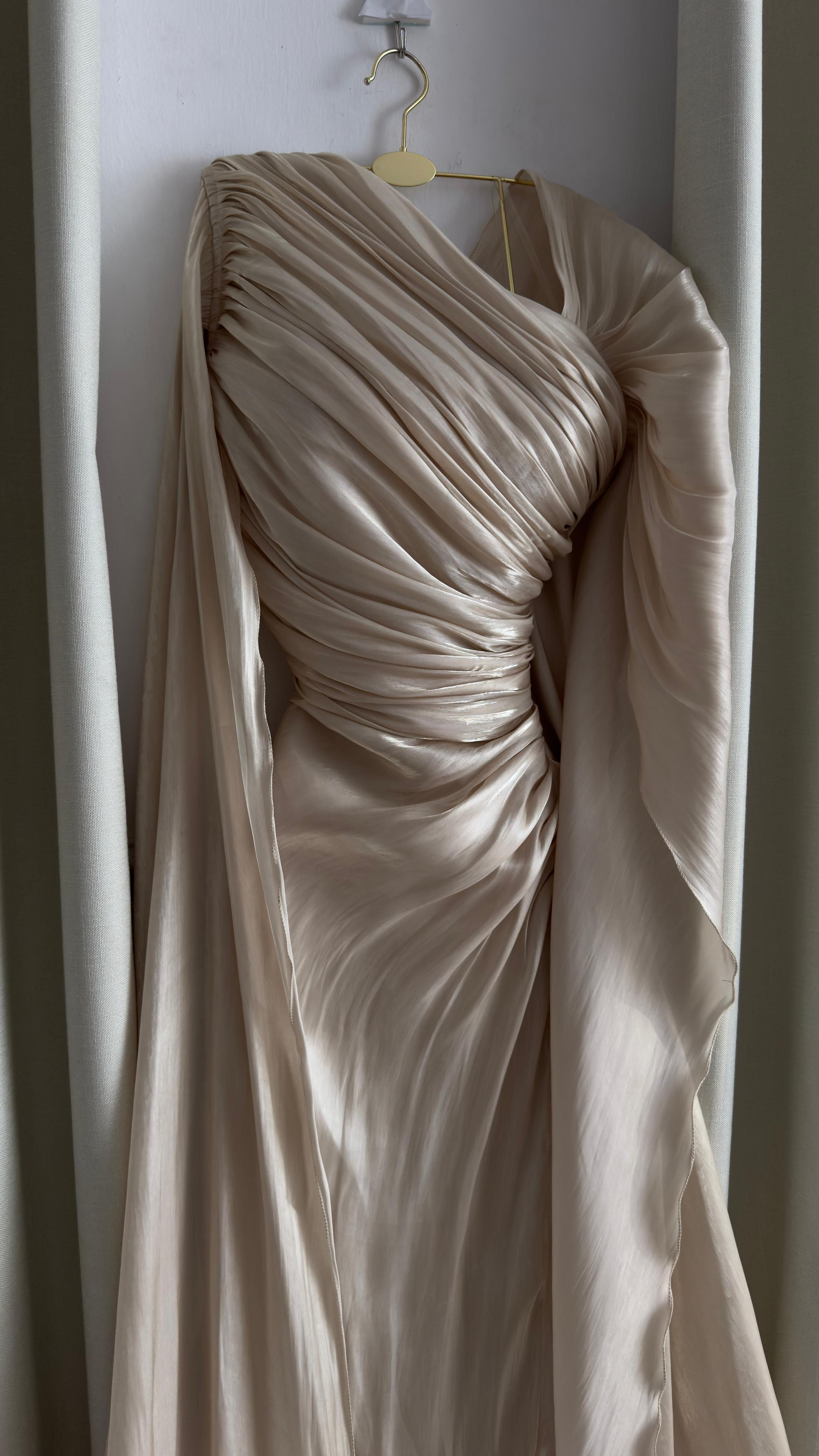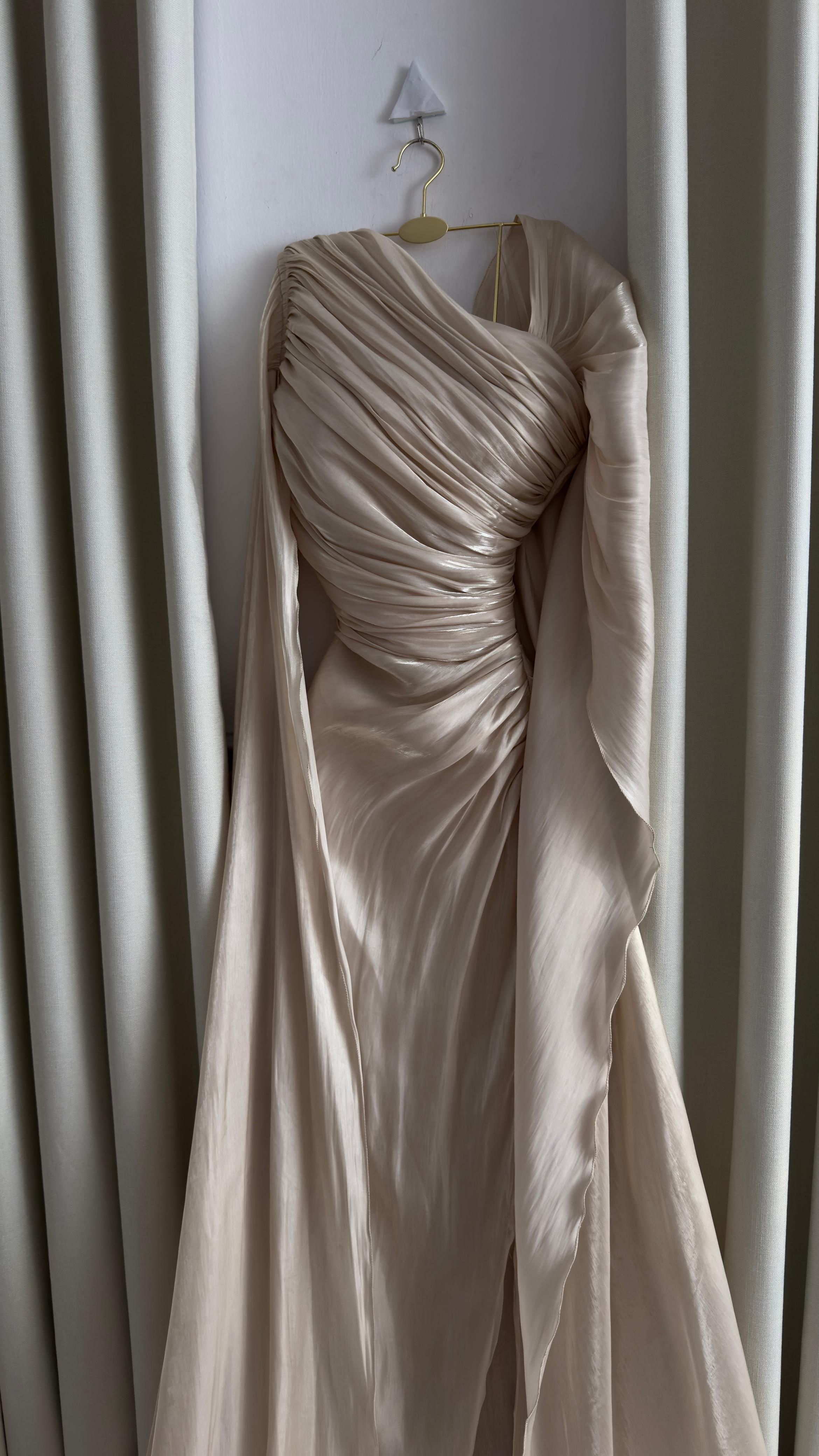 فستان سهرة فاخر باللون البيج الأنيق، مصمم بقماش ساتان حريري لامع يمنحك إطلالة ملكية ناعمة. يتميز بتصميم أوف شولدر مع طيات متدرجة وانسدال انسيابي طويل يضفي لمسة راقية على حضورك. مثالي للسهرات والمناسبات الفاخرة.