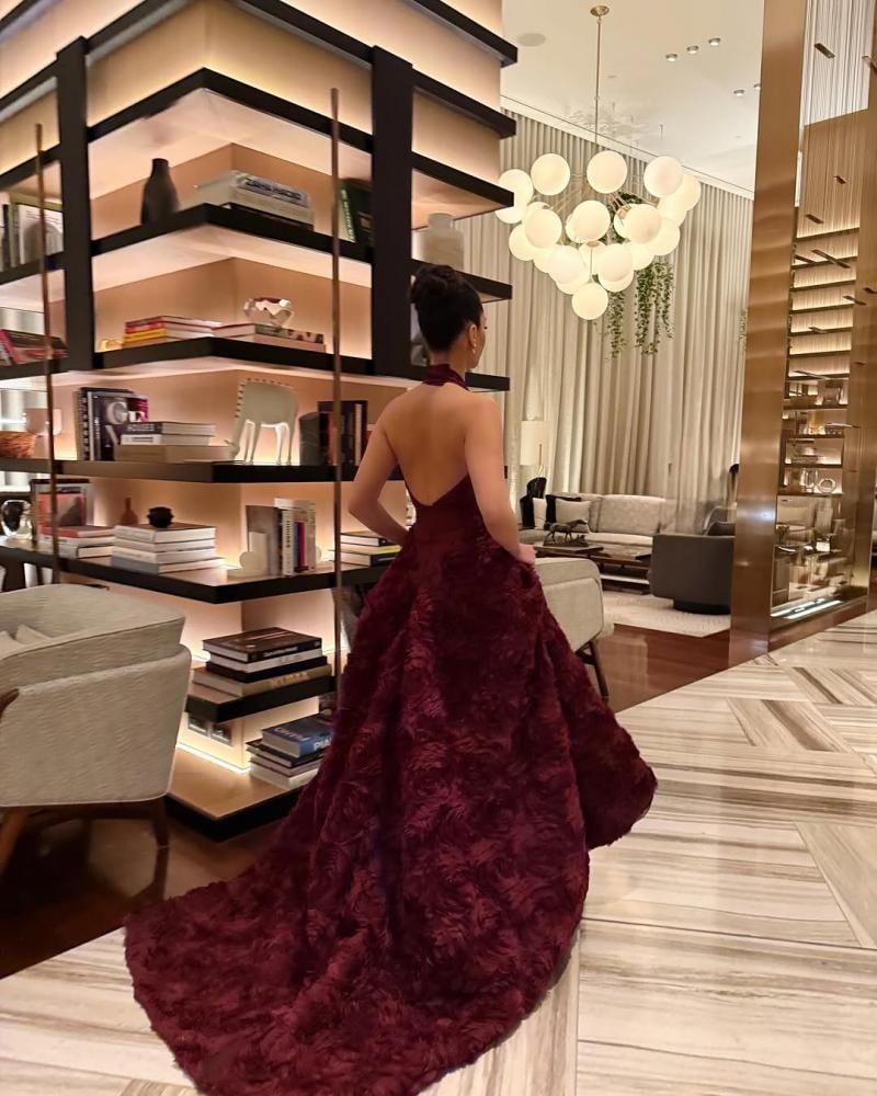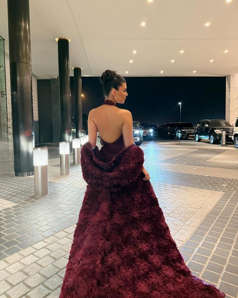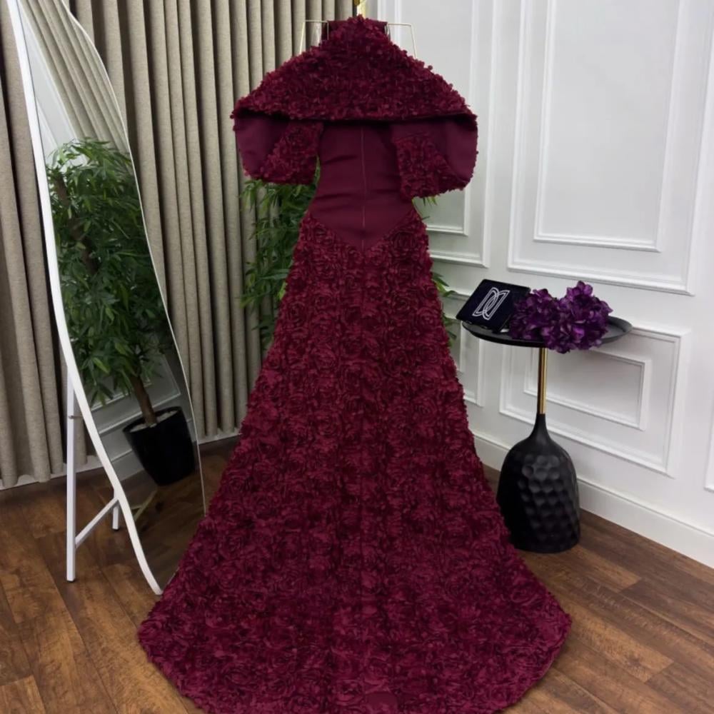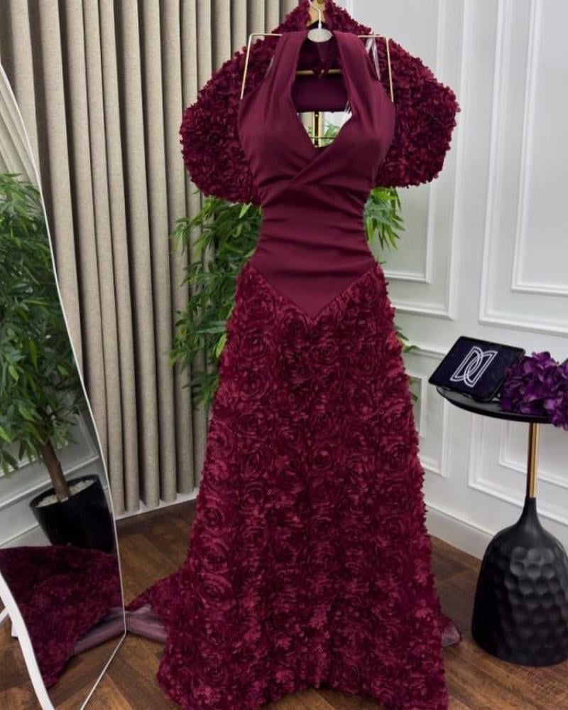 - الجزء السفلي: ورود بارزة 3D على تول فاخر.