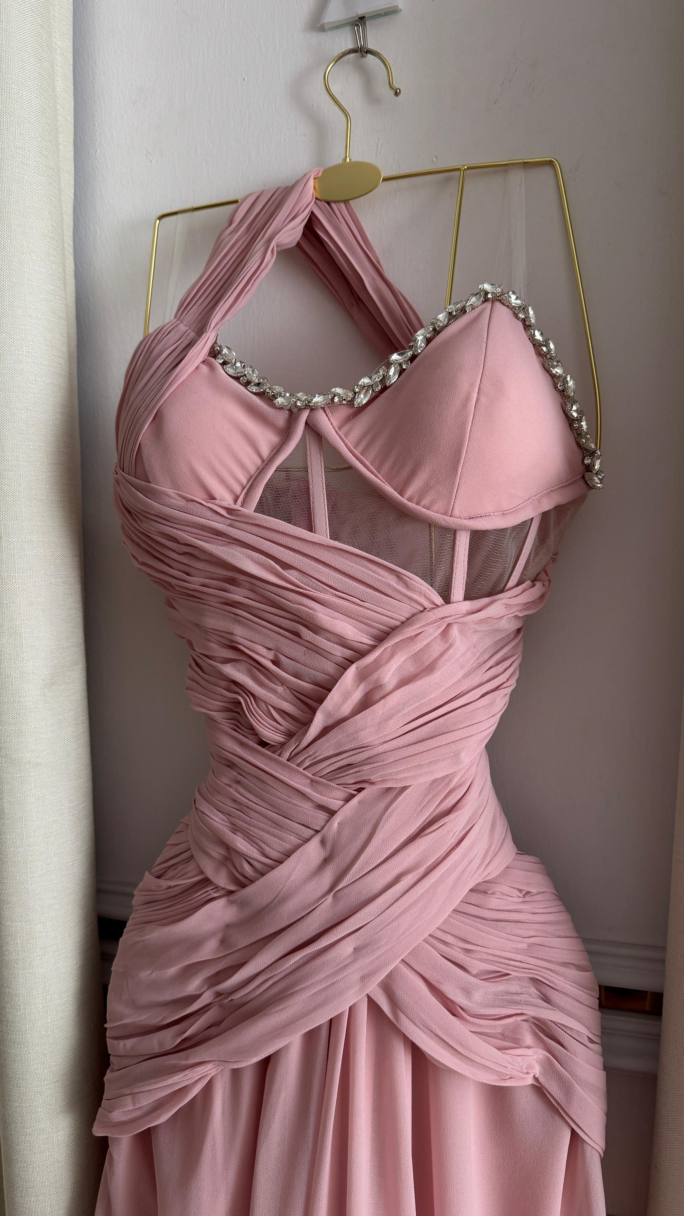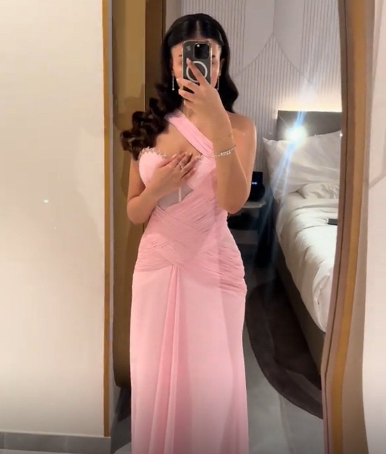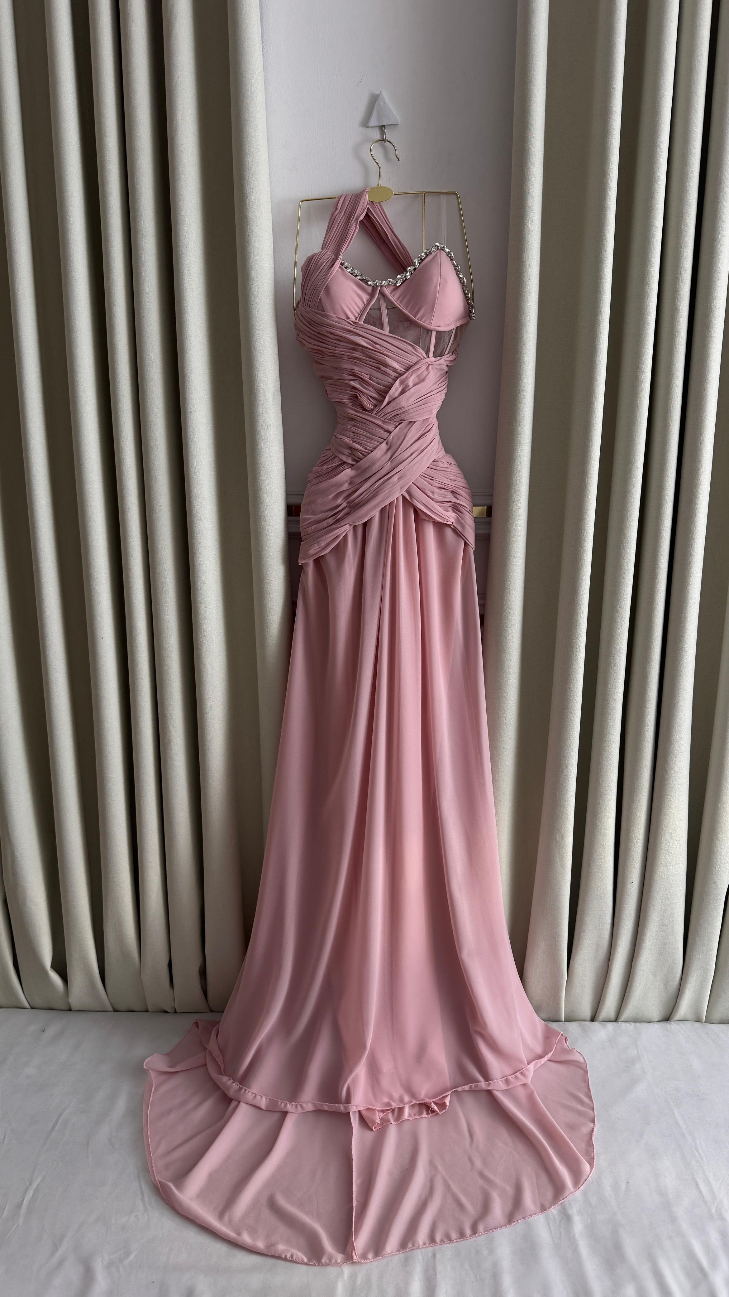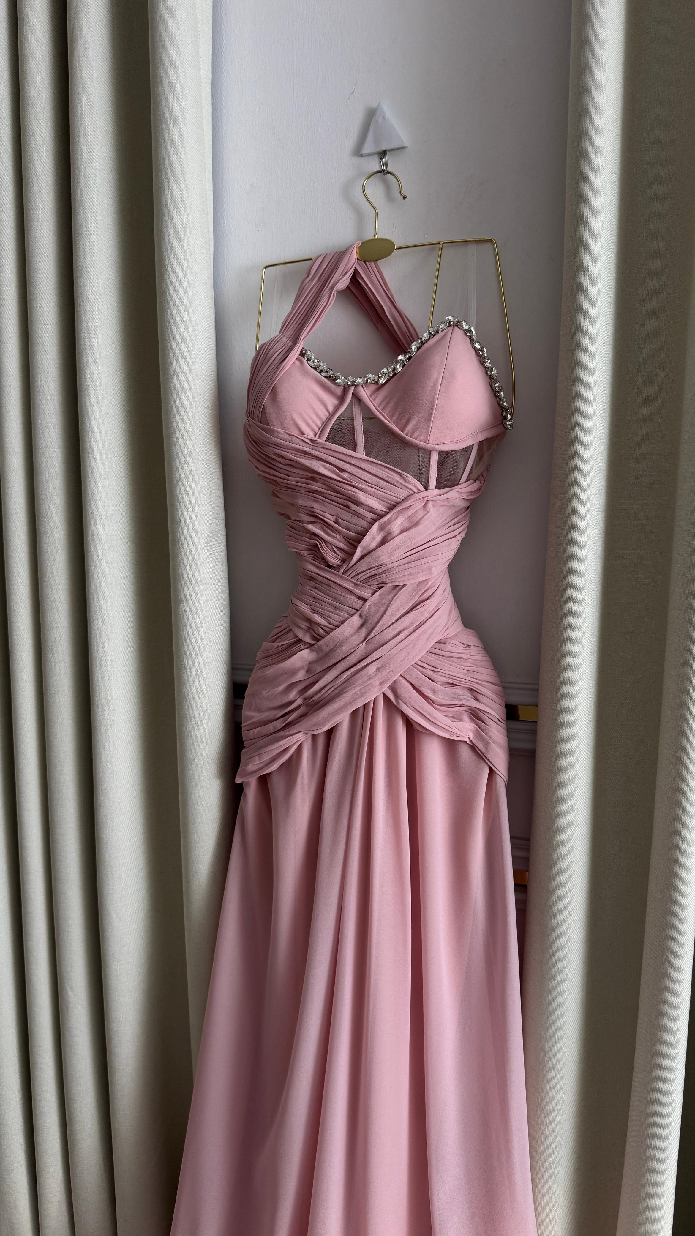 فستان سواريه وردي بحمالة كتف مرصعة بالكريستال وقصة مميزة بطيّات ناعمة وانسيابية، مثالي لإطلالة أنثوية راقية في السهرات