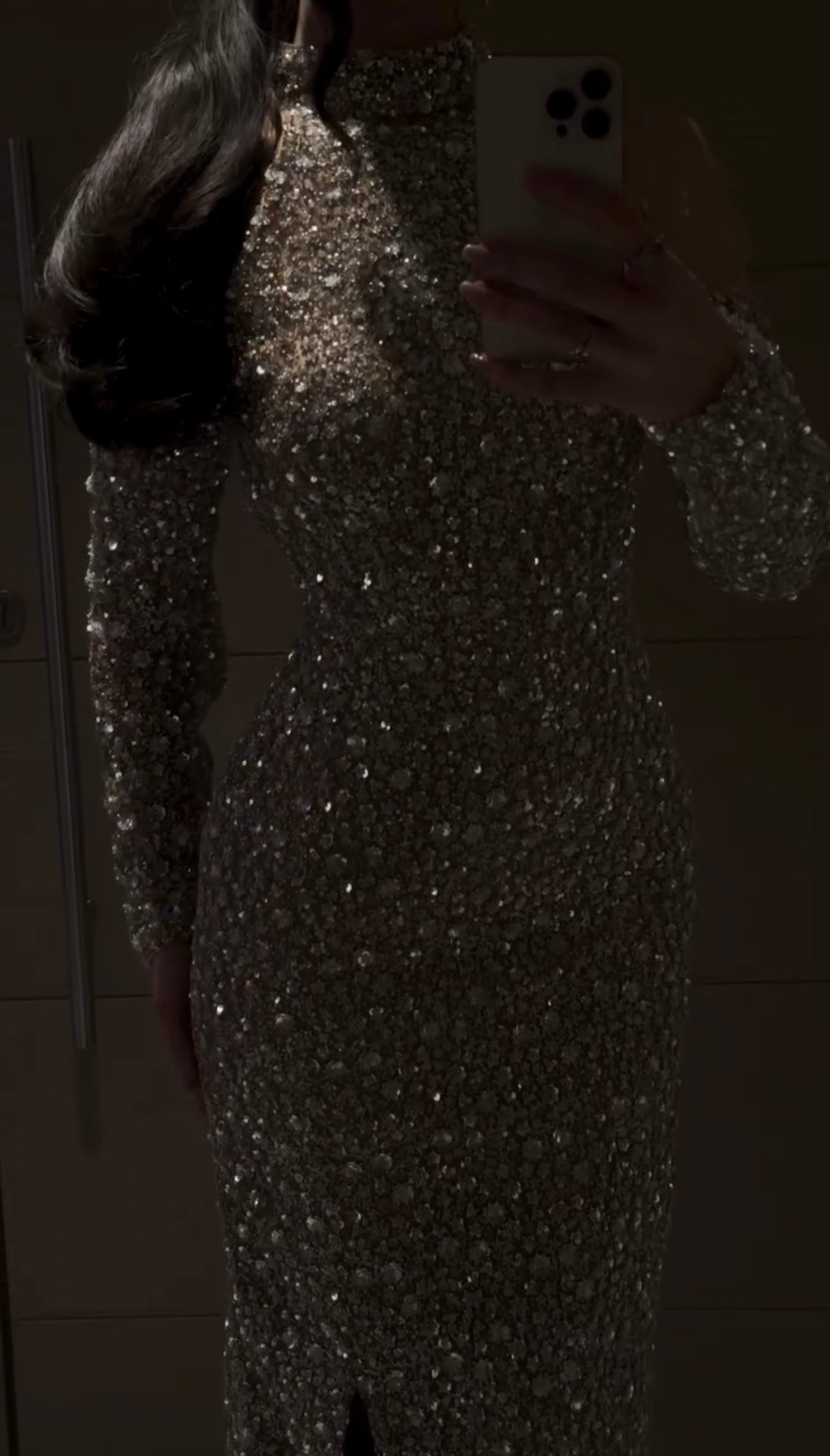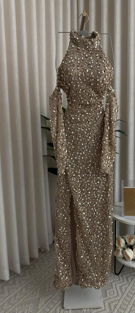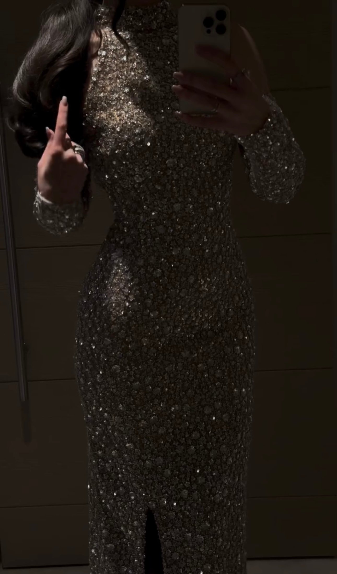 تألقي بإطلالة ساحرة مع هذا الفستان المطرز بالكامل بالترتر الفاخر الذي يعكس الأضواء بشكل مبهر. تصميم ضيق يبرز القوام مع أكمام طويلة أنيقة وفتحة أمامية تمنح لمسة عصرية جريئة. خيار مثالي للسهرات والمناسبات الراقية.