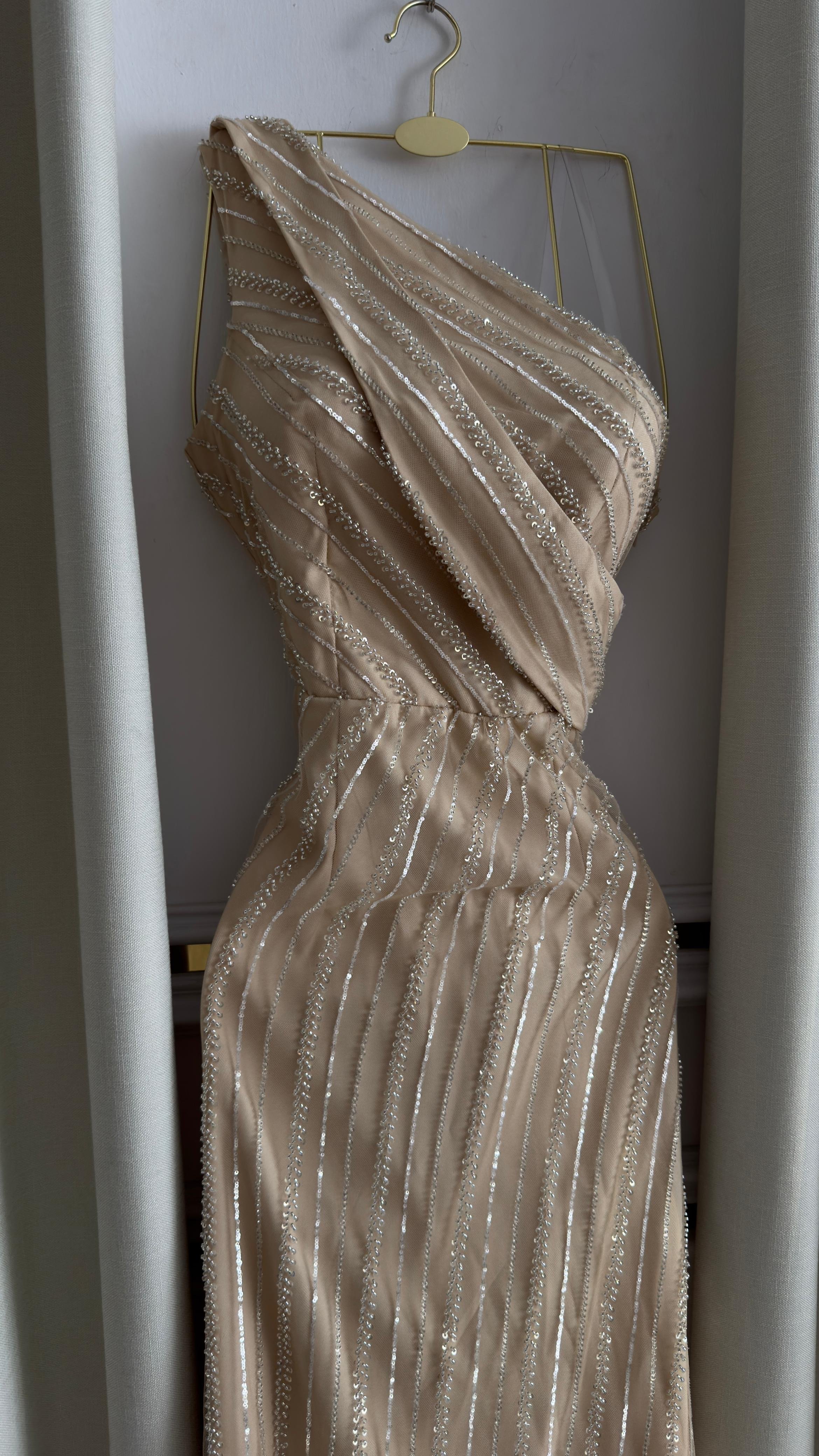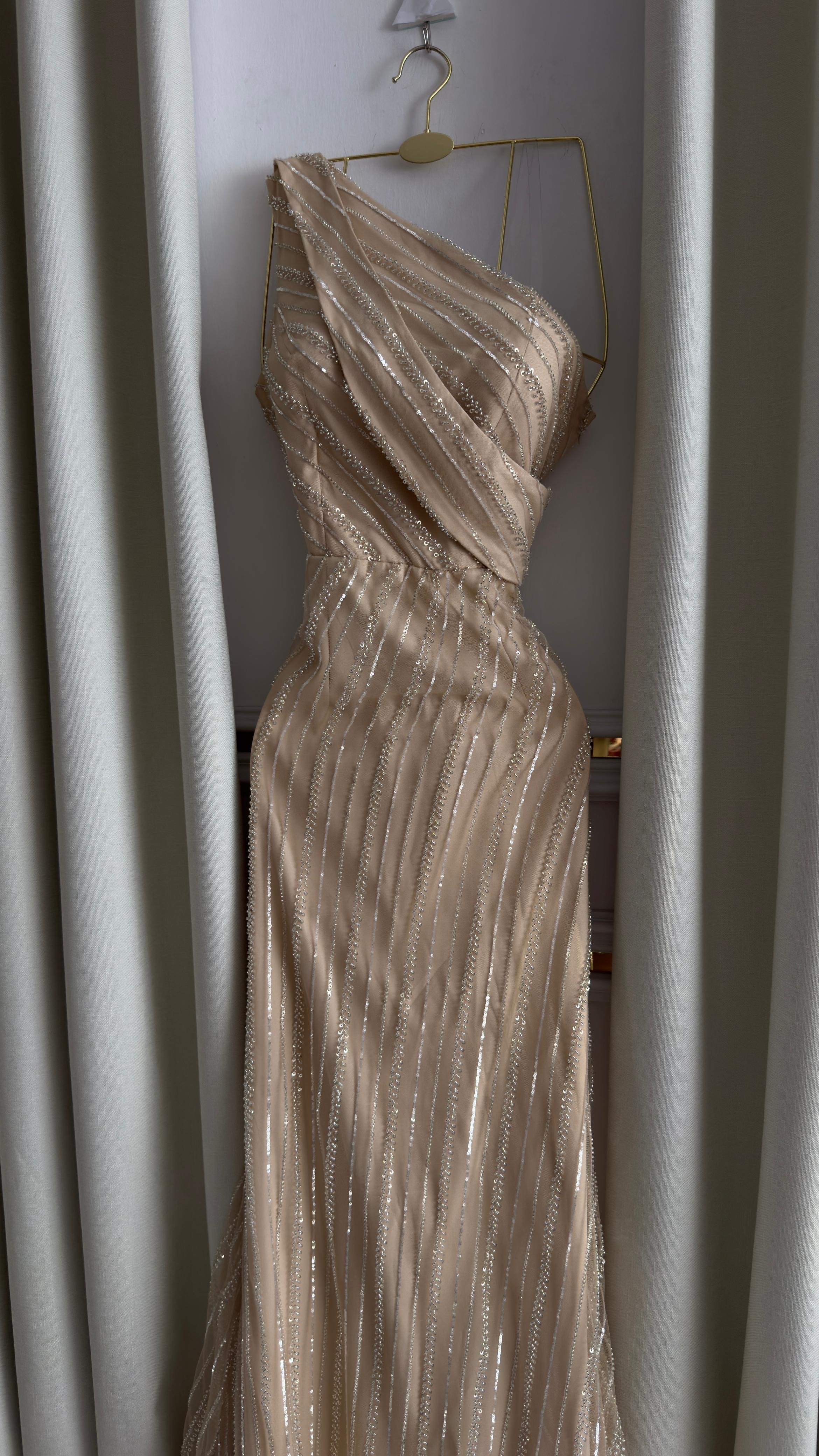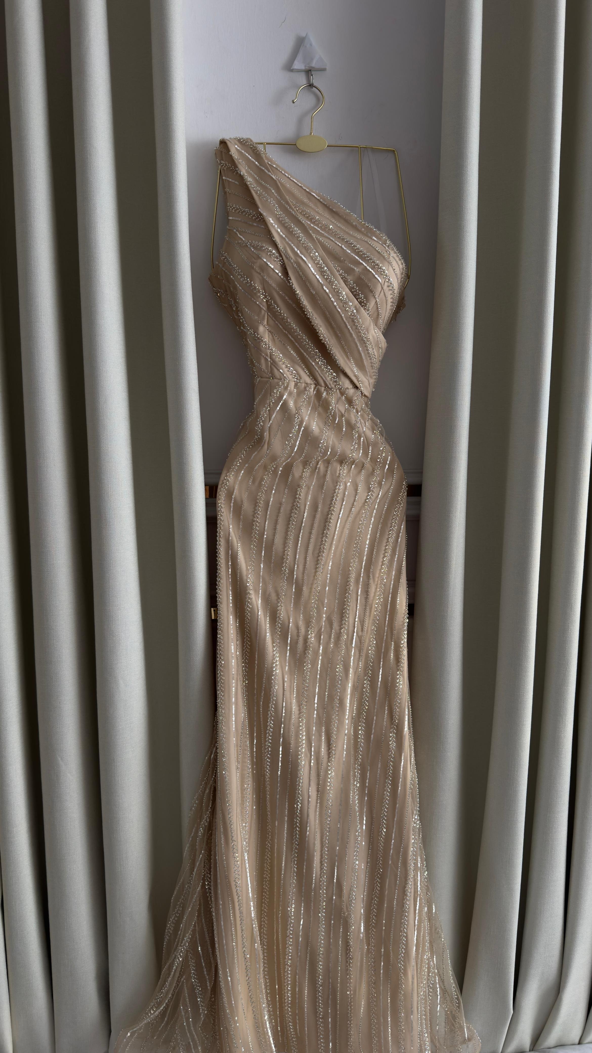 فستان سهرة بيج بتصميم كتف واحد (One Shoulder) يجمع بين الأنوثة والفخامة، مصنوع من قماش شيفون مطرز بخطوط لامعة تضيف إشراقة مميزة مع كل حركة. يتميز بقصّة انسيابية تبرز جمال القوام وتمنحك حضورًا راقيًا في المناسبات الخاصة.