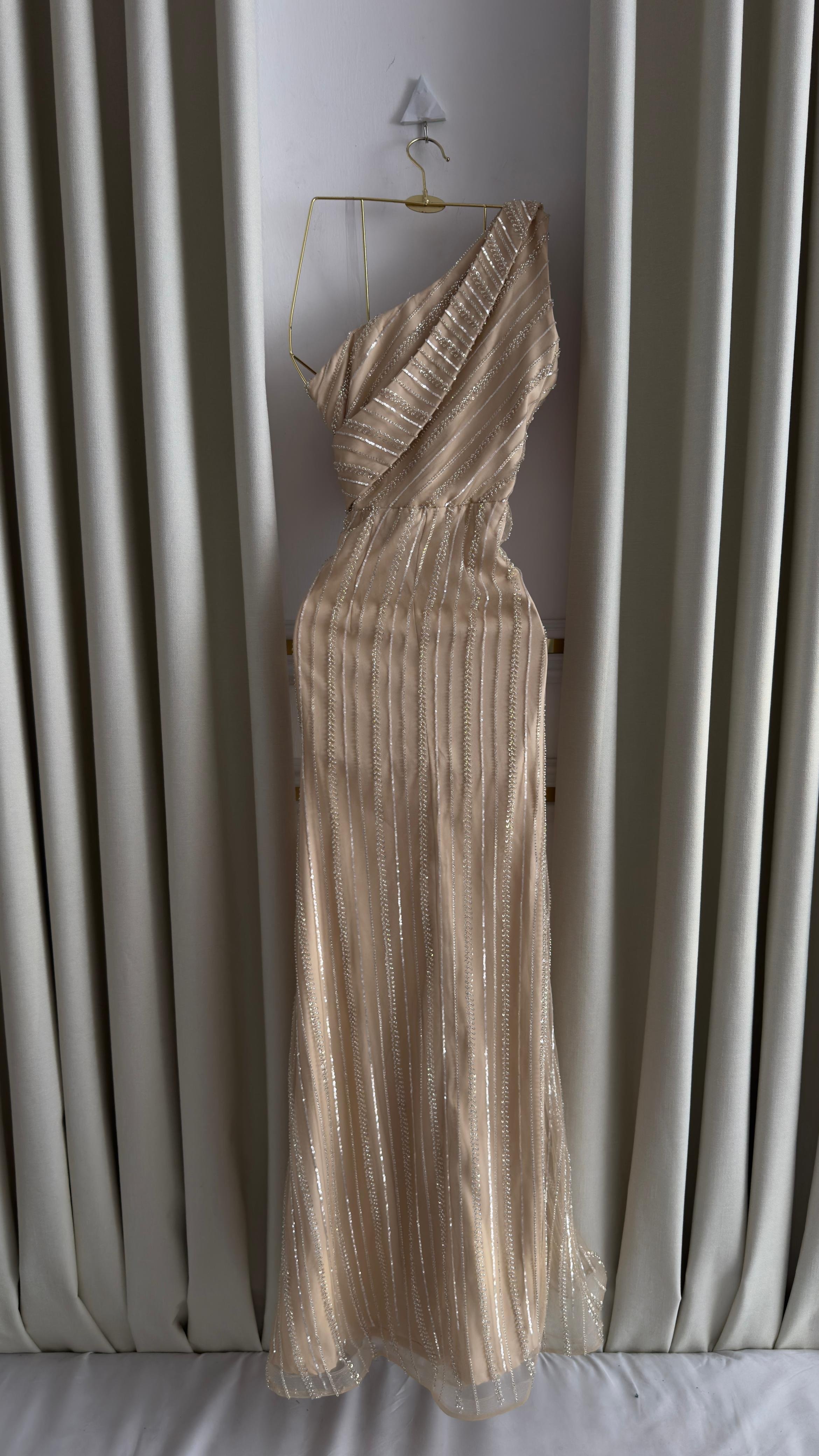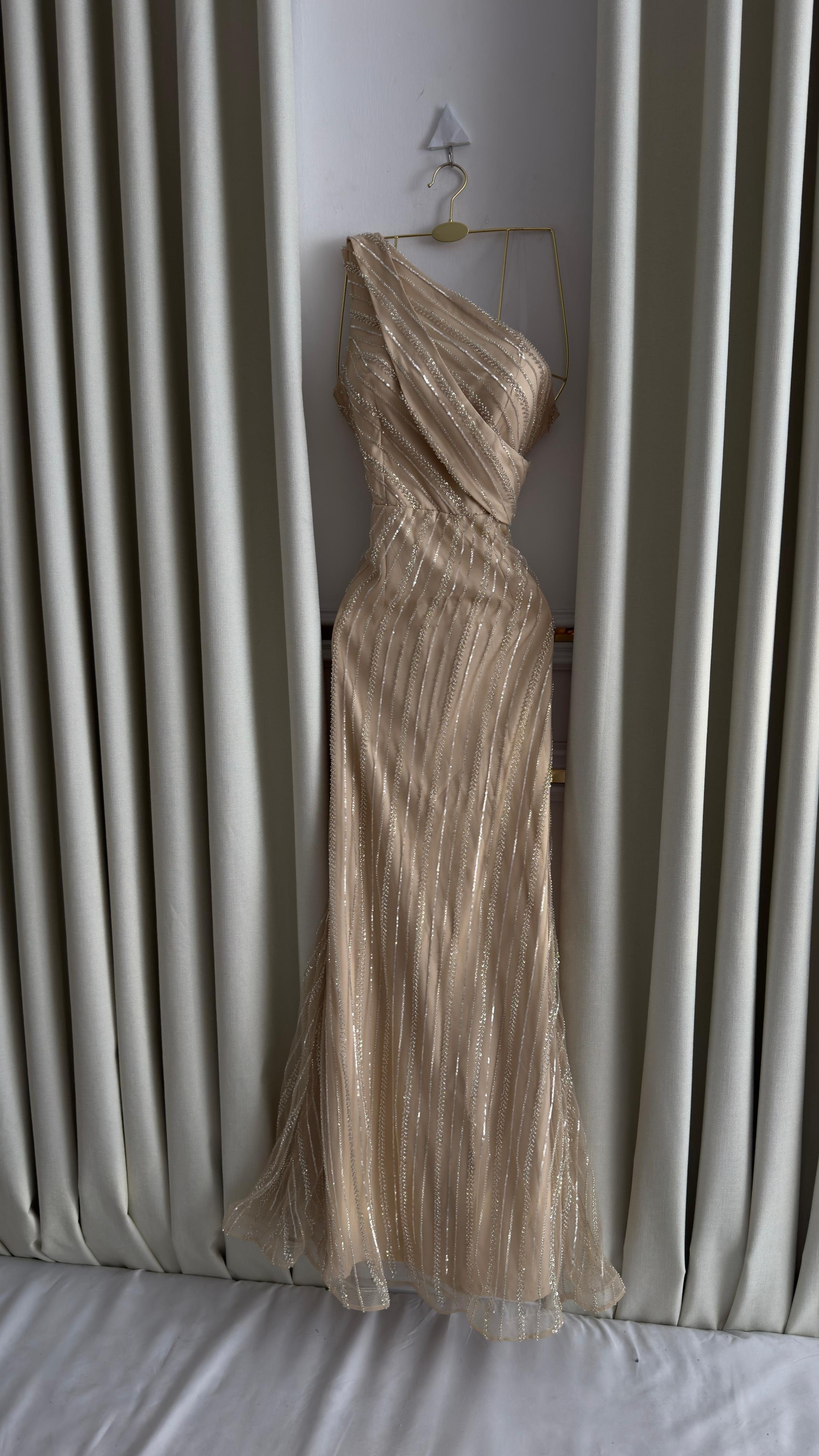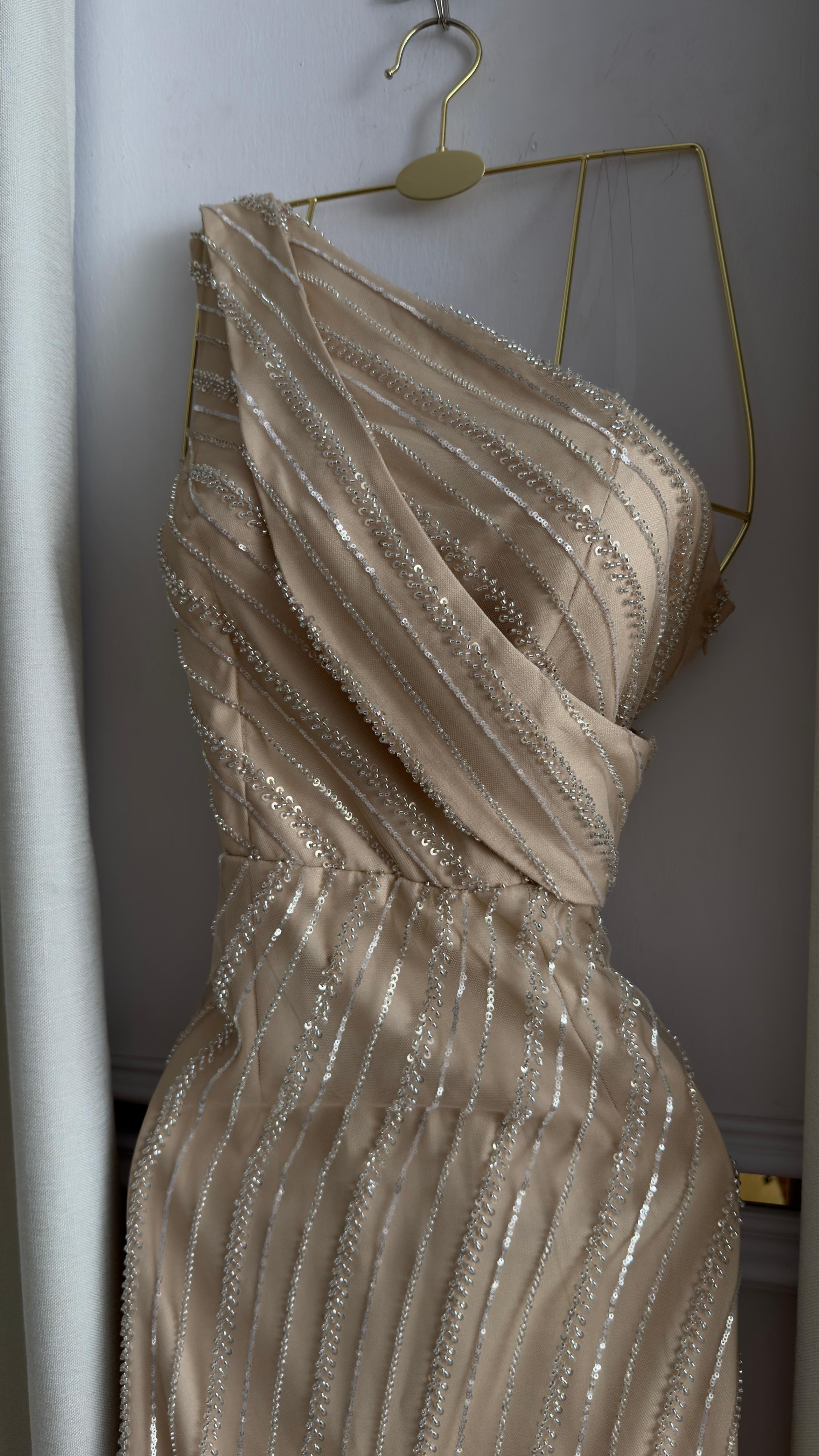 فستان سهرة بيج بتصميم كتف واحد (One Shoulder) يجمع بين الأنوثة والفخامة، مصنوع من قماش شيفون مطرز بخطوط لامعة تضيف إشراقة مميزة مع كل حركة. يتميز بقصّة انسيابية تبرز جمال القوام وتمنحك حضورًا راقيًا في المناسبات الخاصة.