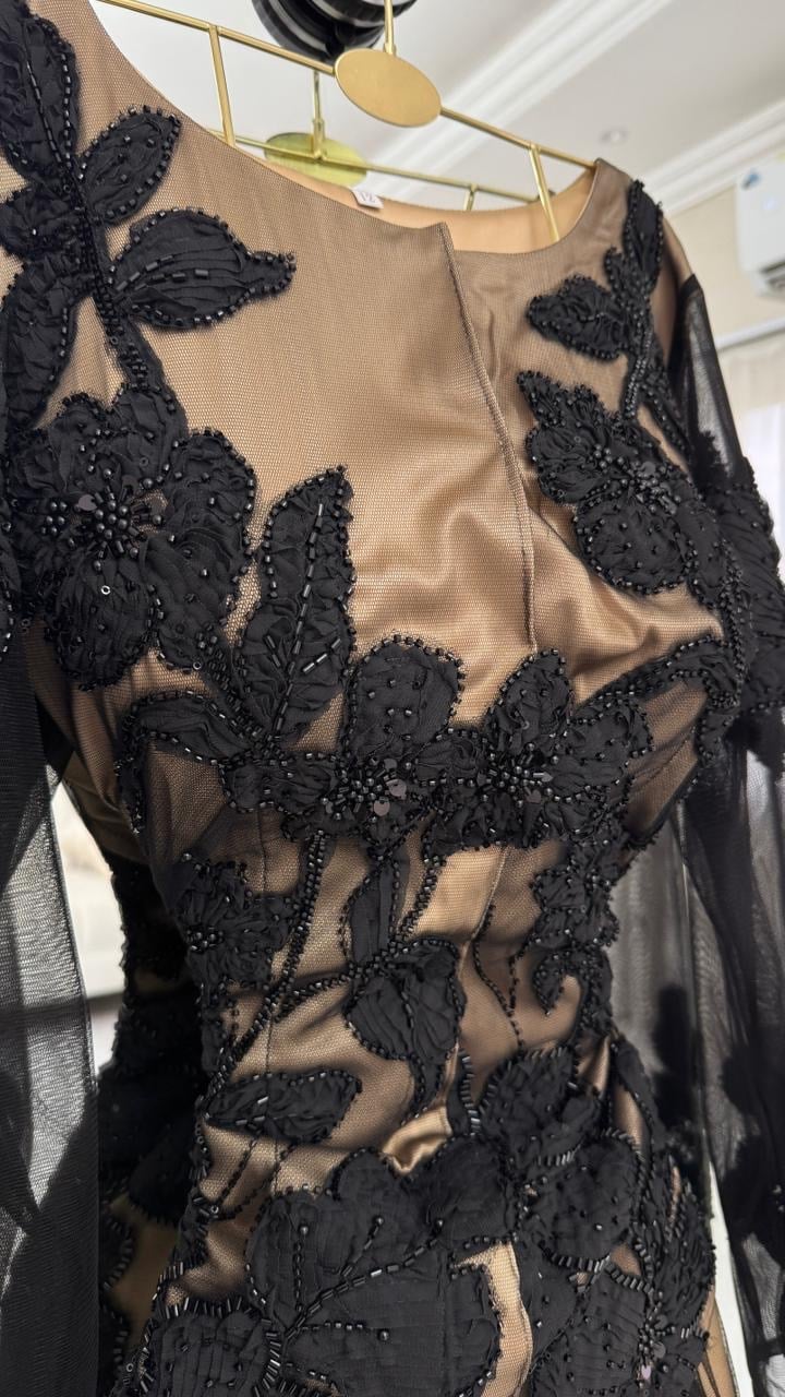 الجزء العلوي يجمع بين الذهبي اللامع وتطريز أسود فاخر يمنح الفستان شخصية من أوّل نظرة.