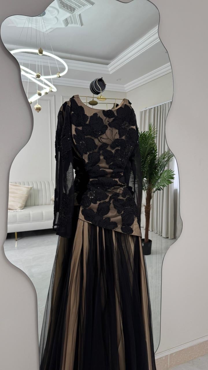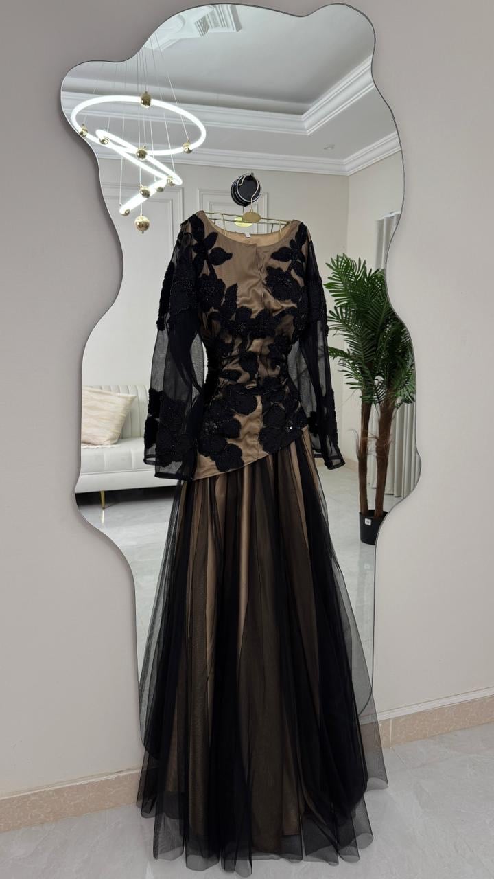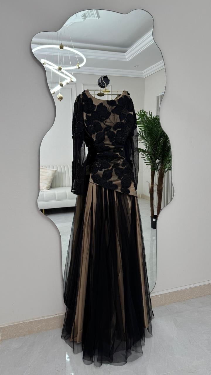 أما تنورة التول الواسعة فهي سر الفخامة—خفيفة، راقية، وتتحرك مع خطواتك بأسلوب ساحر.
