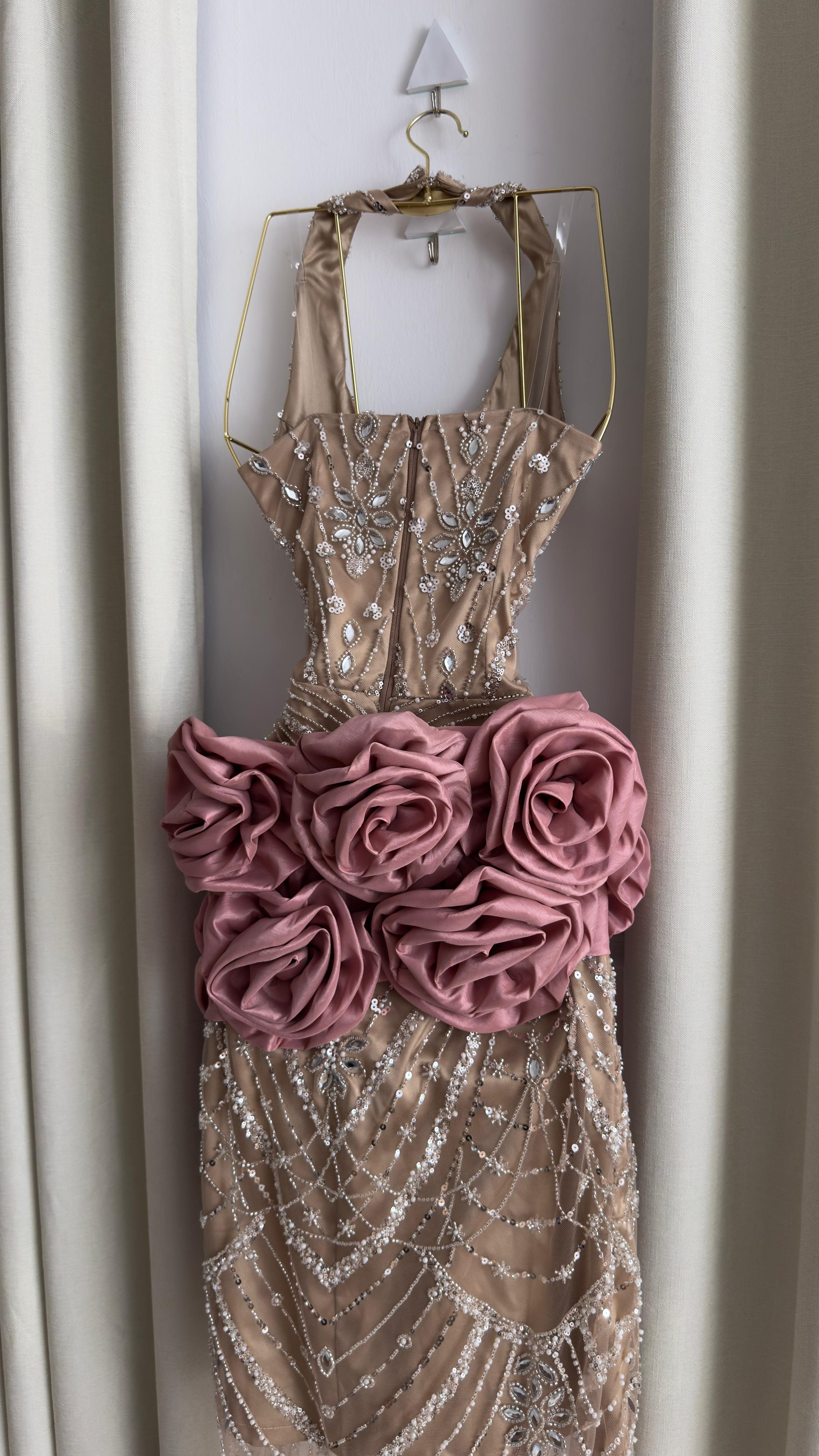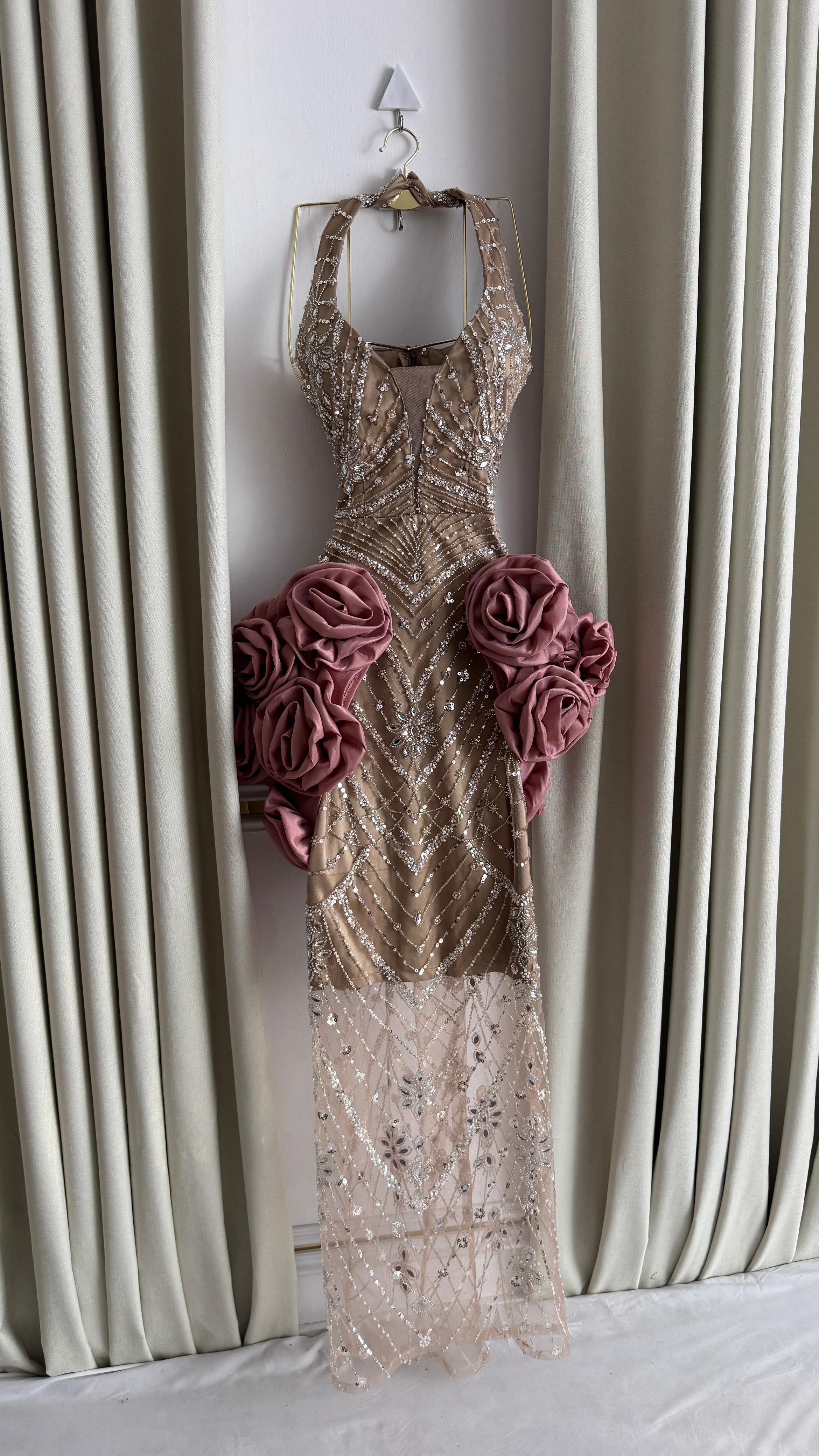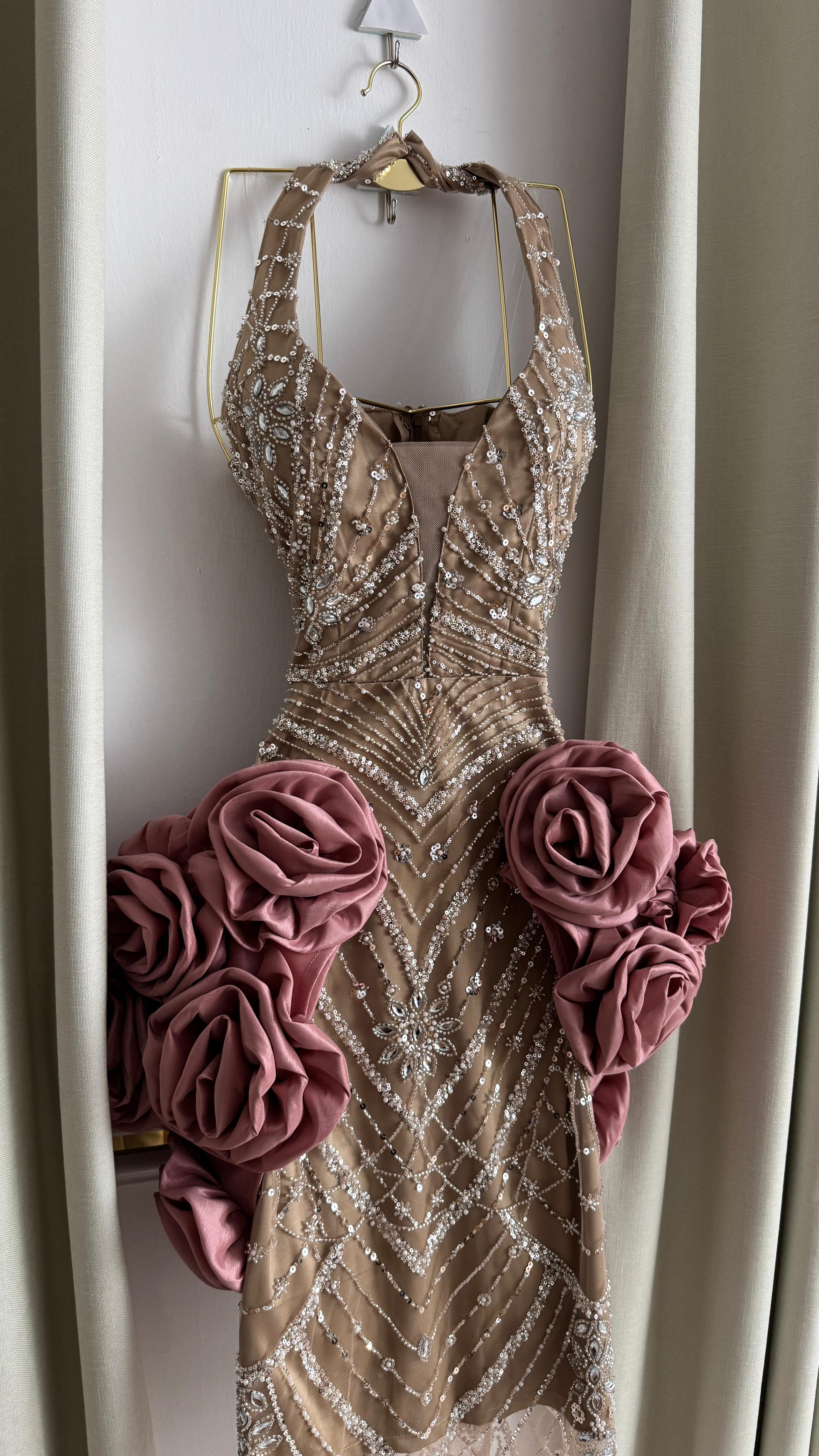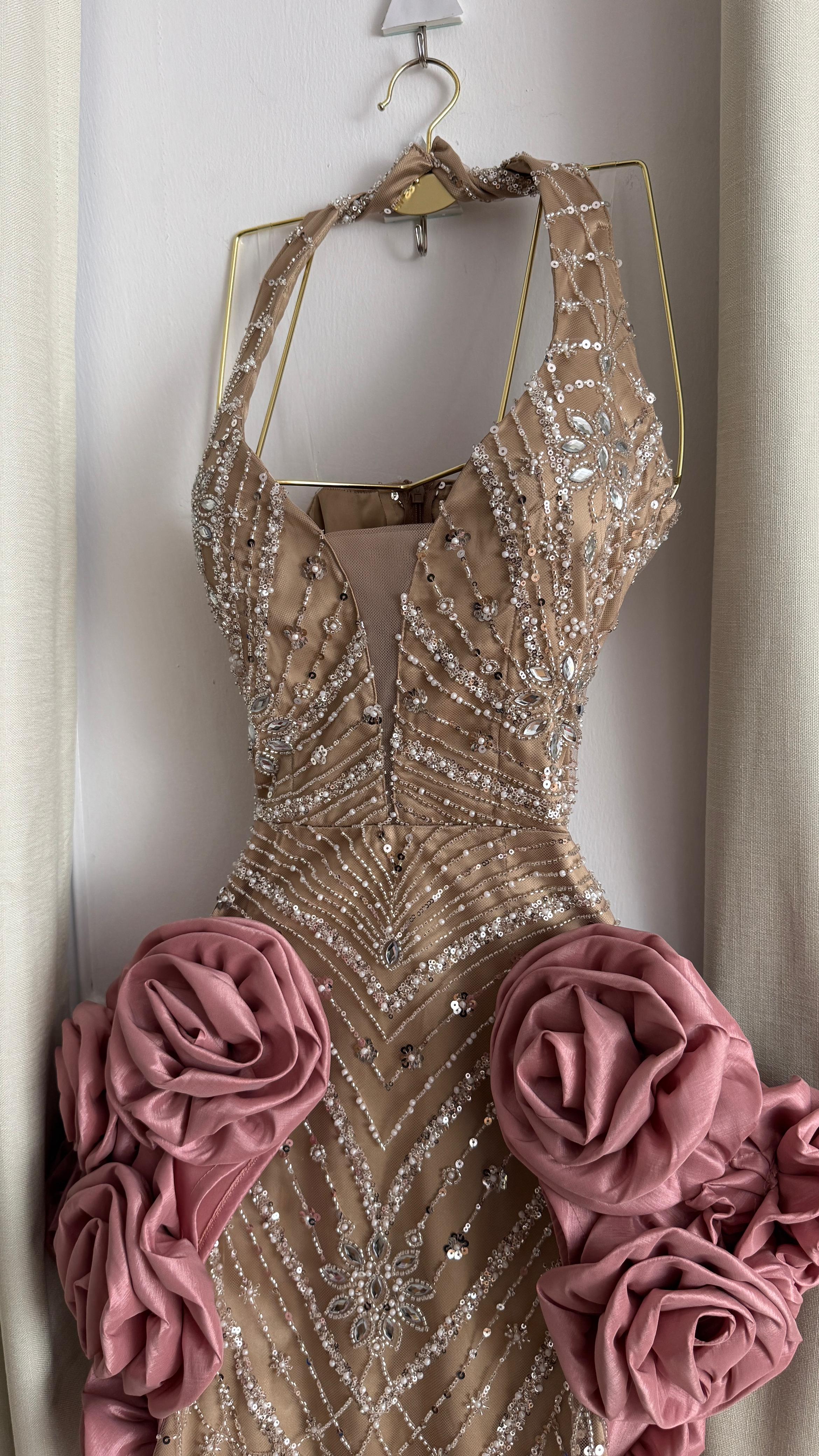 هذا الفستان الذهبي الفاخر يجمع بين الرقي والفخامة بتطريز دقيق من الكريستال المتلألئ الذي يغطي كامل التصميم بانسيابية هندسية راقية. يتميز الفستان بقصة هالتر (Halter Neck) مع فتحة صدر جريئة تمنح حضورًا أنثويًا قويًا، فيما تعزز القصة الضيقة جمال القوام وتمنحك إطلالة ملكية آسرة.