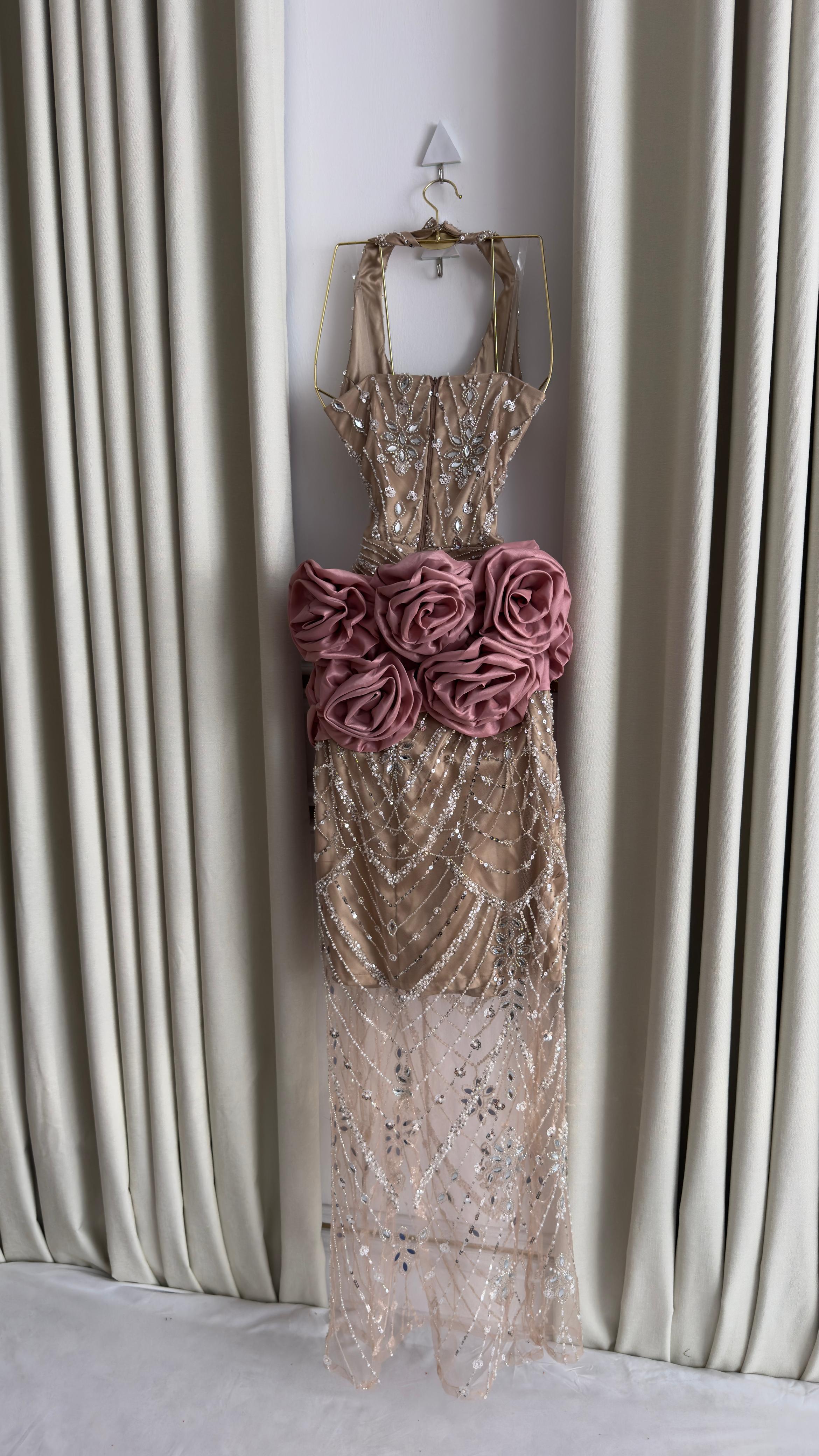 إضافة الأزهار الكبيرة على الذراعين تخلق لمسة رومانسية ساحرة، لتكوني محط أنظار الجميع في أي مناسبة راقية. هذا الفستان خيار مثالي للحفلات الفاخرة، الخطوبات، أو المناسبات الكبرى.