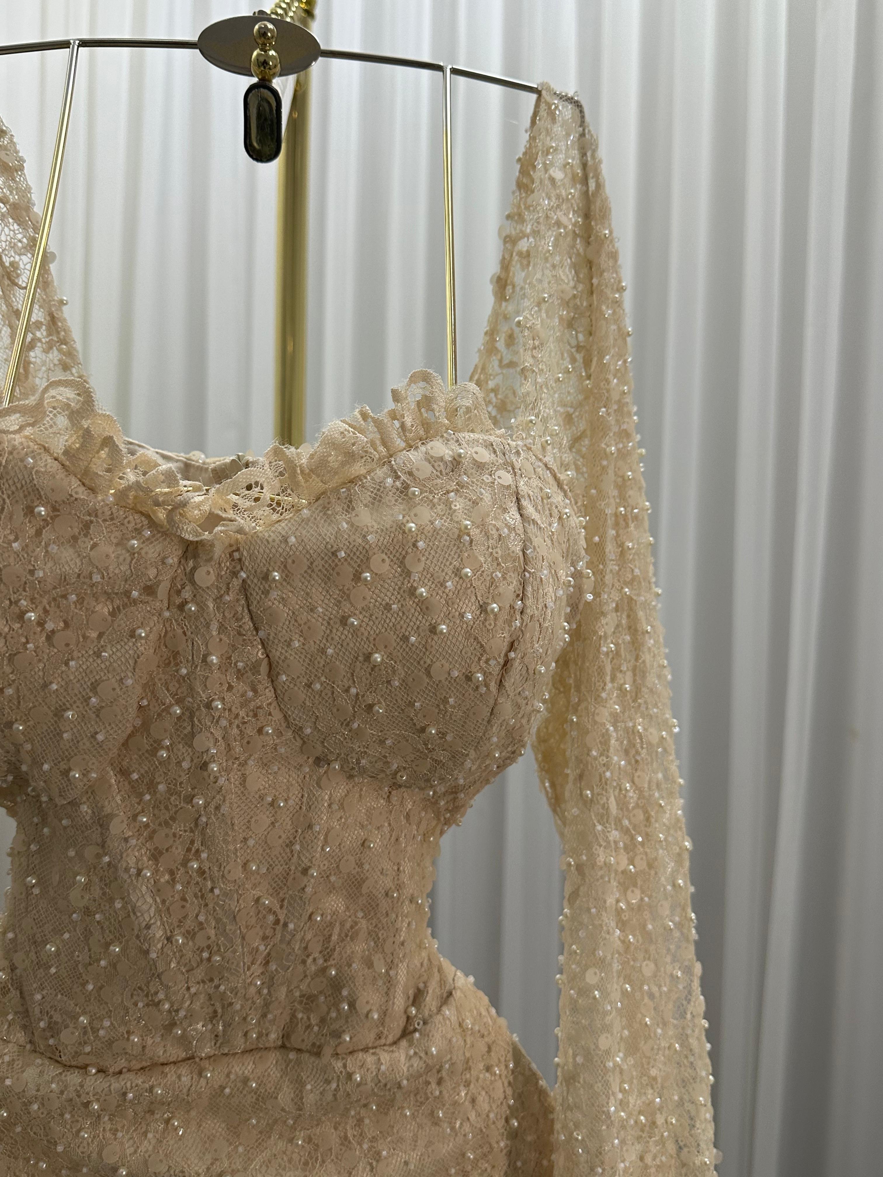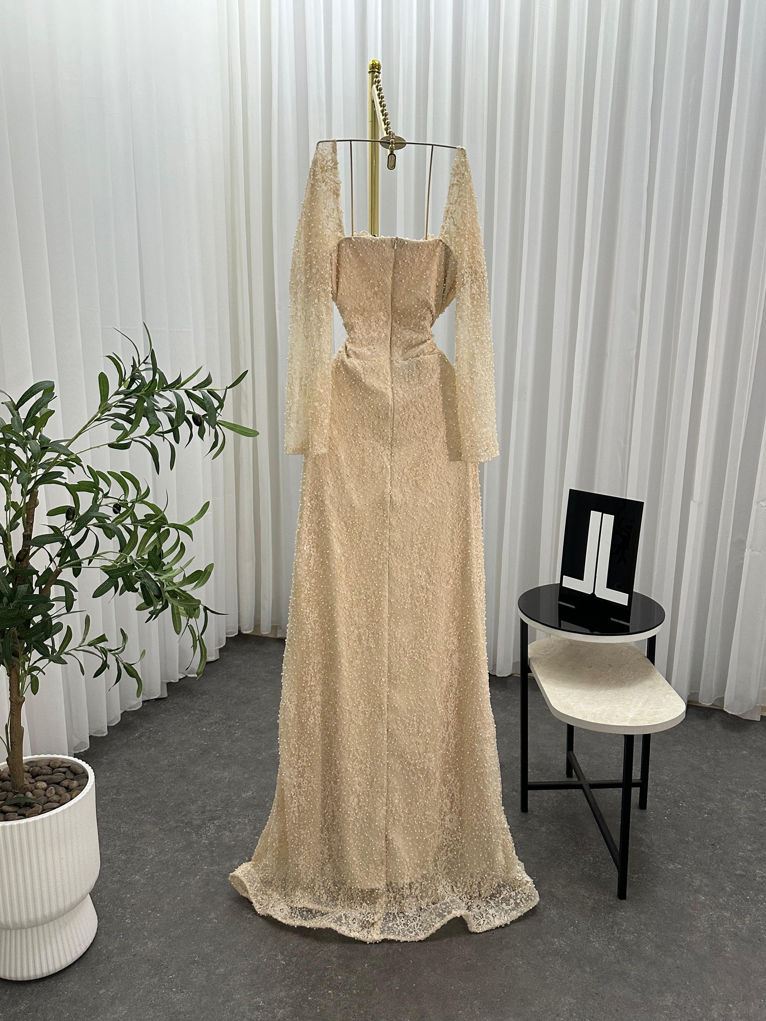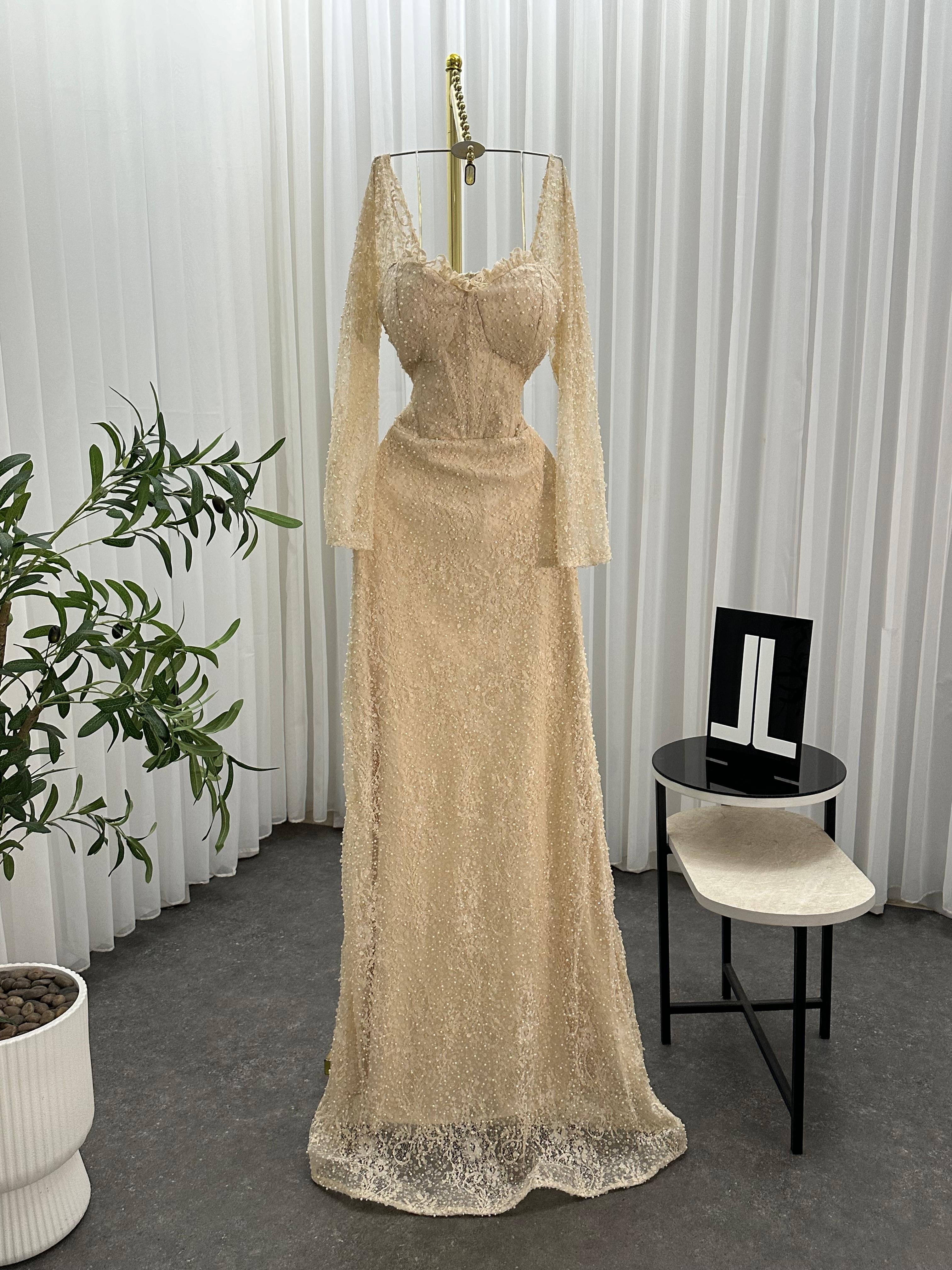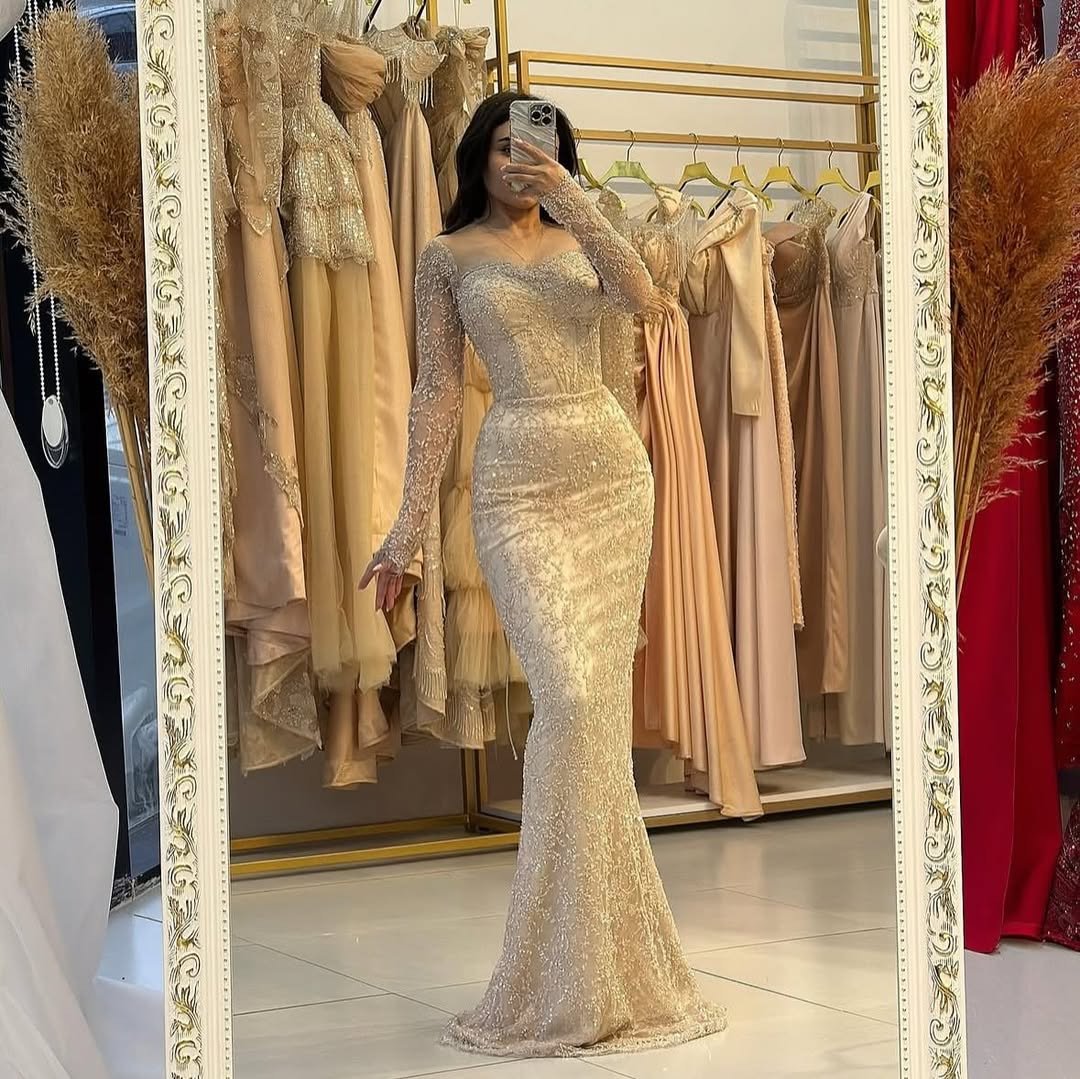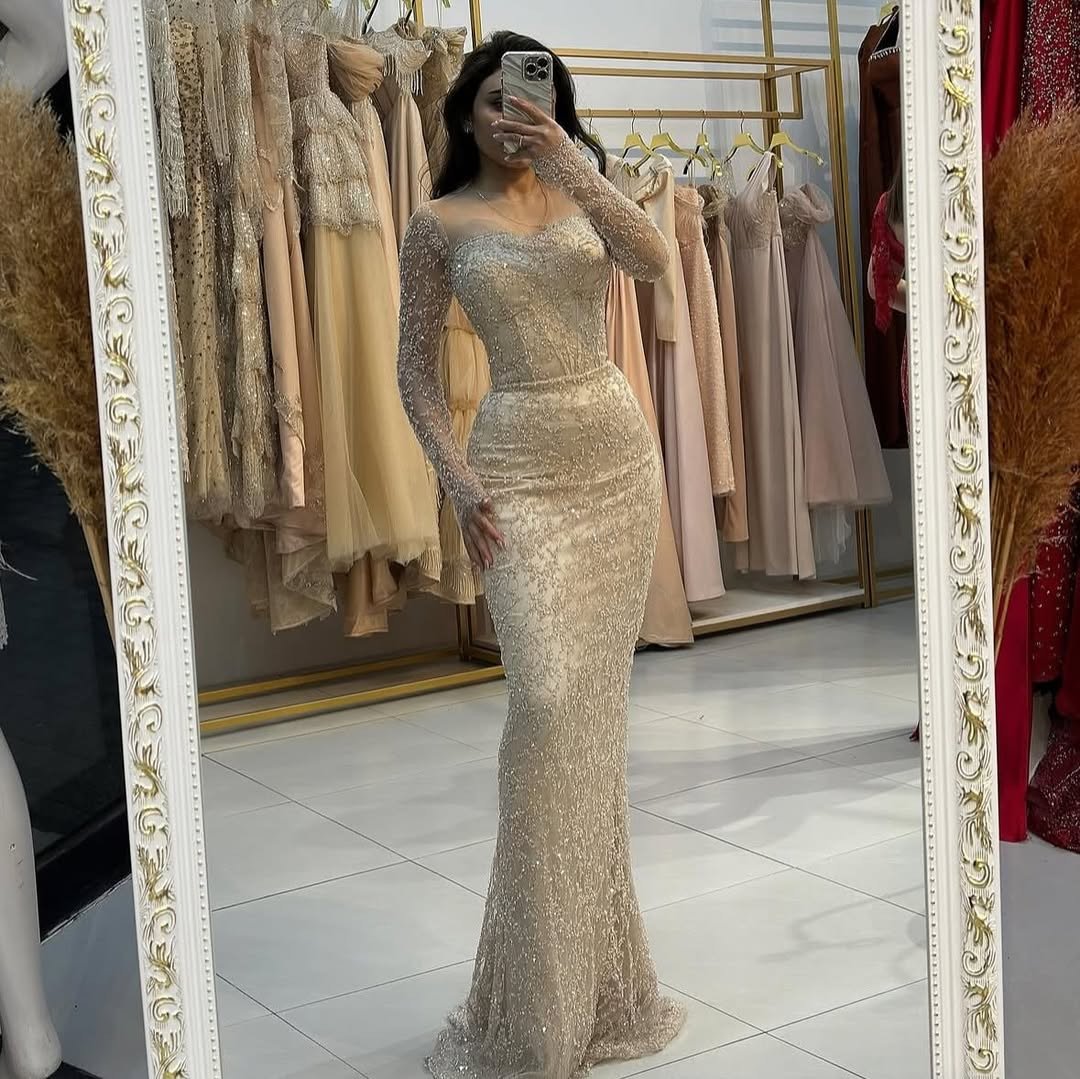 فستان سهرة ذهبي أنيق بتصميم ضيق يبرز القوام، مزين بترتر لامع وأكمام طويلة شفافة لإطلالة راقية ومميزة في المناسبات