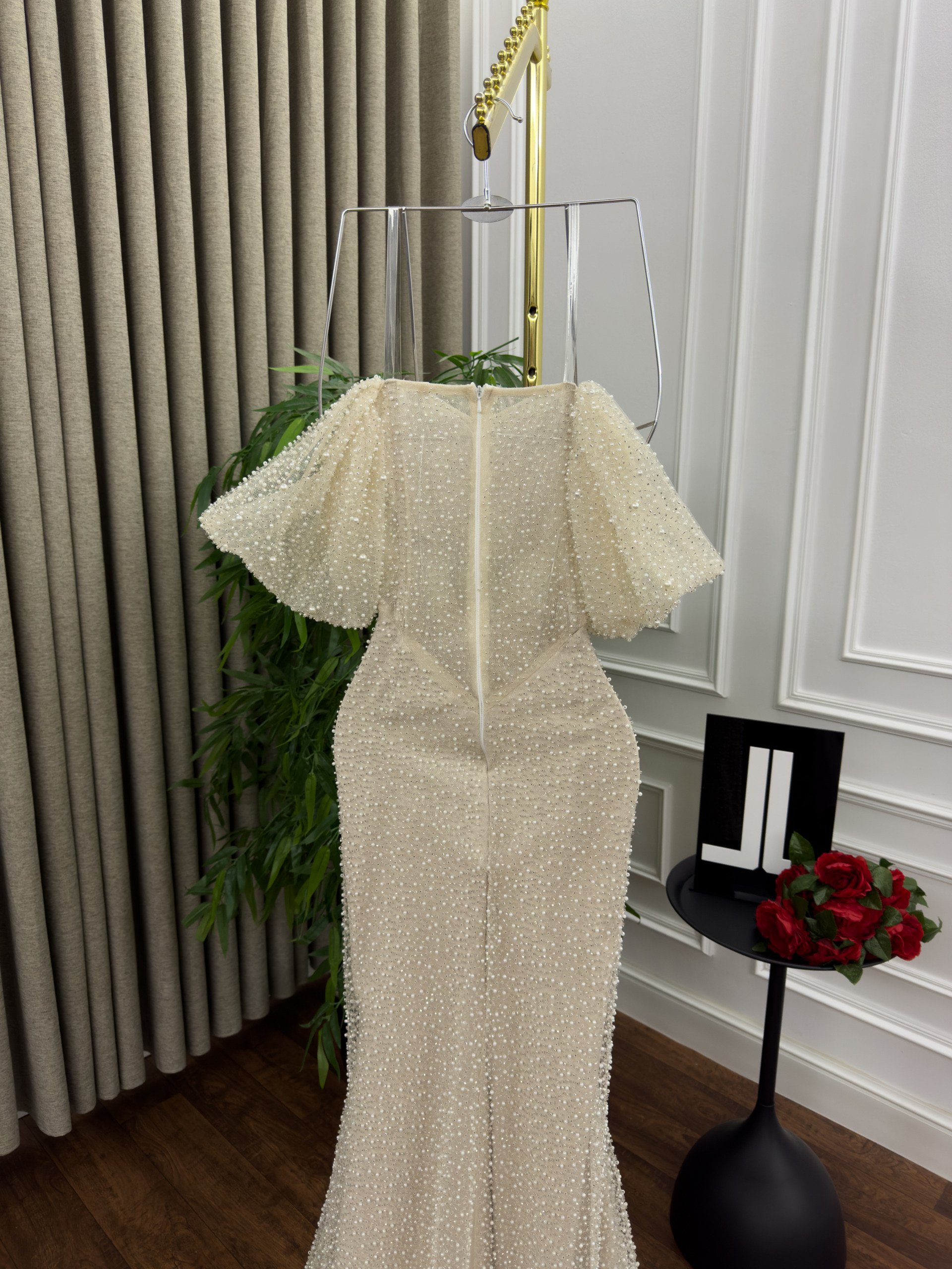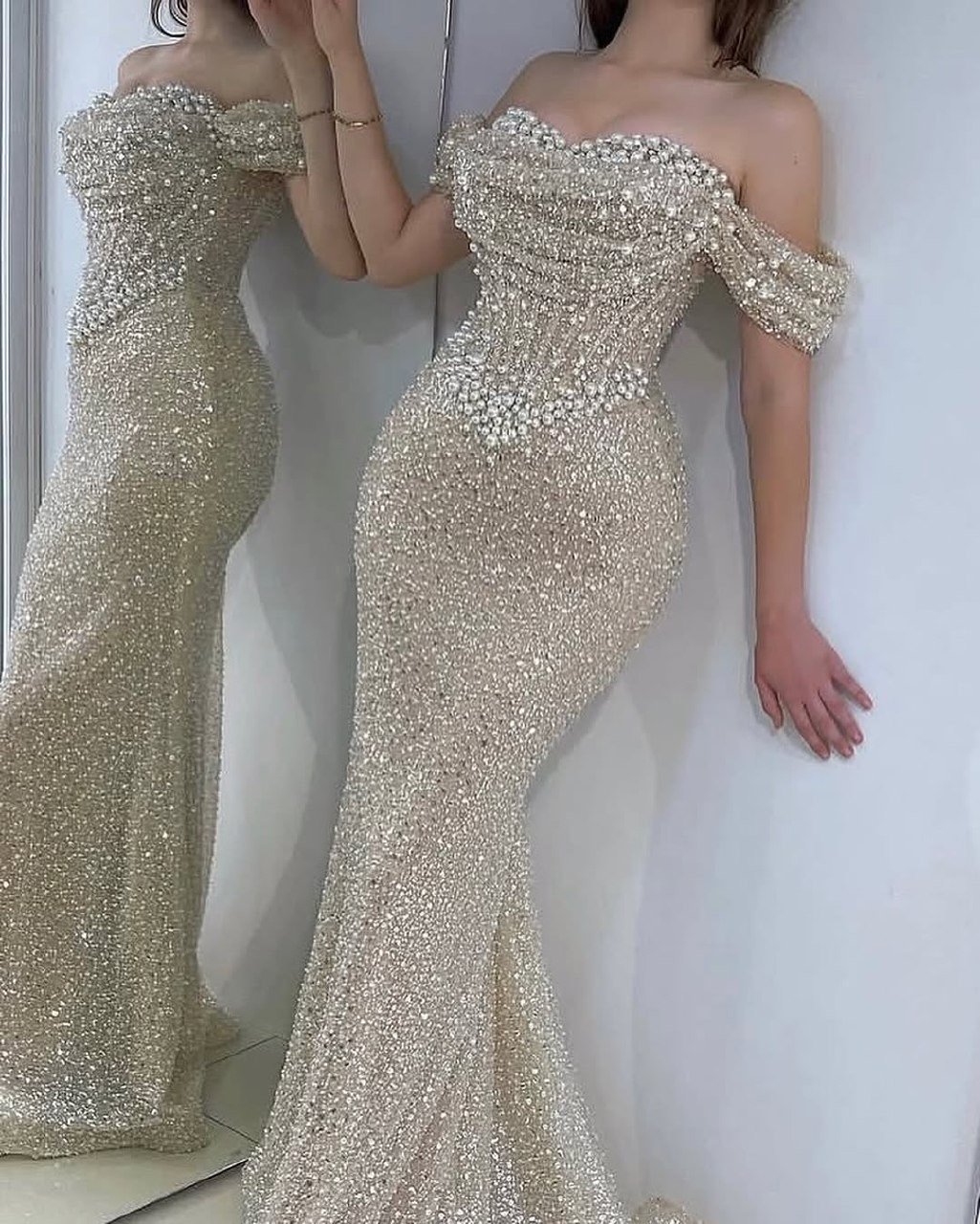 فستان سهرة ملكي باللون الذهبي الفاخر، مزين بالكامل باللؤلؤ والكريستالات اللامعة ليمنحك إطلالة تخطف الأنظار. التصميم الأوف شولدر يبرز جمال الكتفين ويجمع بين الفخامة والأنوثة، فيما ينسدل الفستان بقصة ضيقة تحدد القوام وتمنح مظهراً أنثوياً أنيقاً. خيار مثالي للمناسبات الراقية وحفلات المساء المميزة.
