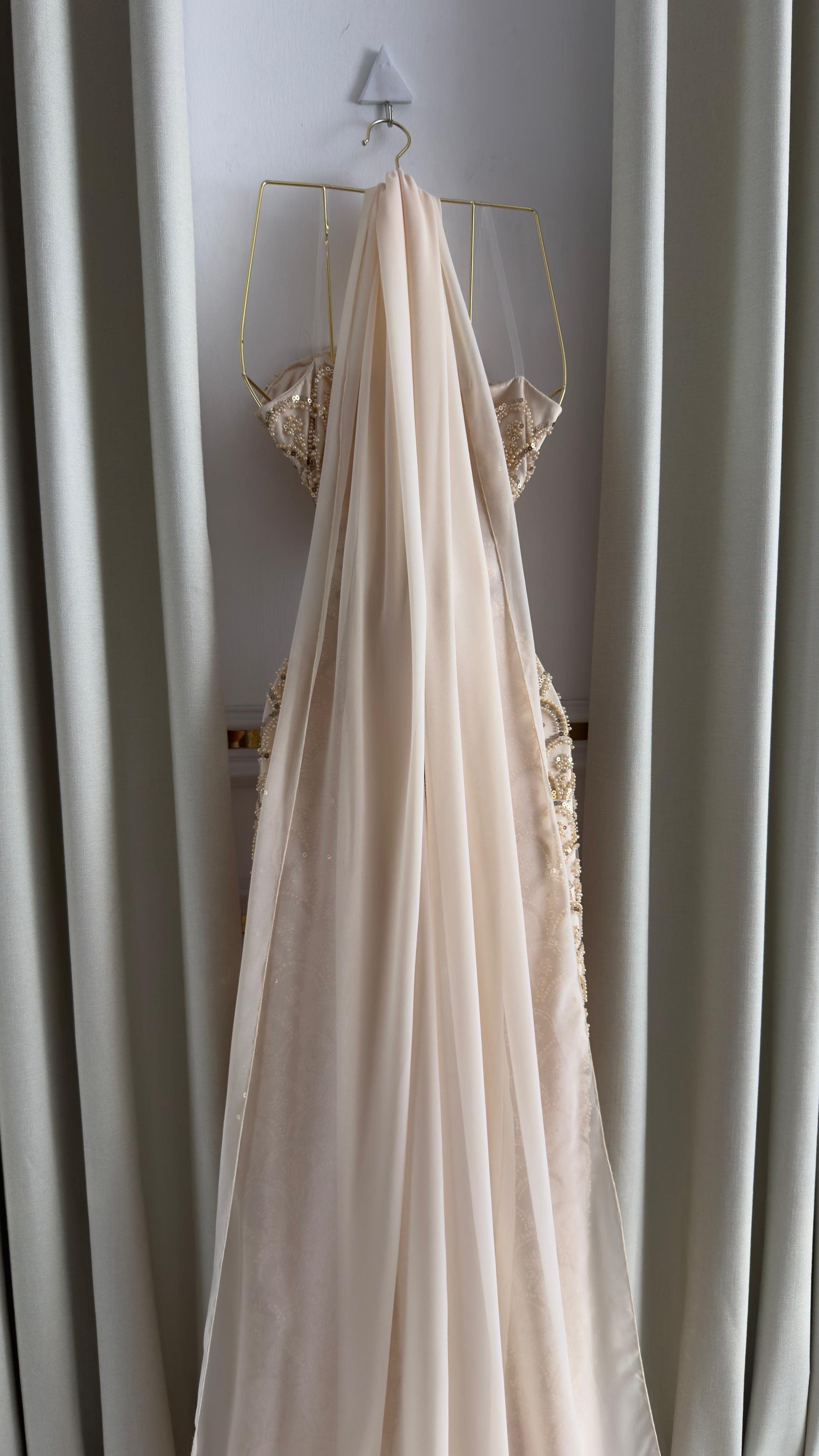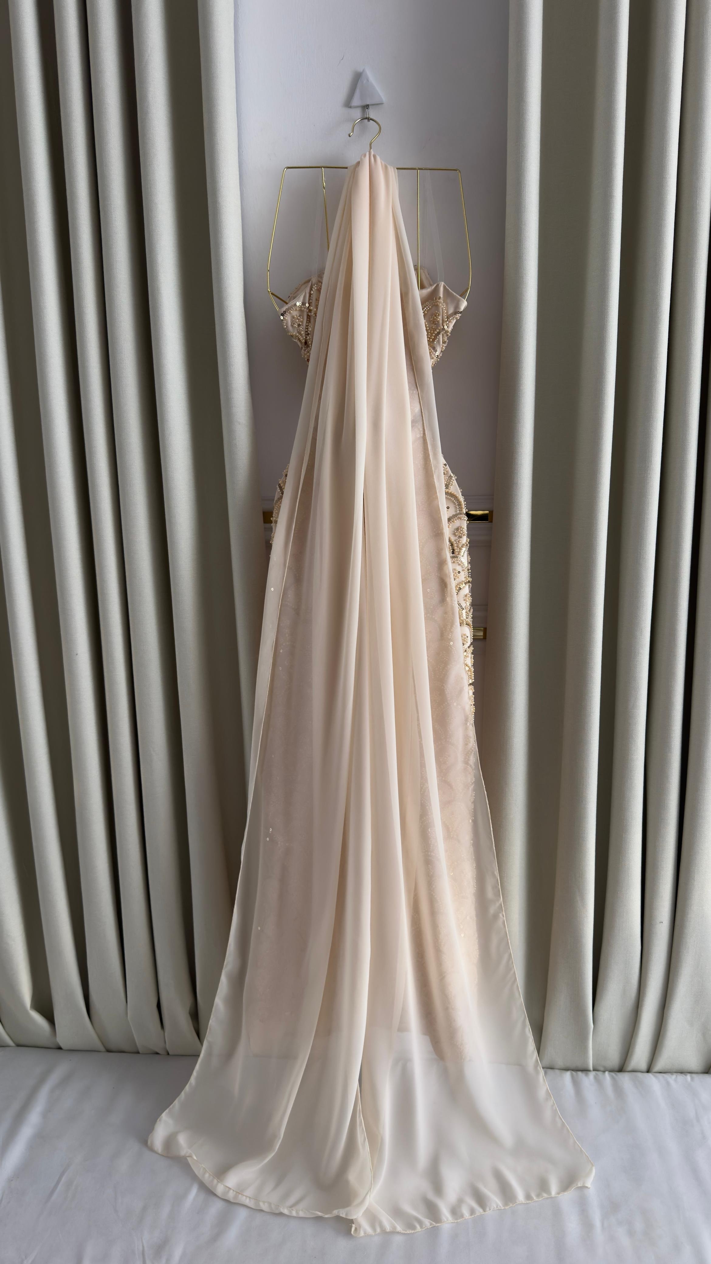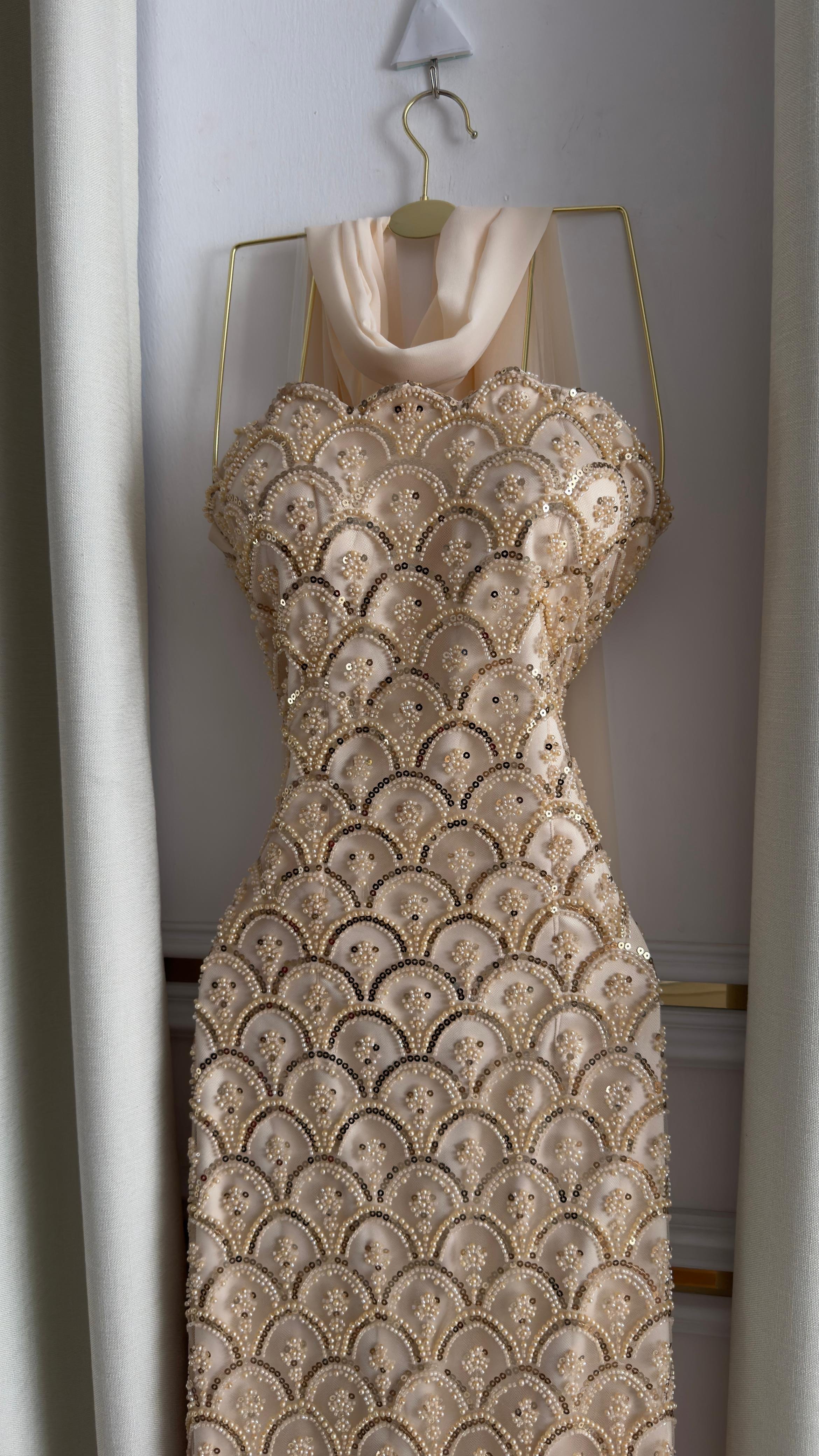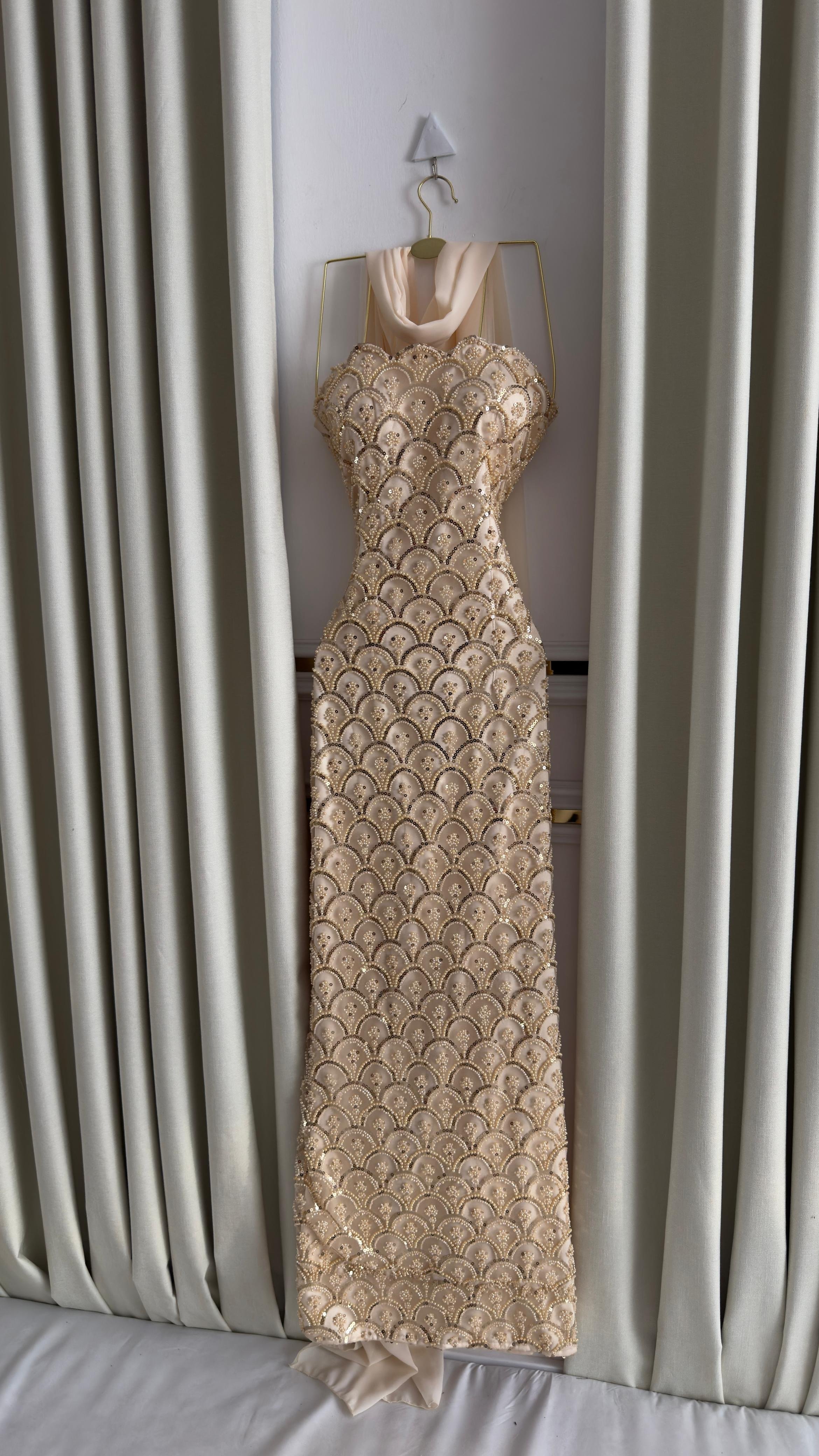 فستان سهرة أنيق باللون الذهبي المشرق، يتميز بقصة ضيقة تبرز جمال القوام، مع تفاصيل مطرزة بتطريزات لامعة على شكل أقواس متناسقة تمنحه لمسة فاخرة وراقية. التصميم مزود بياقة شفافة تنسدل برقة لإضافة جاذبية أنثوية ناعمة.