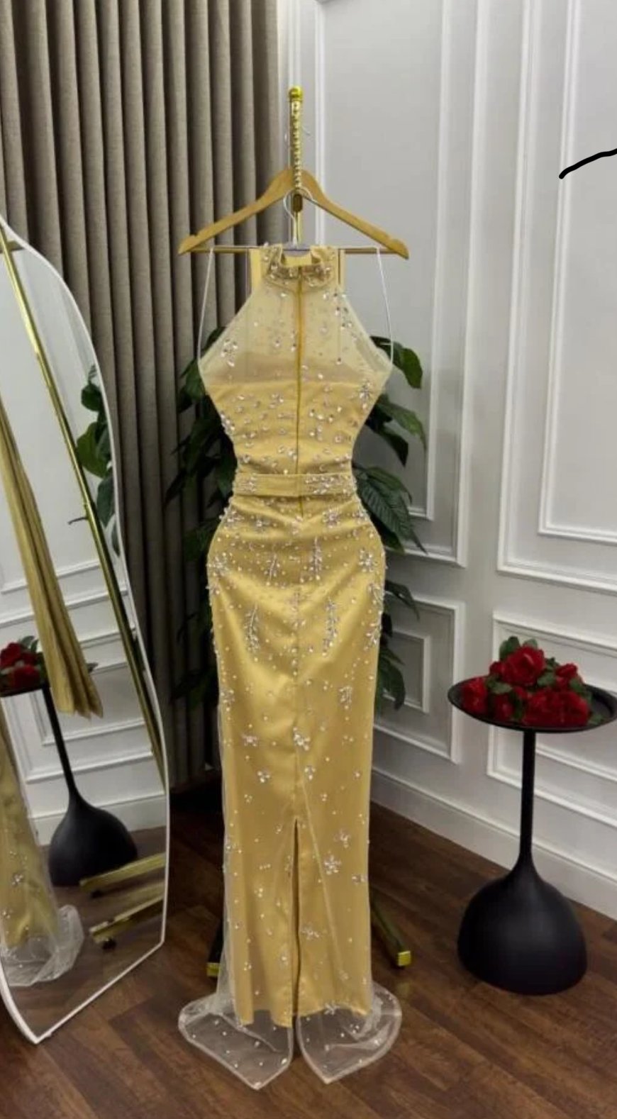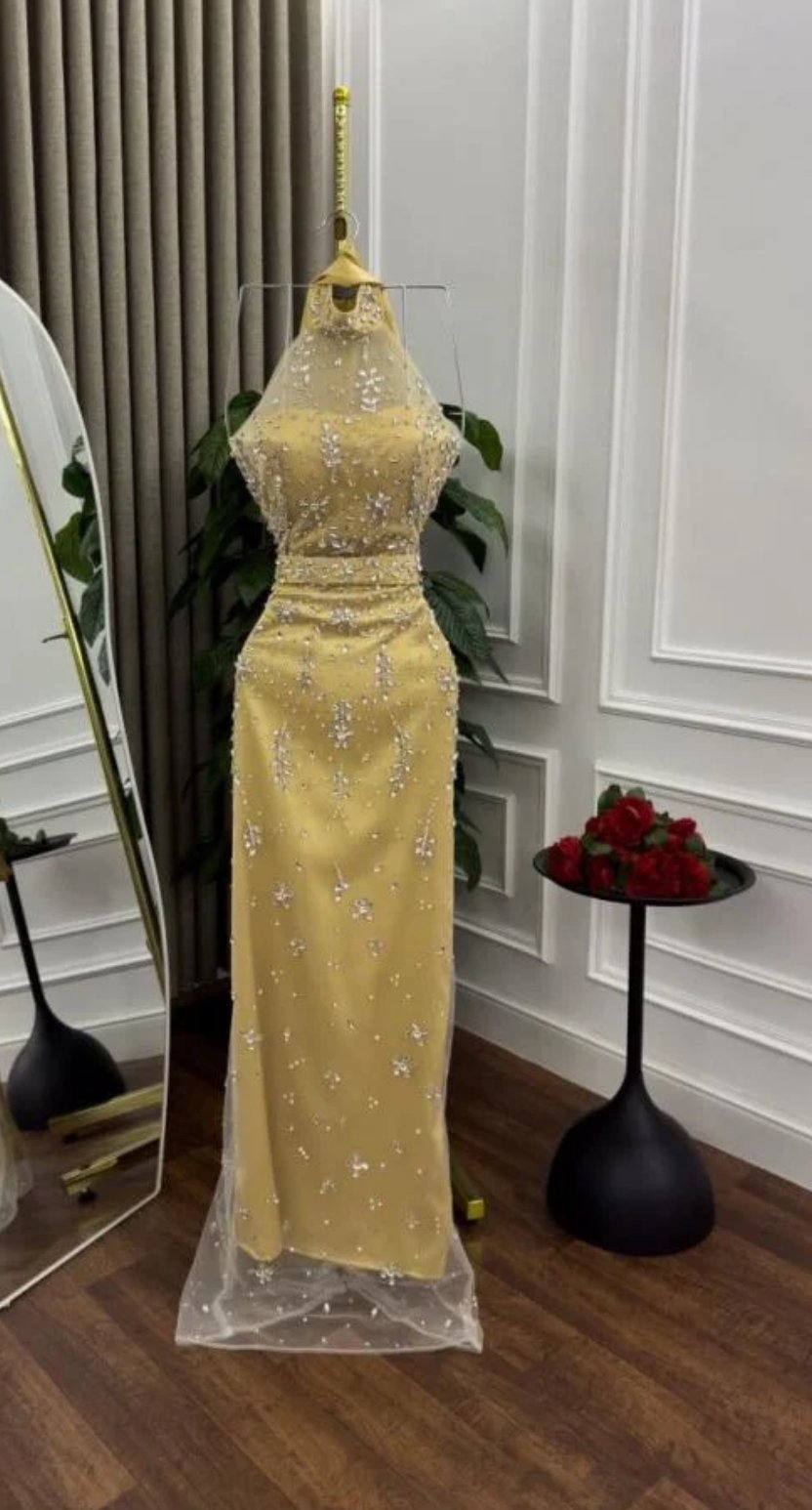 فستان سهرة ملكي باللون الأصفر الذهبي، يتميز بتطريز يدوي فاخر بالكريستال اللامع من الأعلى إلى الأسفل، مع ياقة عالية أنيقة تضفي لمسة راقية. يأتي مع شال انسيابي بنفس اللون ليزيد الإطلالة فخامة. تصميمه الضيق يبرز القوام بأسلوب أنثوي ساحر، ليمنحك حضوراً يخطف الأنظار في السهرات والمناسبات الخاصة