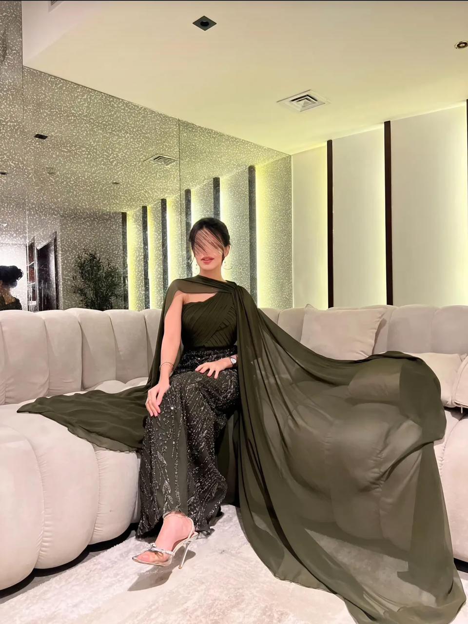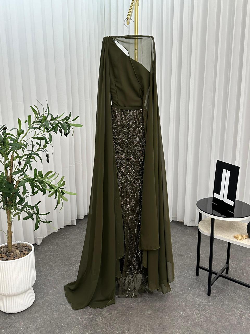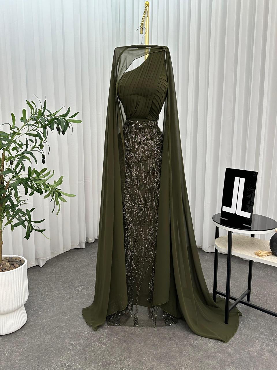 فخامة الطبيعة تتجسد في هذا الفستان الأخضر الملكي! تصميم ضيق مطرز بالكامل بكريستالات براقة، مع كاب طويل شفاف ينسدل من الأكتاف ليضفي حضورًا دراميًا راقيًا. لمسة ناعمة تجمع بين الأناقة والجرأة في آن تنسيق الإكسسوارات المقترحة: