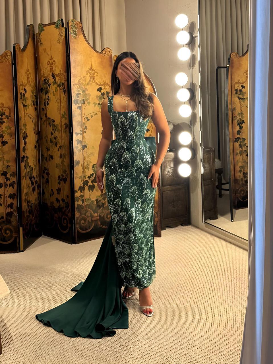 تألقي بسحر الغابات وإشراقة الماس مع هذا الفستان الأخضر الفاخر، المصمم بتطريز لامع بتدرجات أنيقة تحاكي أوراق الشجر. القصة الضيقة تُبرز القوام بشكل أنثوي، أما الذيل الطويل من الخلف فيضفي لمسة ملكية آسرة تجعل حضورك متفردًا في كل سهرة.