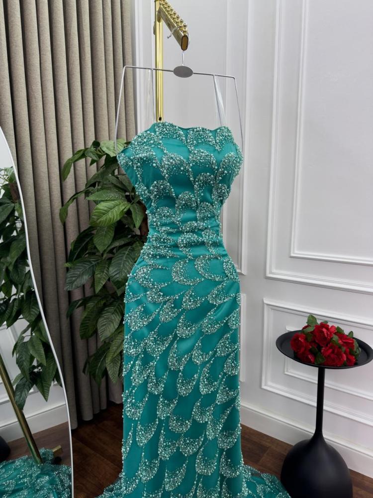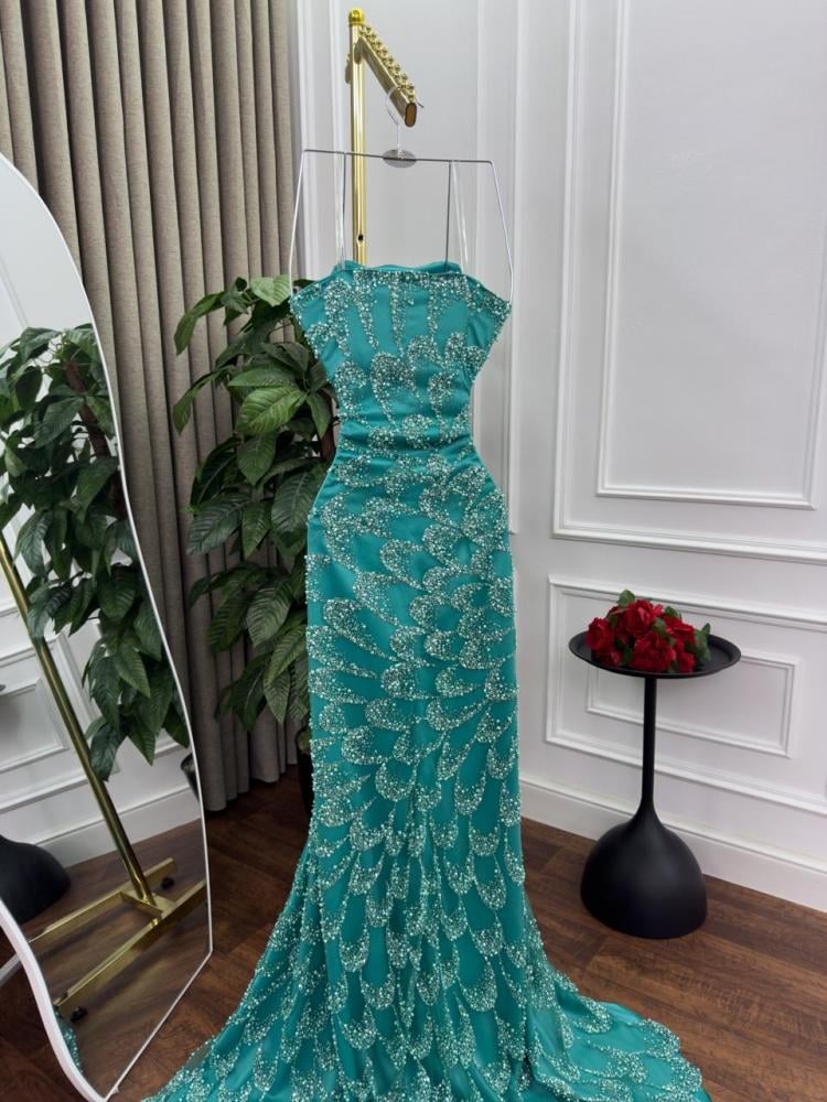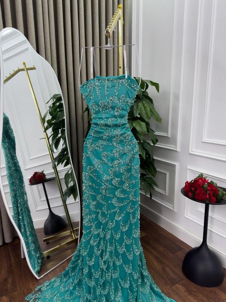 يتميز هذا الفستان الأخضر الطويل بتصميمه الفخم الذي يجمع بين الجرأة والرقي. القصة الضيقة تبرز جمال القوام بانسيابية، بينما يغطي التطريز المطرز بالترتر اللامع كامل الفستان بنقوش متكررة أشبه بالقشور المتلألئة، ما يمنحه لمسة فاخرة تخطف الأنظار.