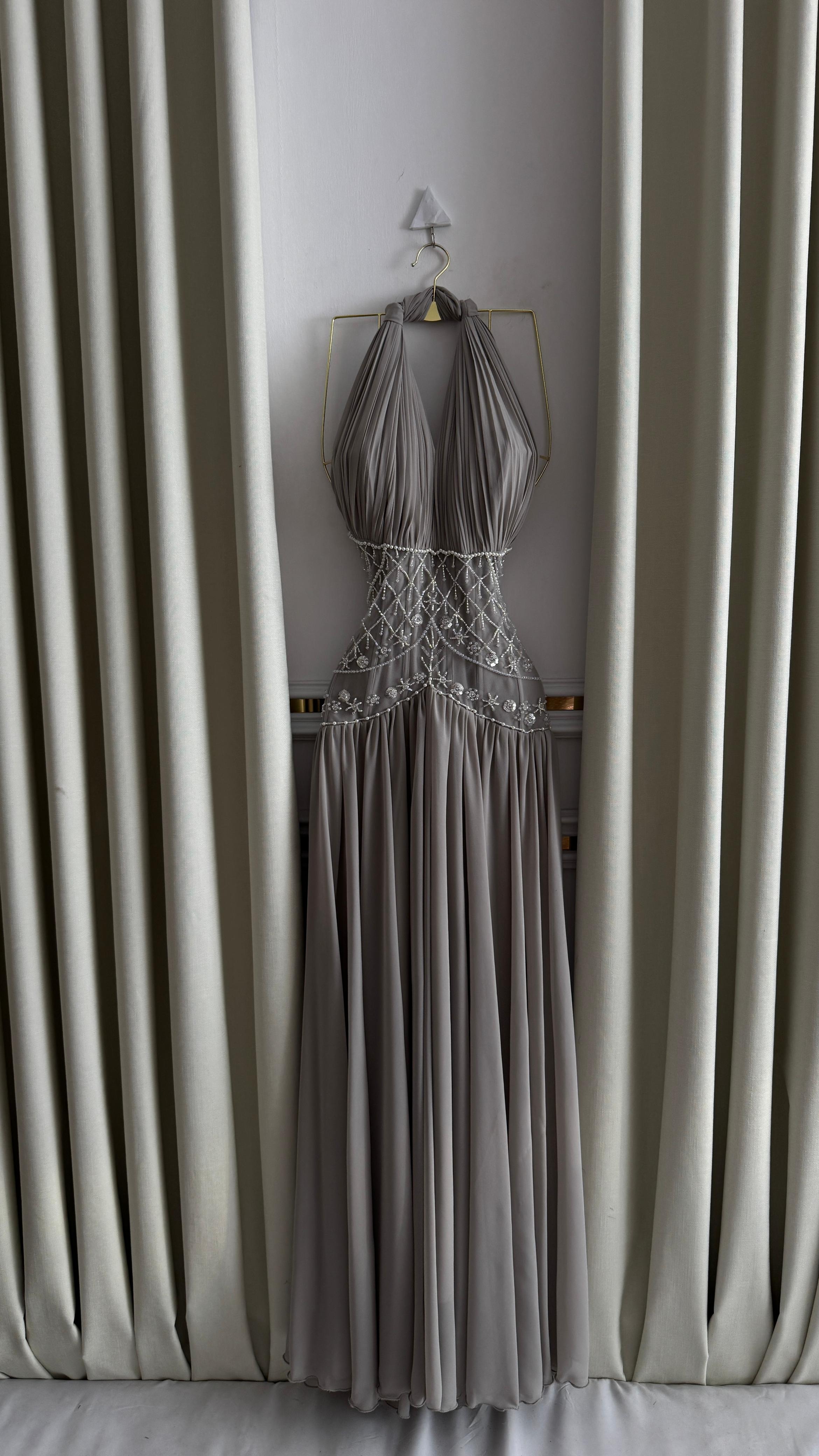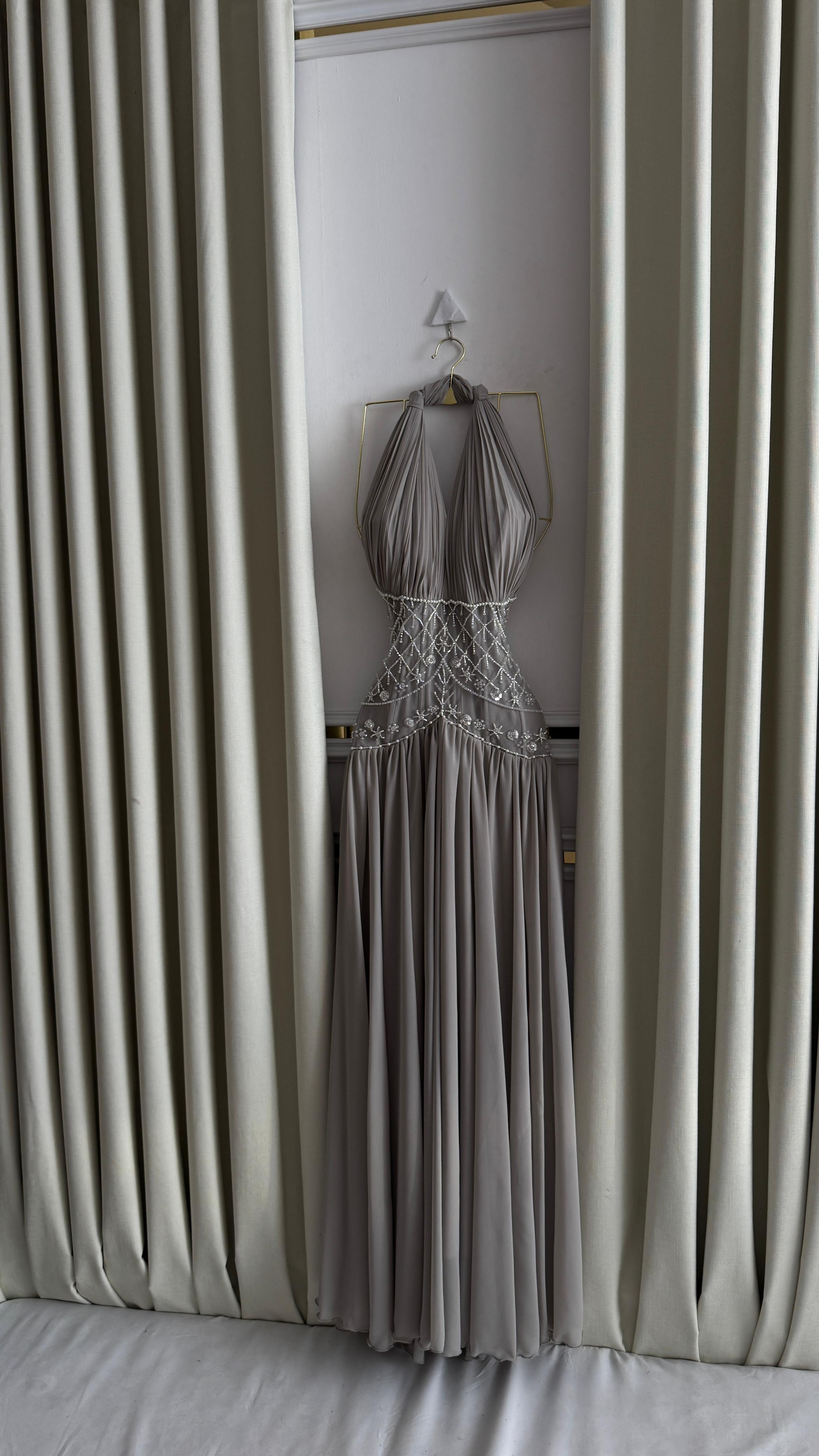 فستان سهرة رمادي بتصميم هالتر ناعم يخطف العين من أول نظرة.